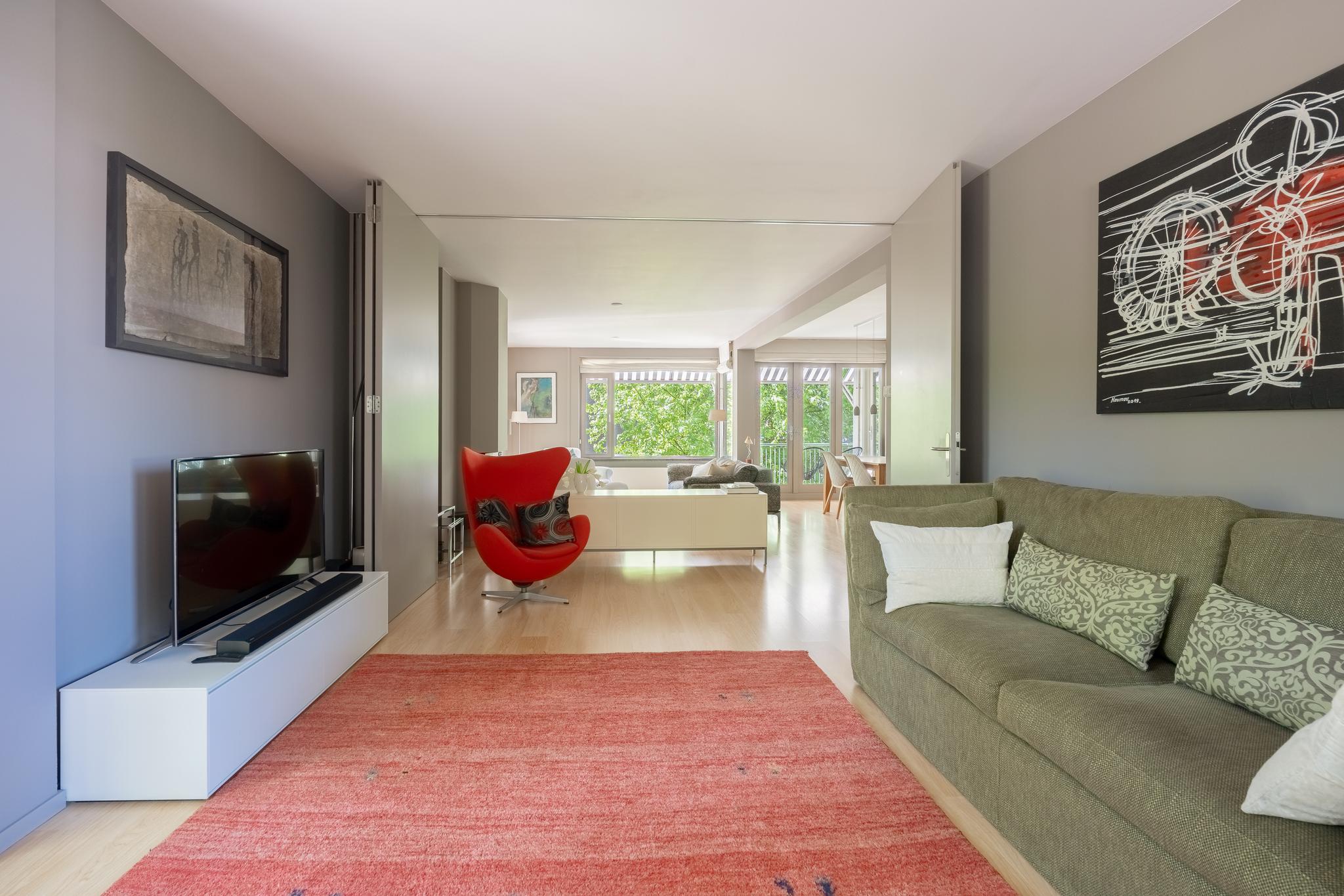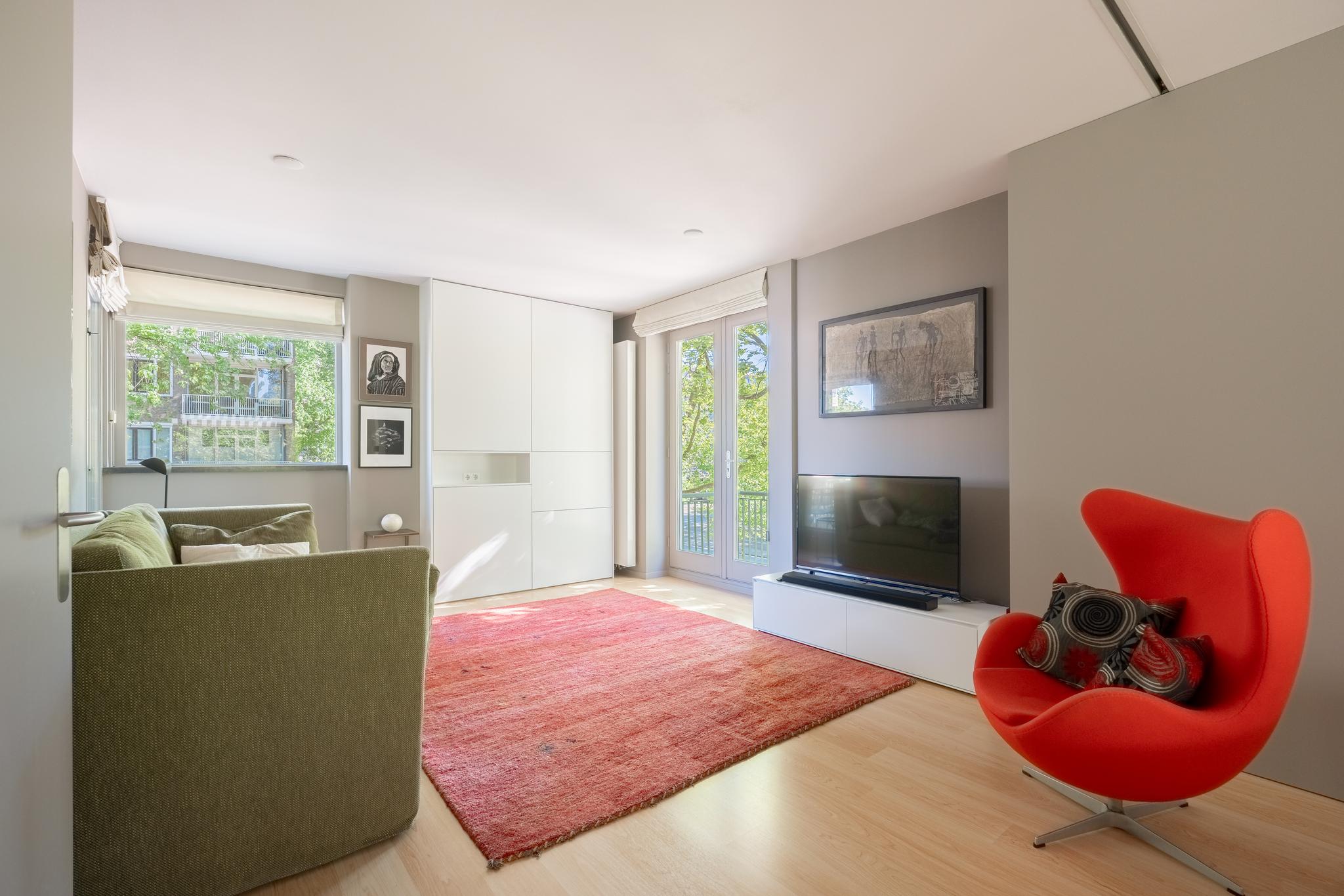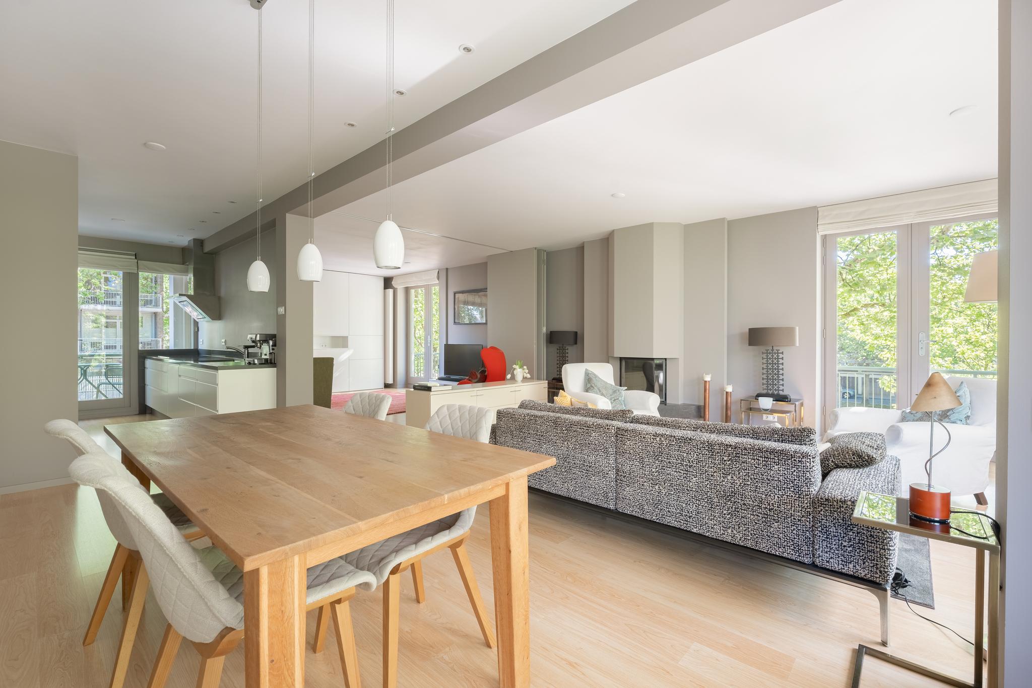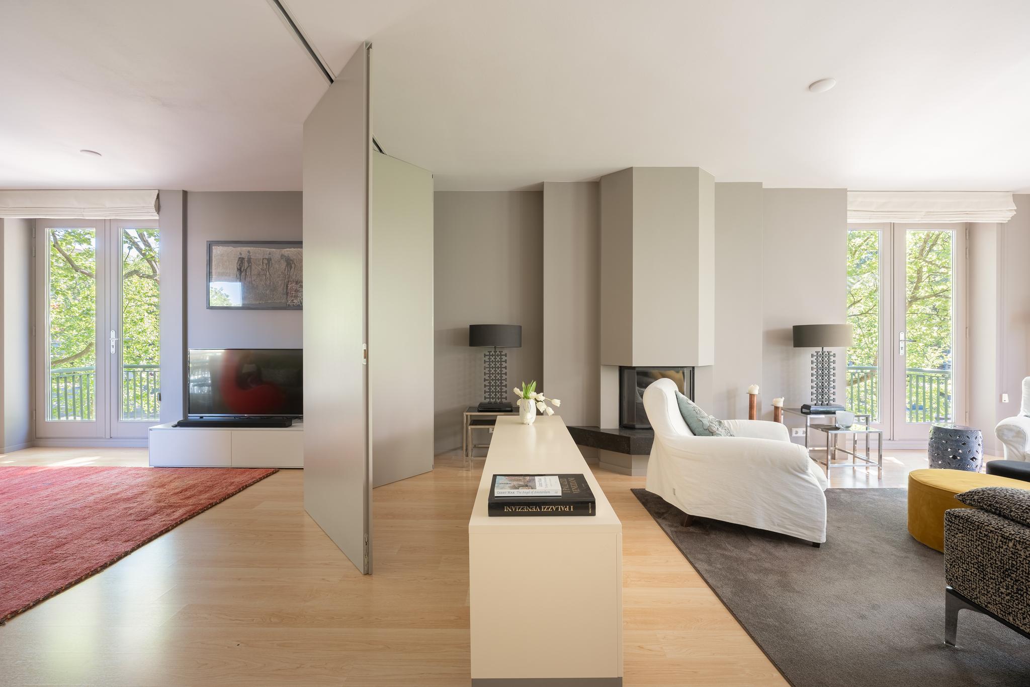 The spacious and bright living room with original (wood) fireplace provides access to three balconies and is surrounded by greenery. A smart sliding wall in the living room allows for the creation of a second (large) bedroom.