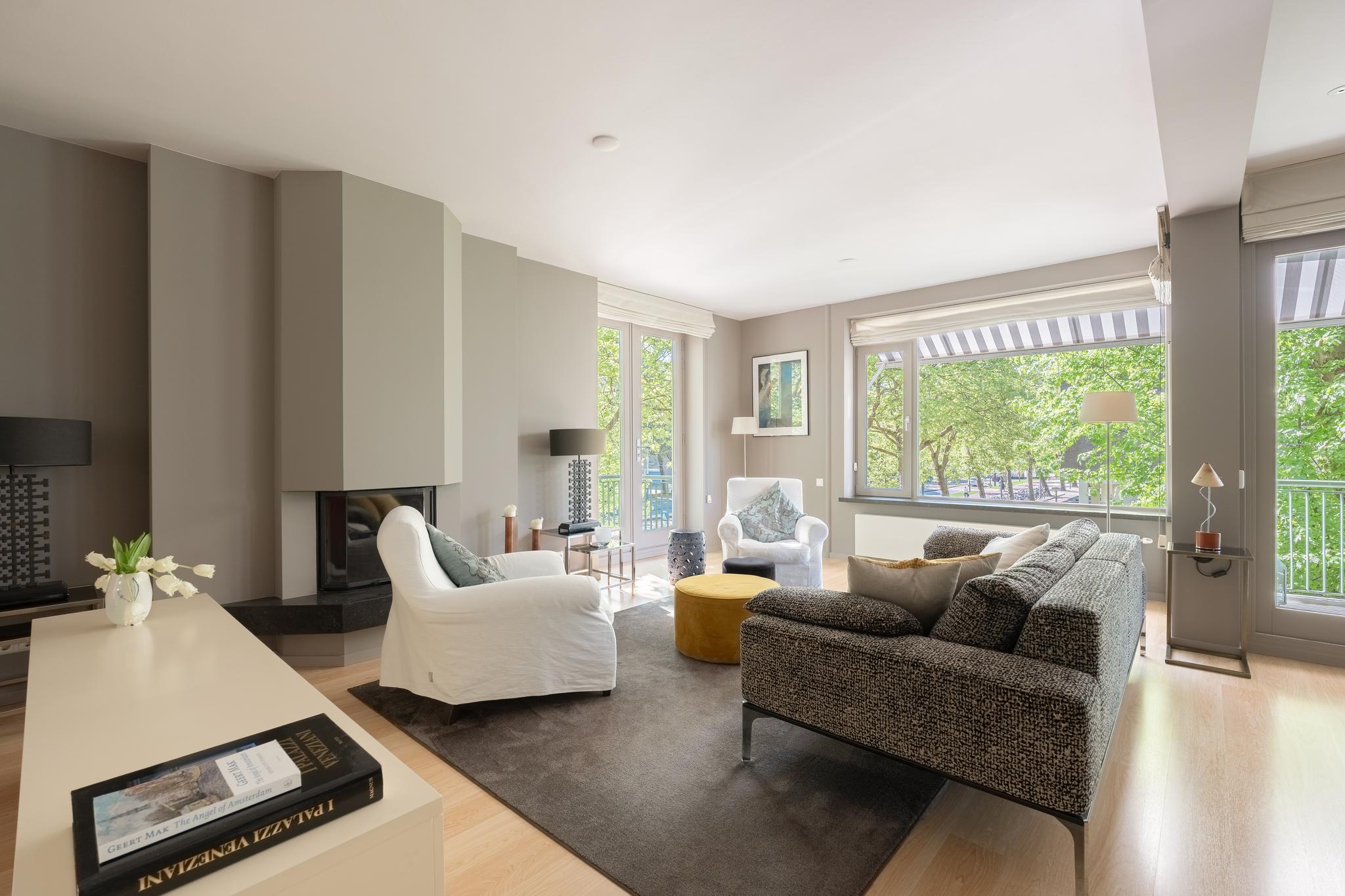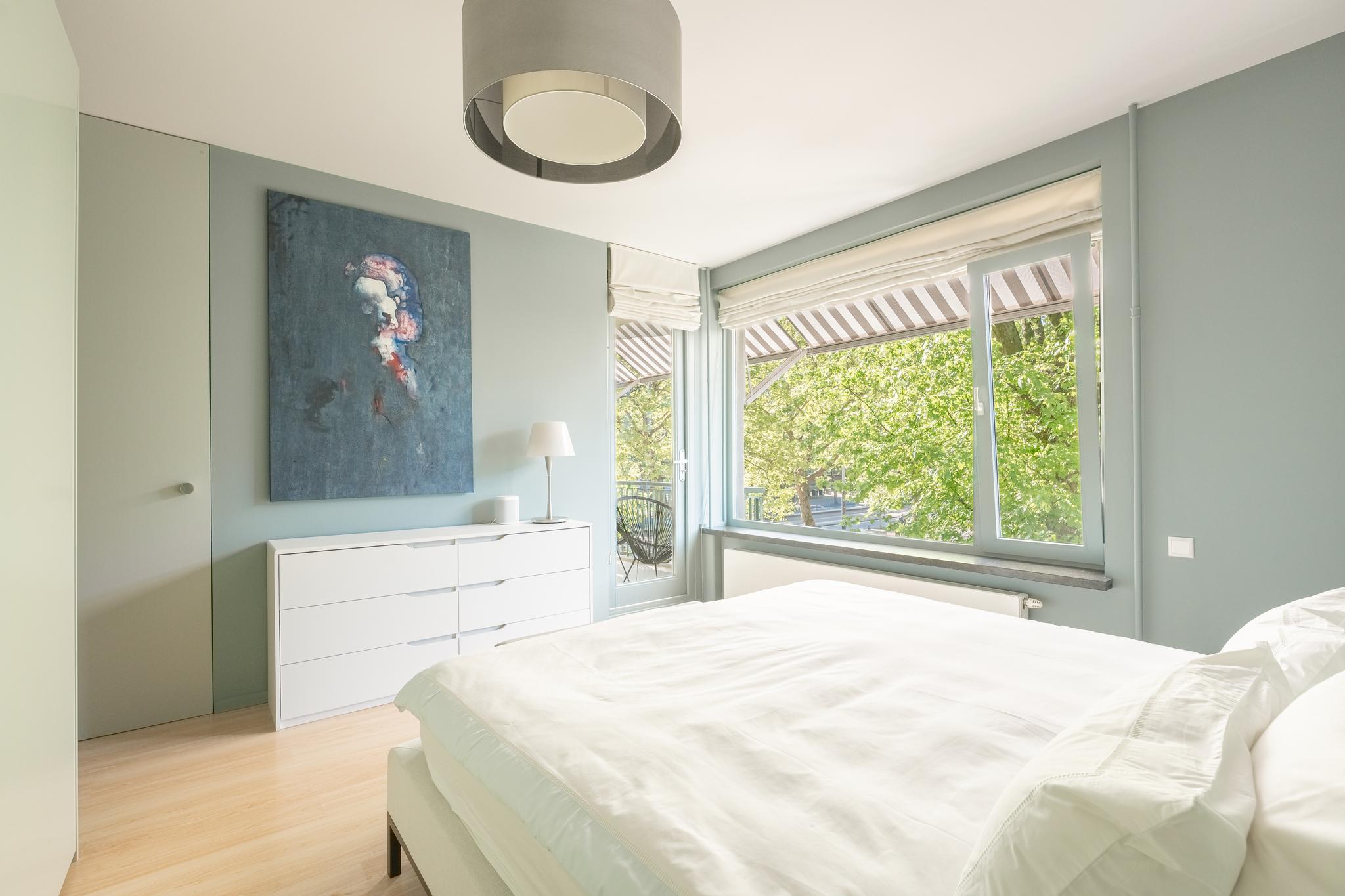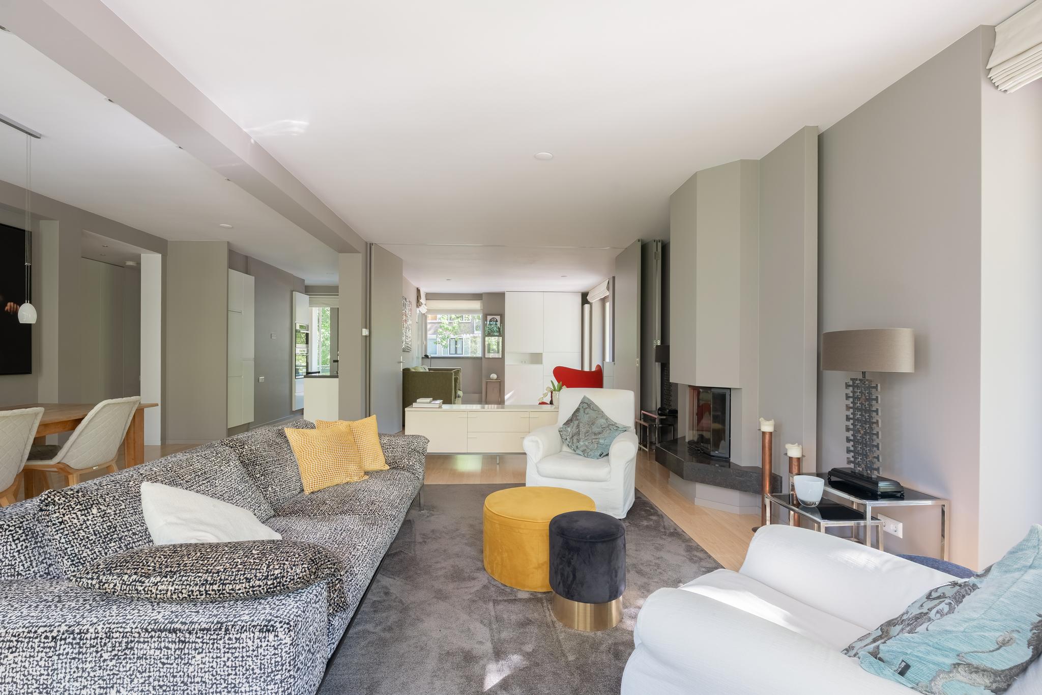 The spacious and bright living room with original (wood) fireplace provides access to three balconies and is surrounded by greenery. A smart sliding wall in the living room allows for the creation of a second (large) bedroom.