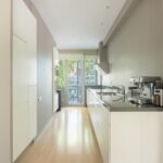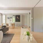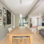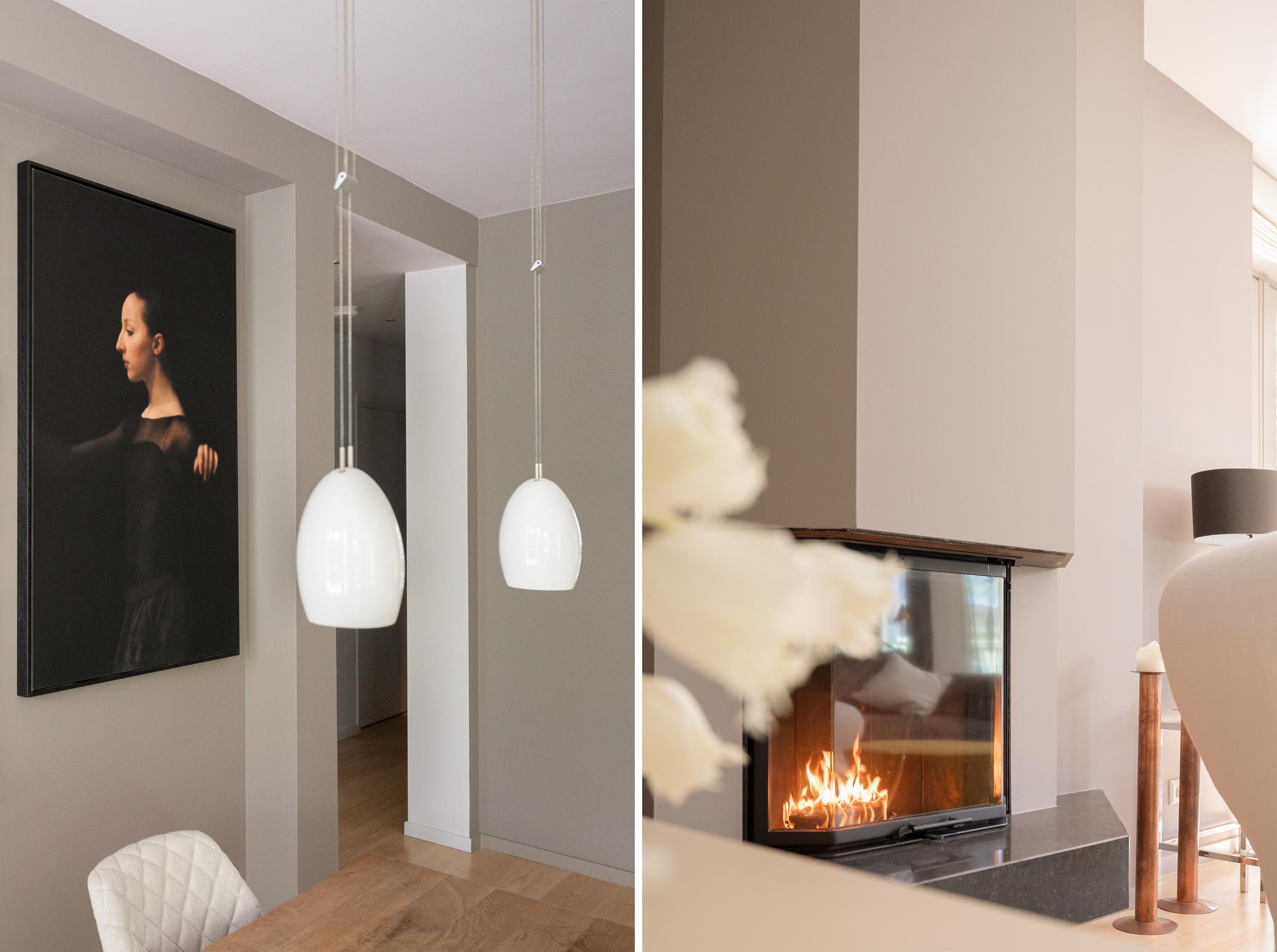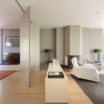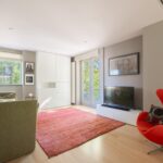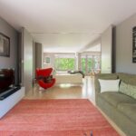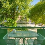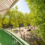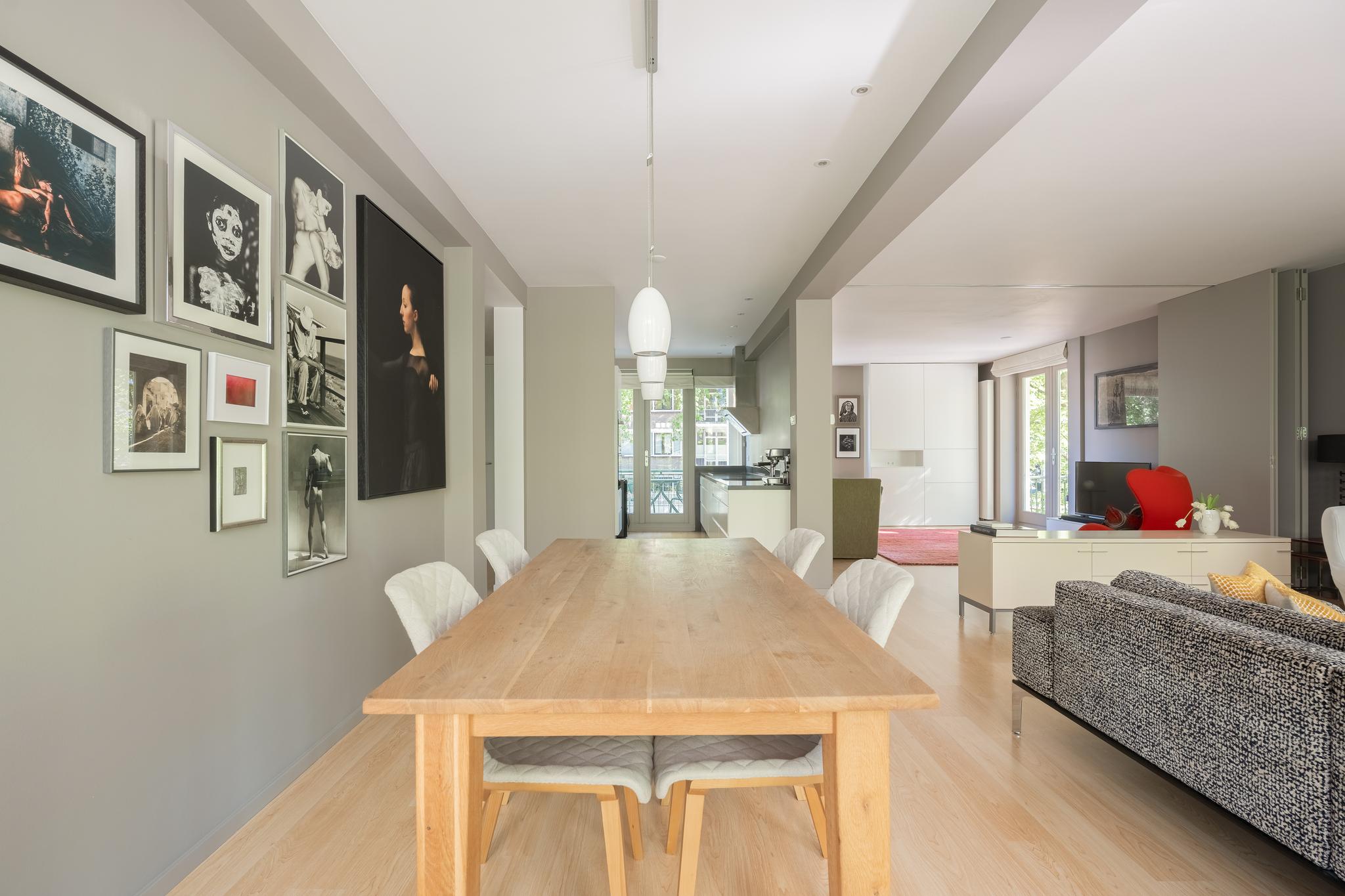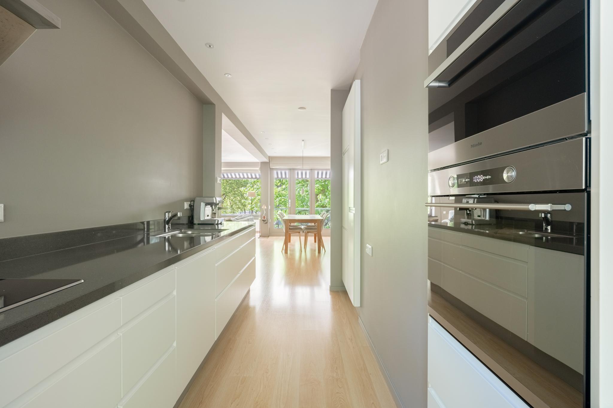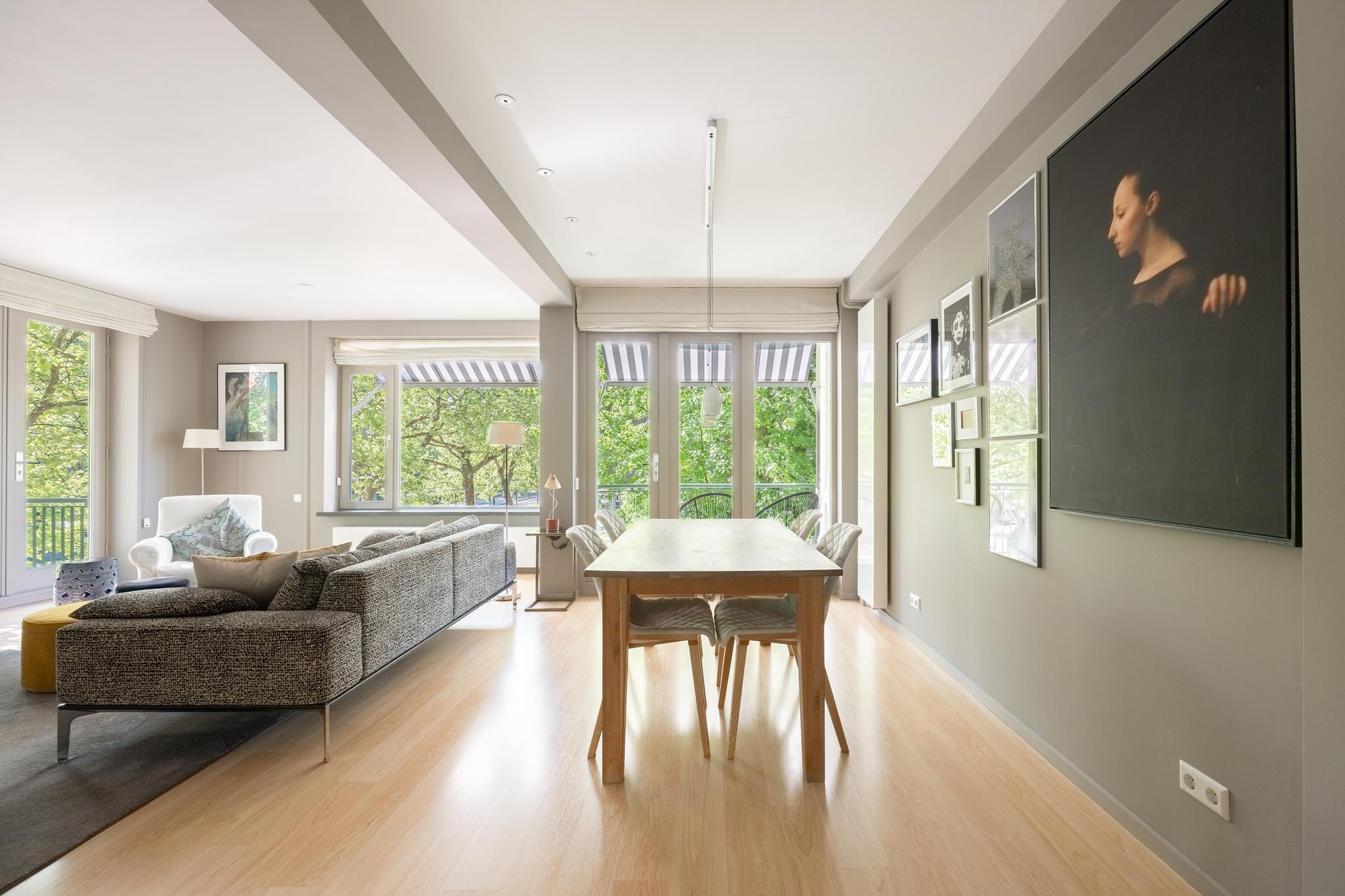 The spacious and bright living room with original (wood) fireplace provides access to three balconies and is surrounded by greenery. A smart sliding wall in the living room allows for the creation of a second (large) bedroom.