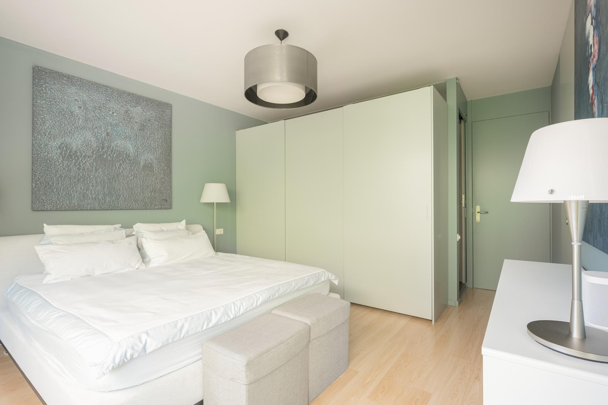 The spacious master bedroom with built-in wardrobes offers access to a balcony and to the bathroom, which features a bathtub, walk-in shower, washbasin, and second toilet. The bedroom can be cleverly separated from the bathroom for more privacy.