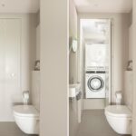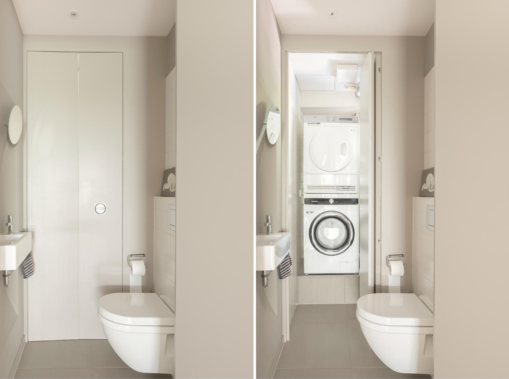 Entrance on the second floor, central hallway, separate (wall-mounted) toilet with a small washbasin. Behind the toilet space, a laundry area has been efficiently created.