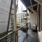 The bedroom has direct access to the balcony and features a sink and a connection for a washing machine. The bathroom is fitted with a walk-in shower, sink with mirror, toilet, and radiator. The west-facing balcony provides a pleasant outdoor space to enjoy the afternoon and evening sun.