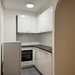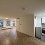 The apartment includes a spacious living/dining room with abundant natural light. The open kitchen is equipped with modern built-in appliances, including a 4-burner induction hob, a fridge and freezer, a combi oven/microwave, a dishwasher, and an extractor fan.