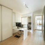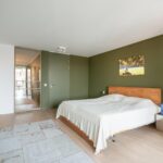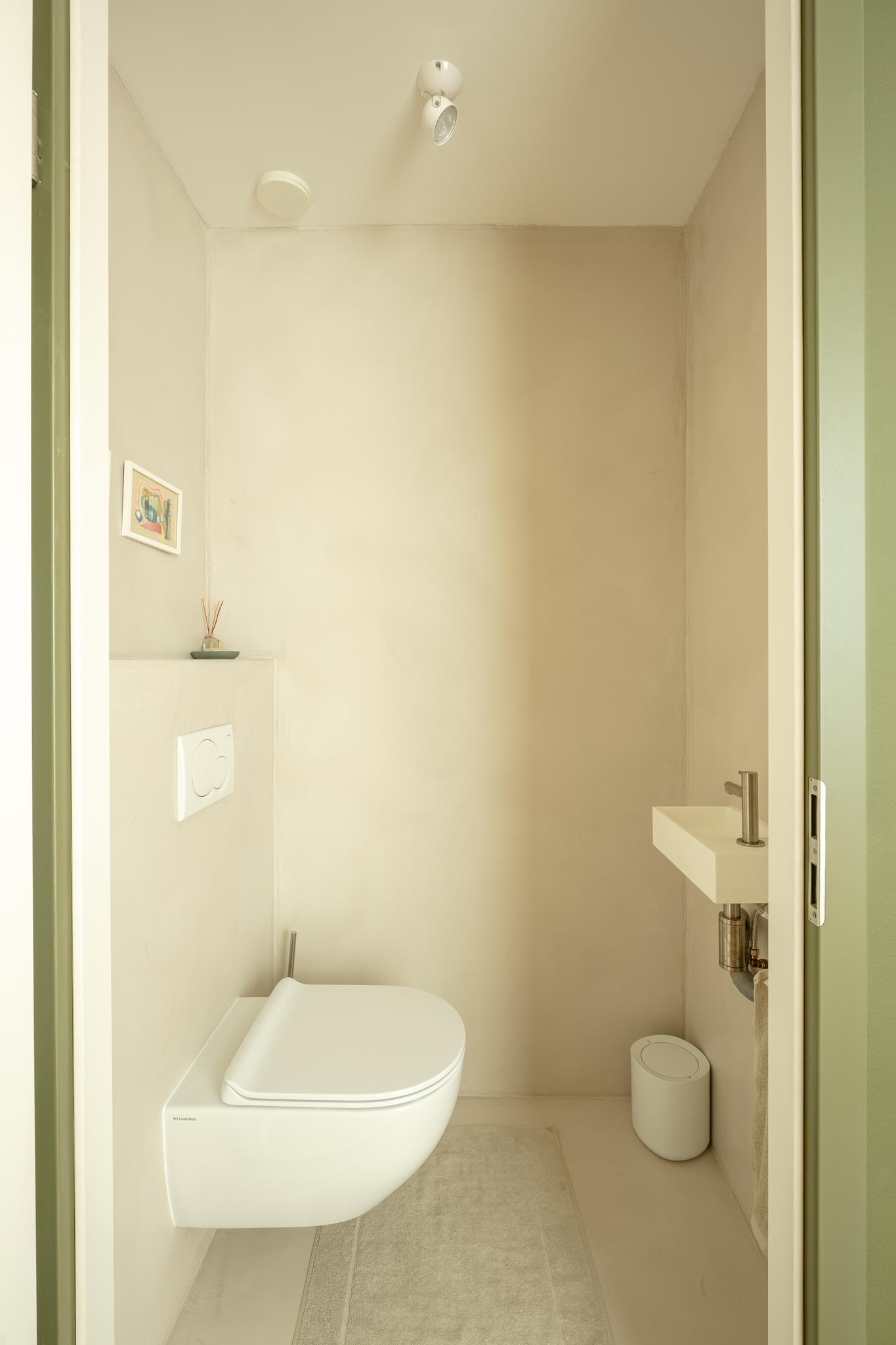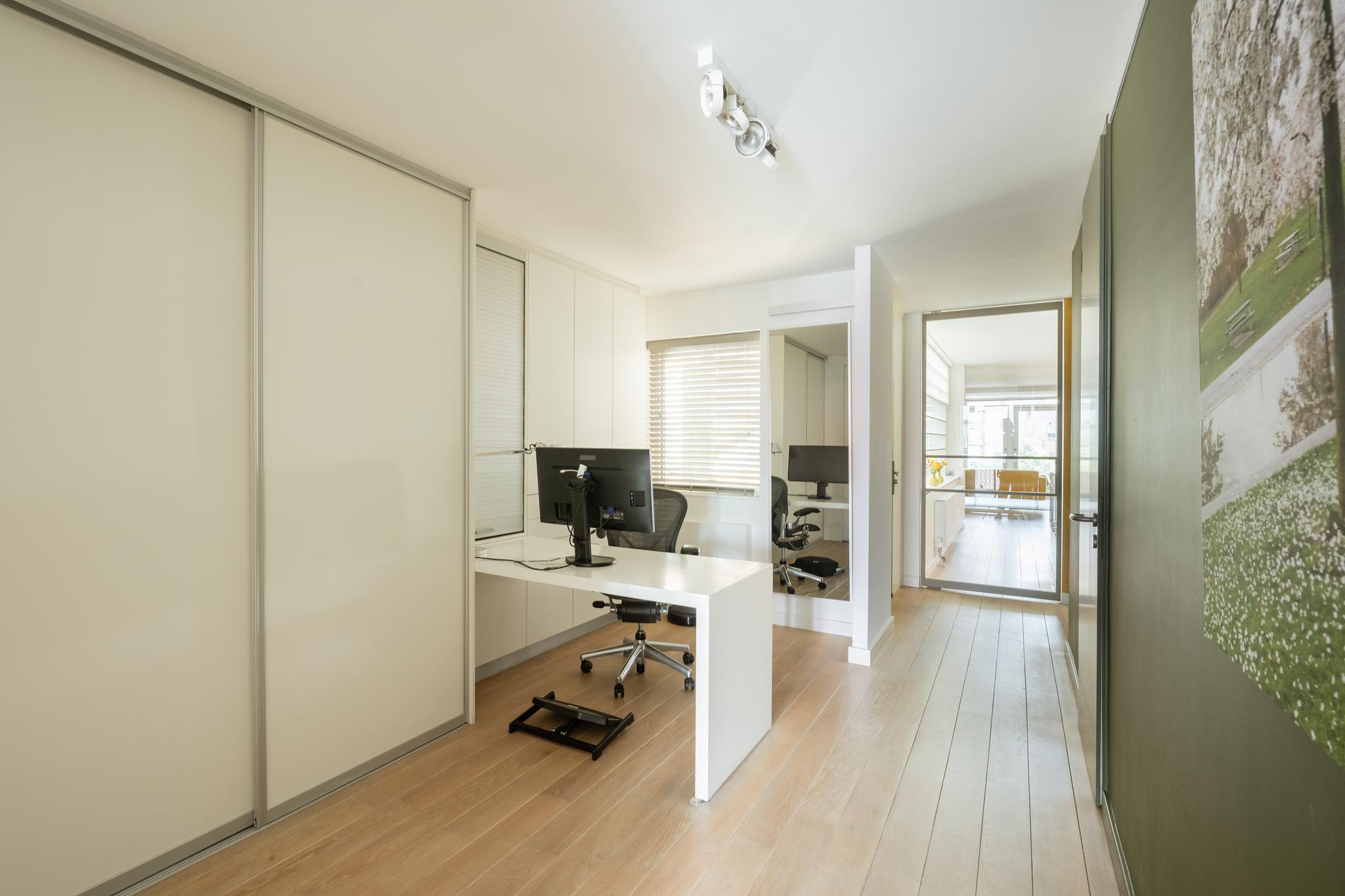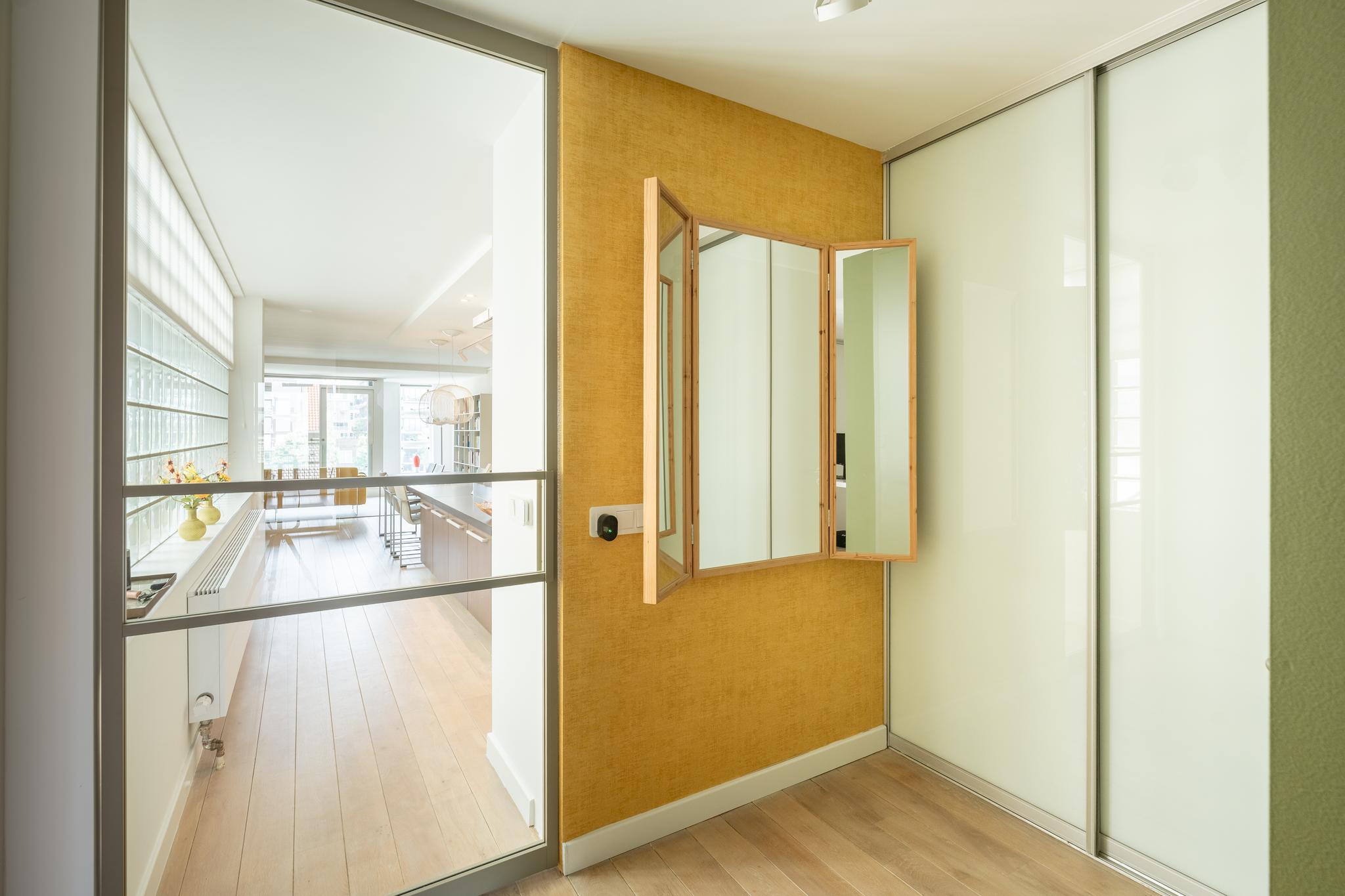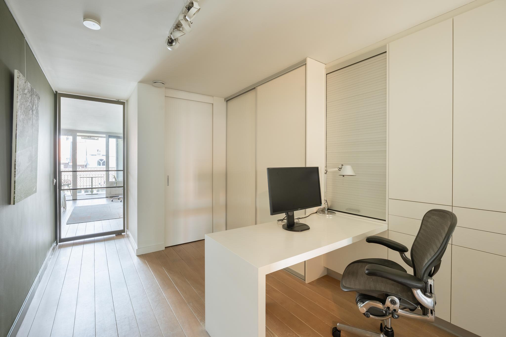 French doors open up to sweeping, unobstructed views over the Westerdok and the harbors. The hallway gives access to the study, which includes built-in wardrobes, and a laundry/storage room with sink. Thanks to the generous layout, it’s possible to create a separate guest room or home office.