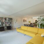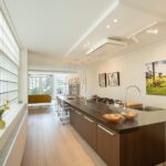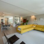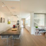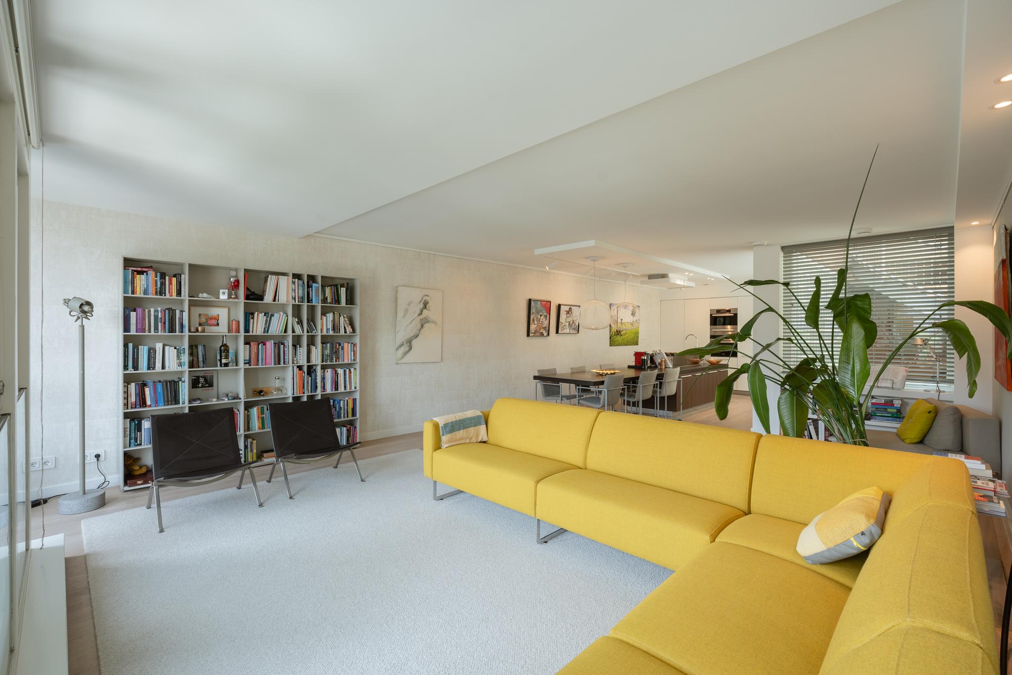 The appealing communal entrance with open staircase and lift on the ground floor provides access to the apartment on the fourth floor. A spacious hallway with wardrobe and guest toilet leads into the home. The open-plan Boffi kitchen with large island is fitted with high-end built-in appliances, including a 5-burner gas hob (Foster), ceiling extractor (Novy Cloud), steam oven (Miele), regular oven (Siemens), dishwasher (Miele), and fridge/freezer (Liebherr). The kitchen seamlessly connects to the bright living area, which features a custom lighting plan and sun blinds.