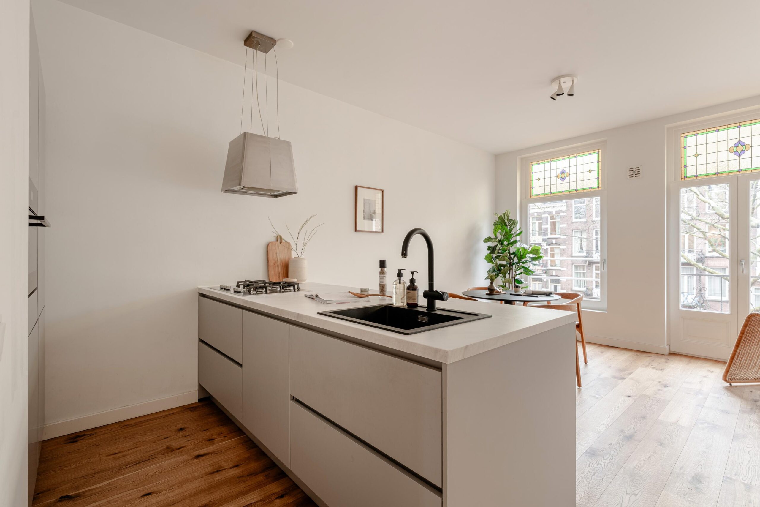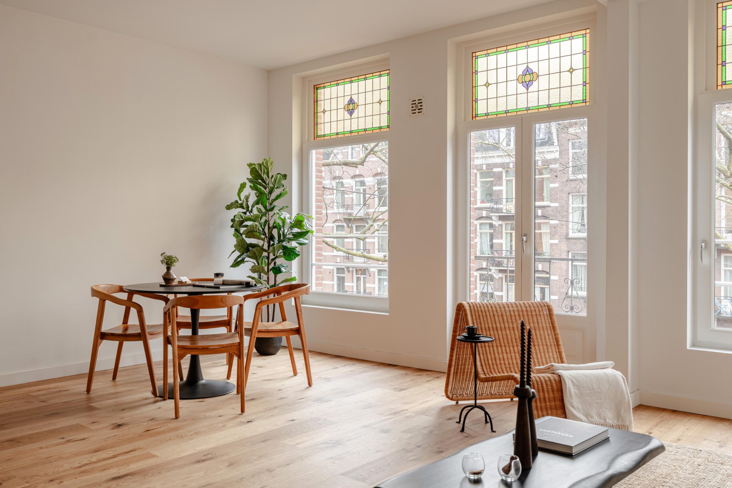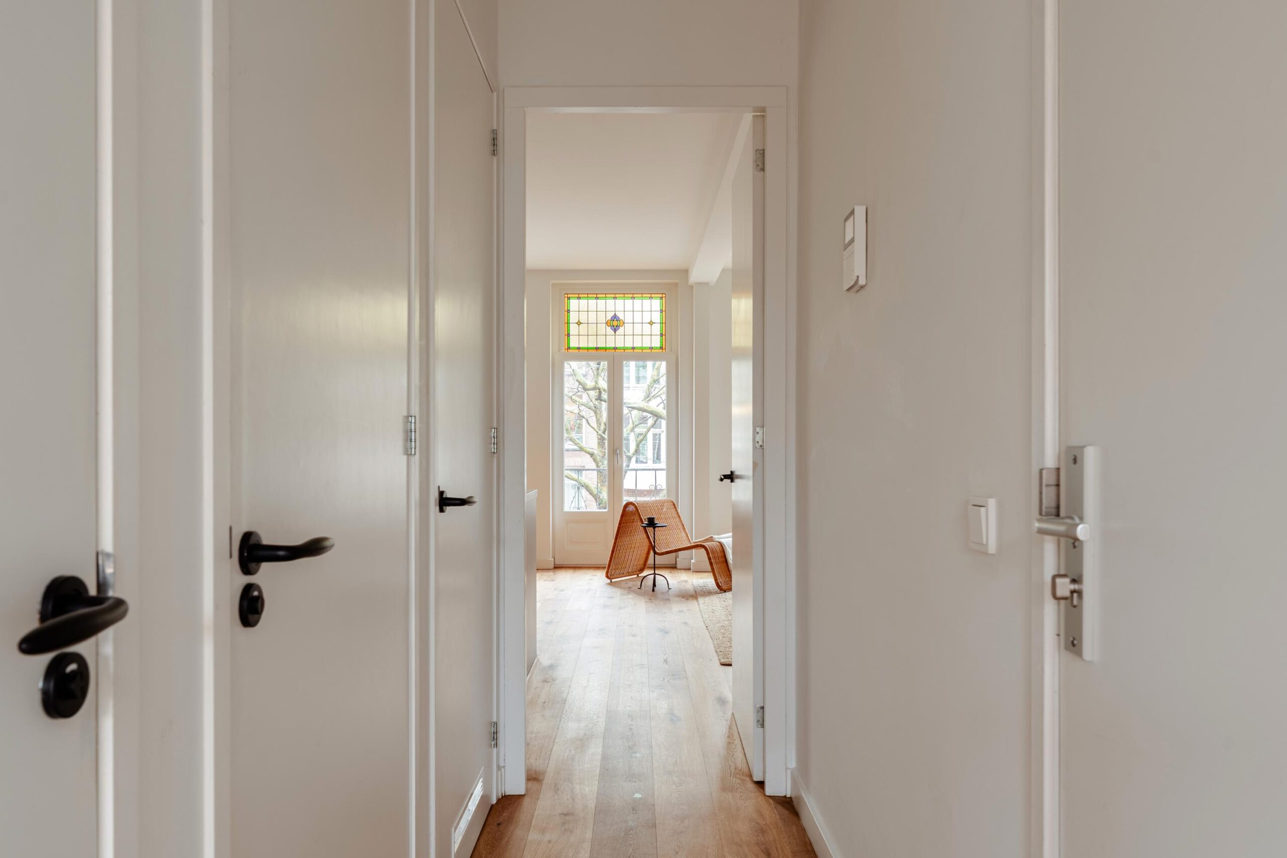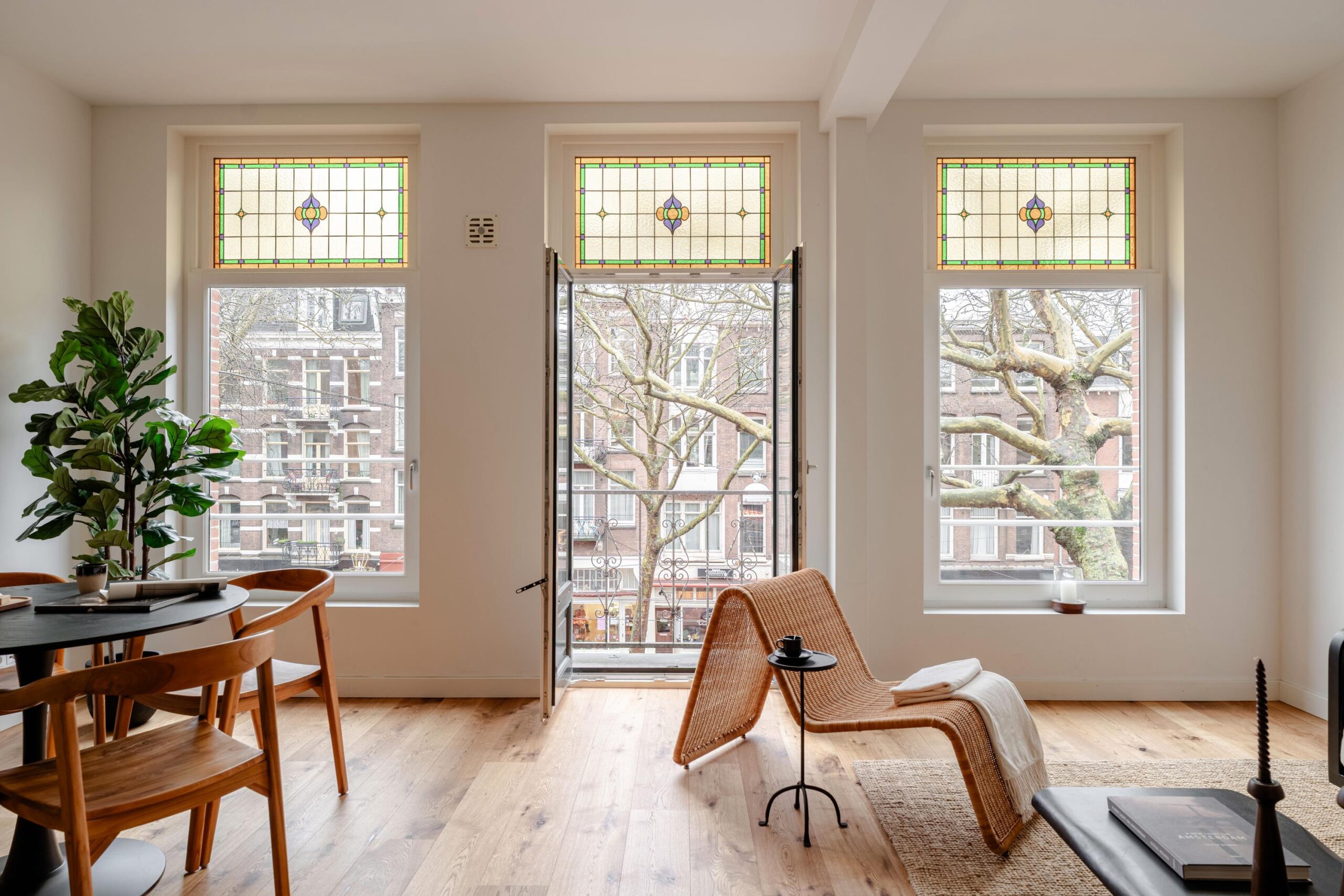 Central hallway. Bright living room with open kitchen and a small balcony at the front. The upper window sections feature charming stained-glass details.