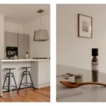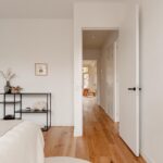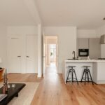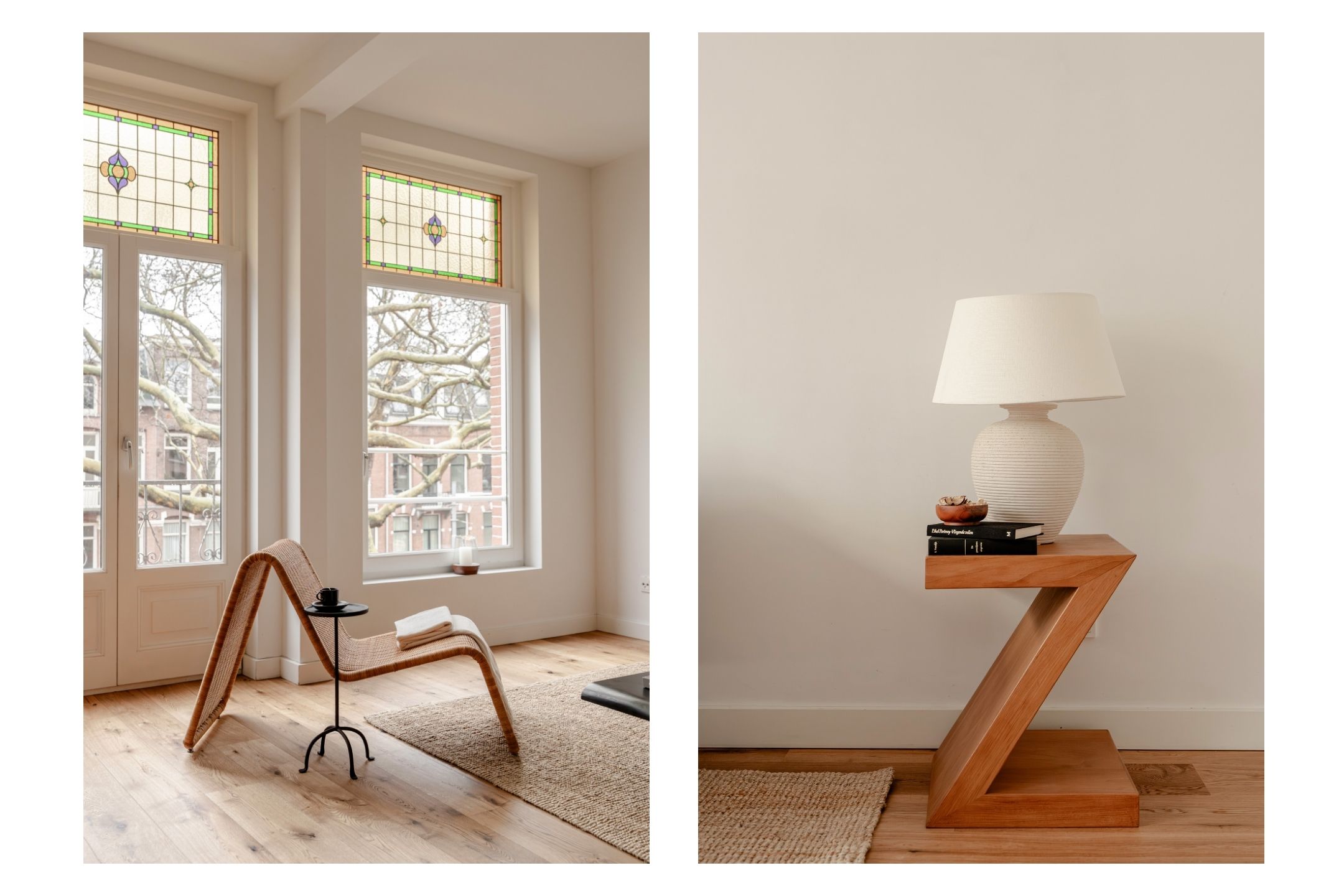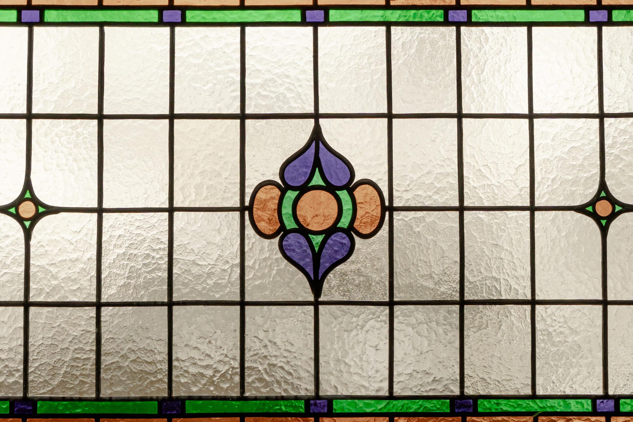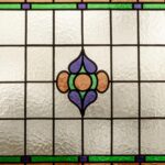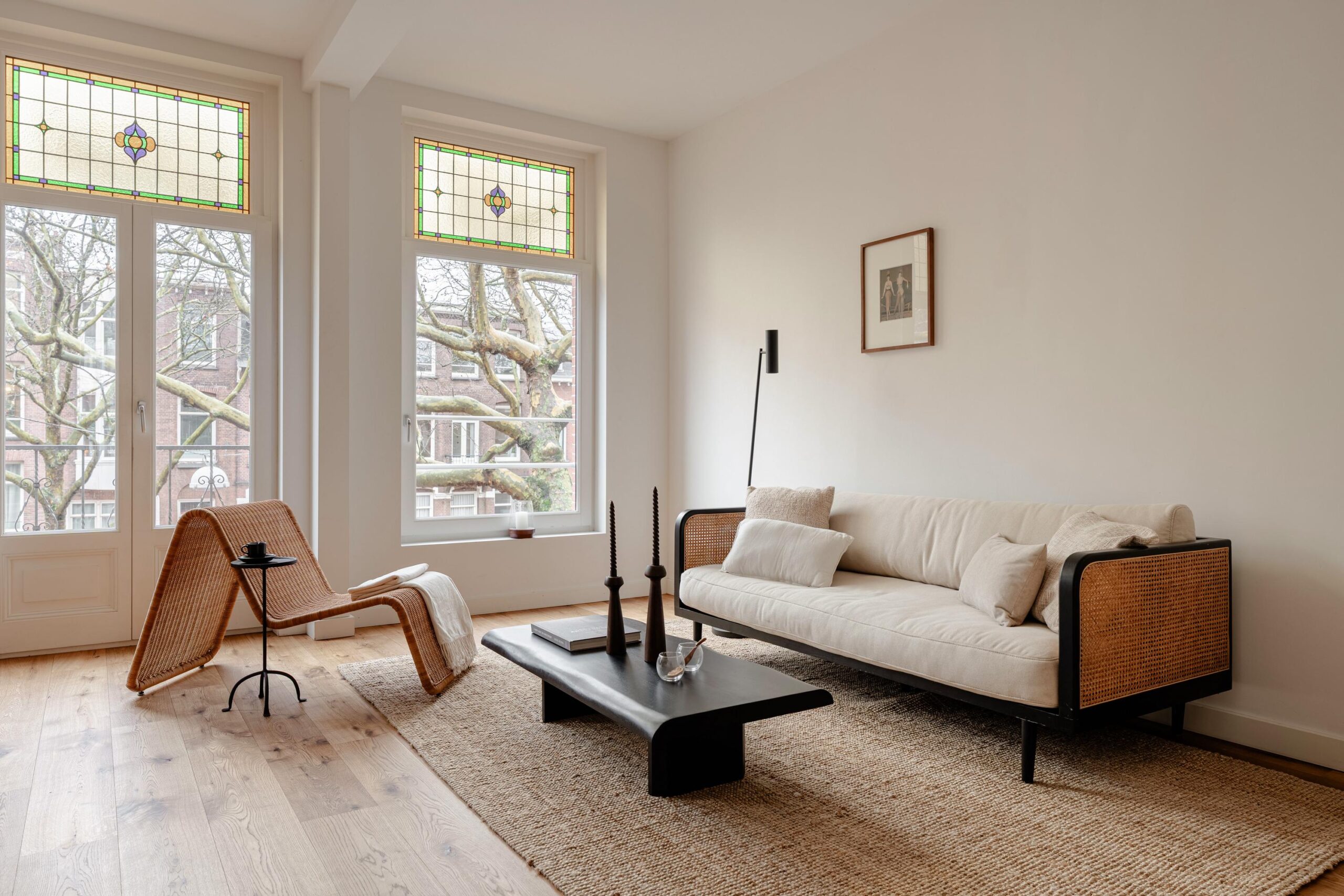 Central hallway. Bright living room with open kitchen and a small balcony at the front. The upper window sections feature charming stained-glass details.