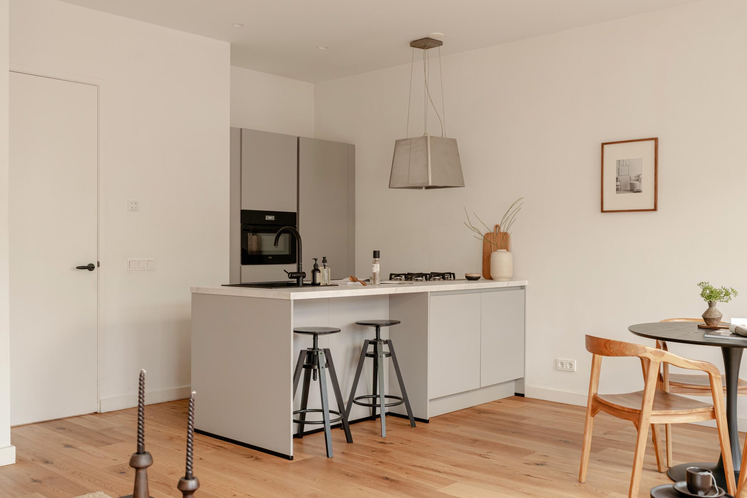 The kitchen is equipped with a five-burner gas hob, stylish extractor hood, dishwasher, combi oven/microwave, and fridge/freezer combination. Built-in appliances are by AEG and Airforce. A built-in storage cupboard and the meter cupboard are accessible from the living room.