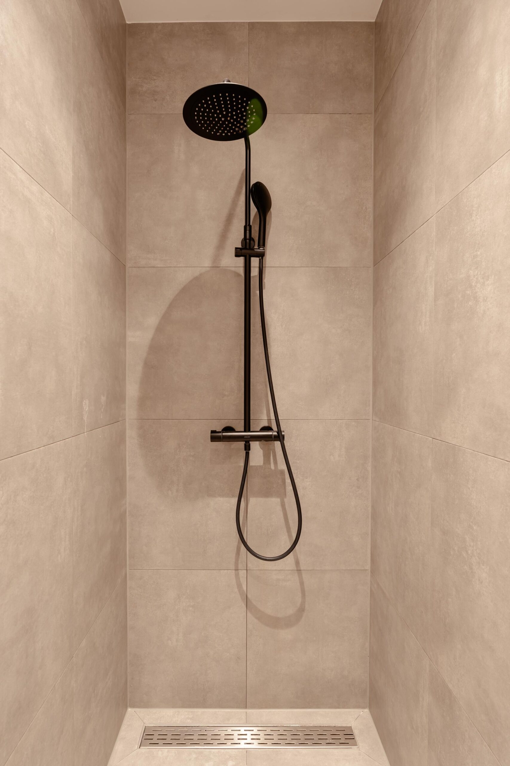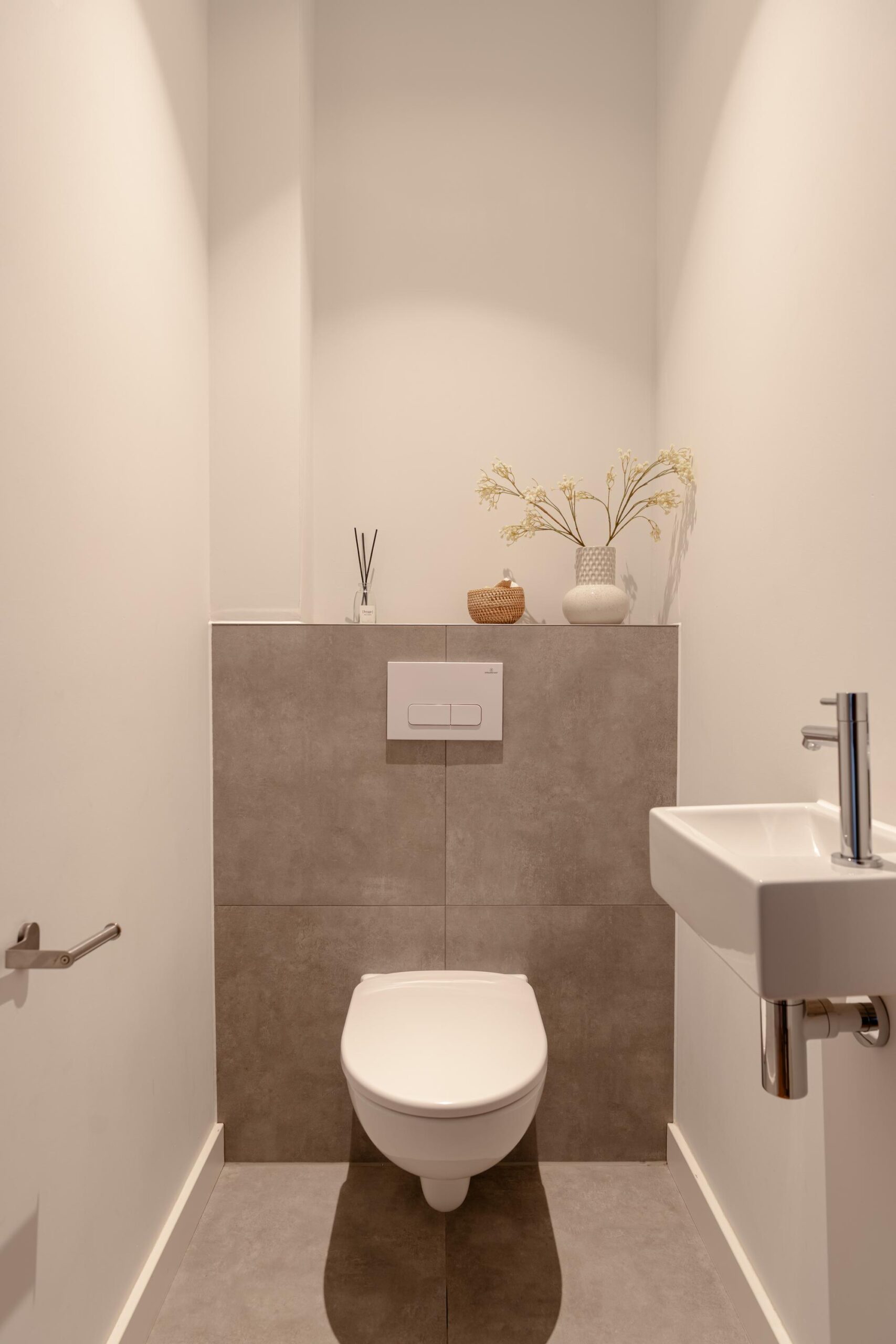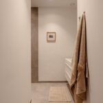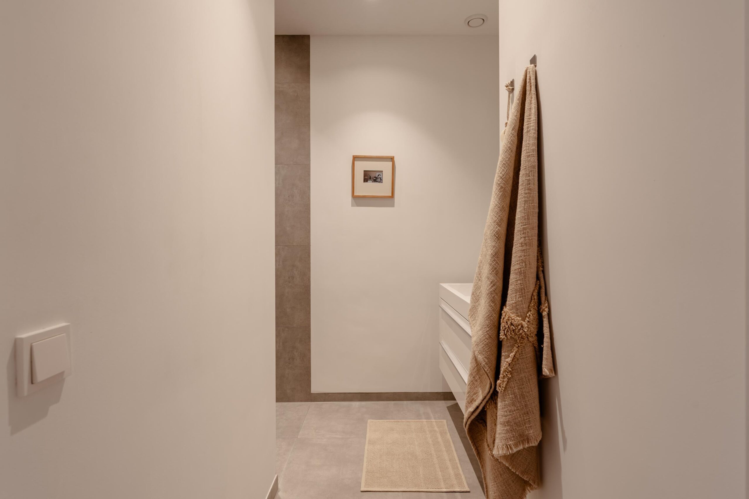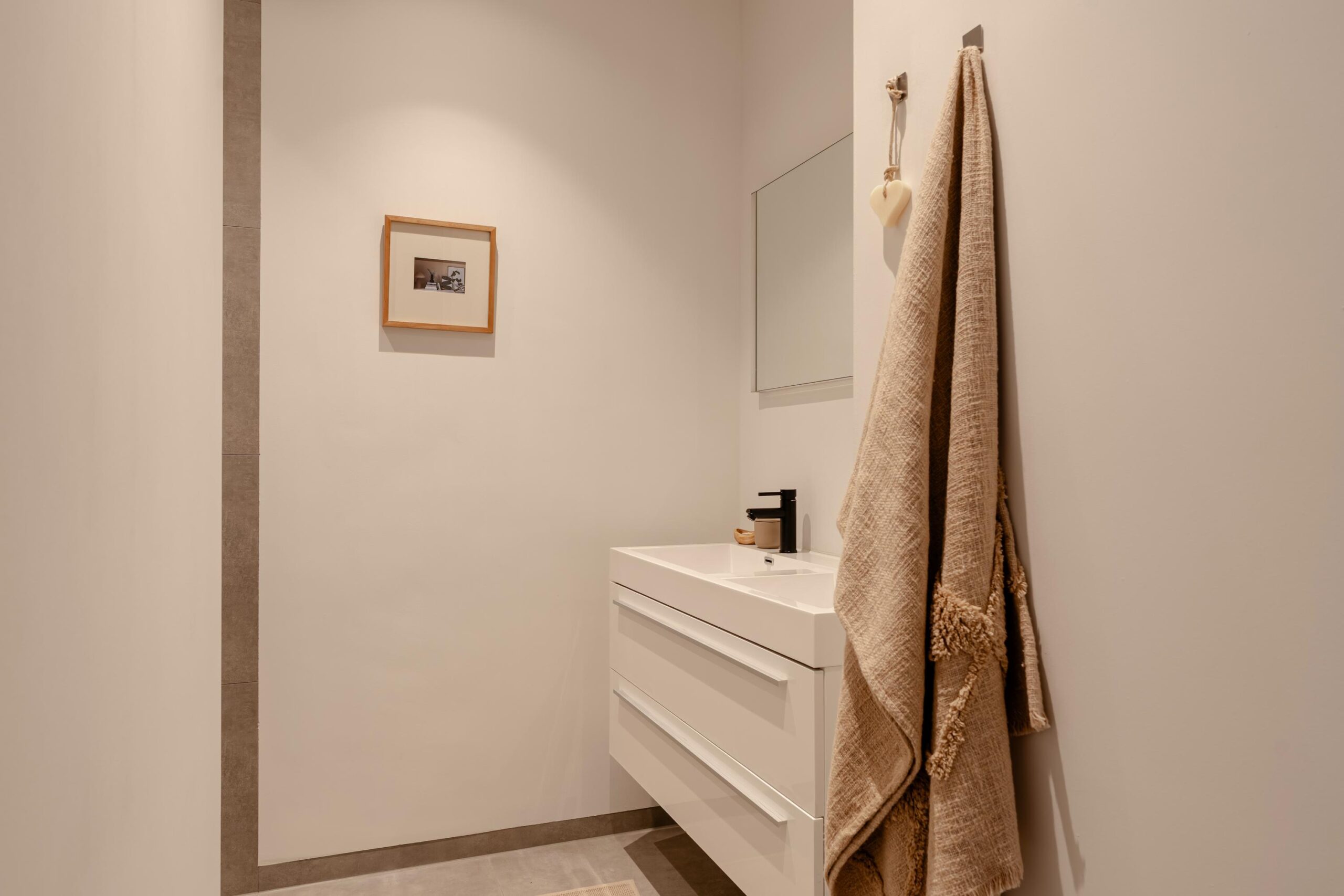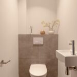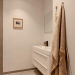 From the central hallway there is access to the central heating / laundry room (HRE Intergas, built in 2022), a separate toilet, and the bathroom. The bathroom features a vanity unit with double mixer taps and a walk-in shower with hand shower.