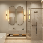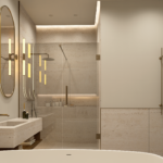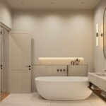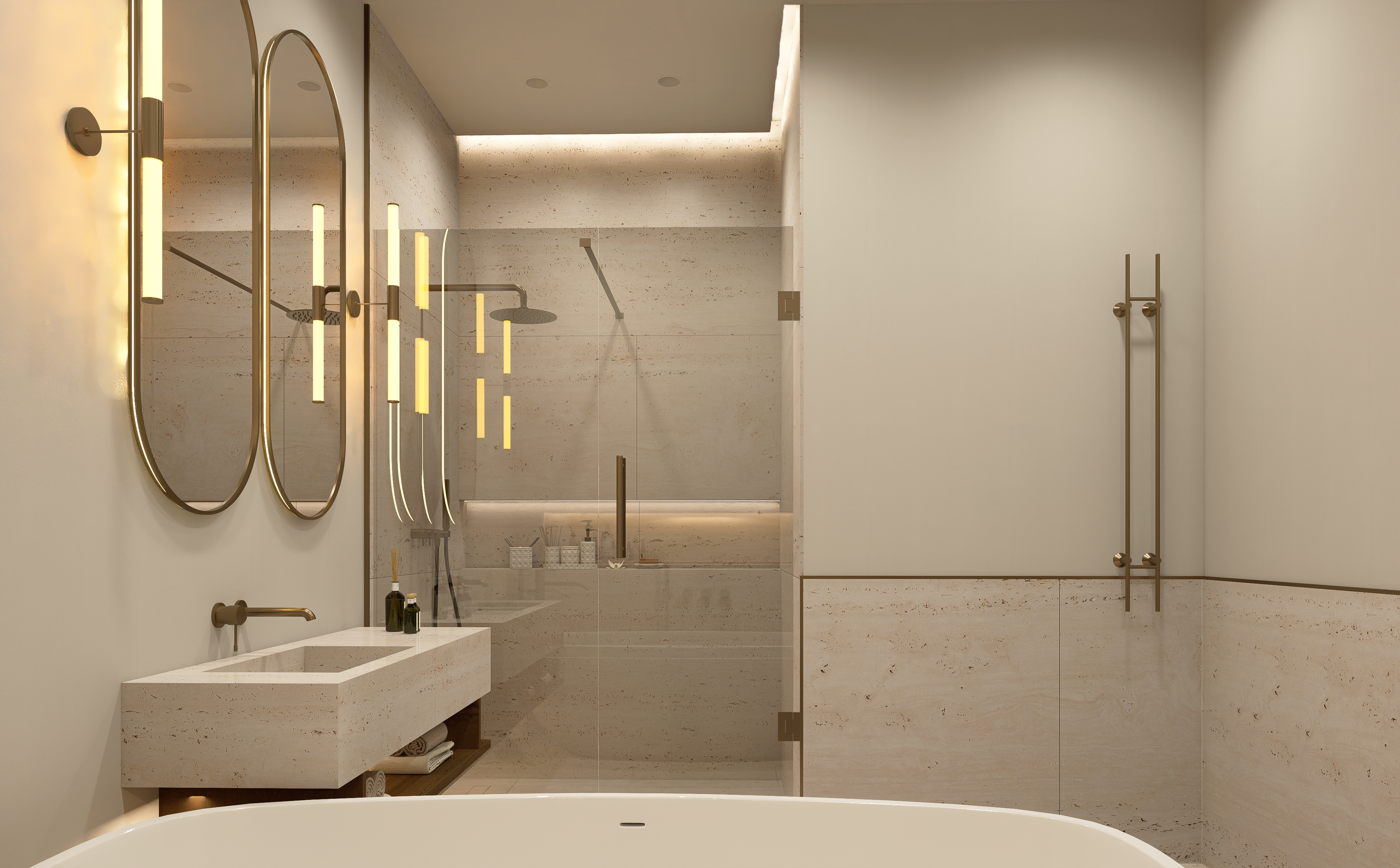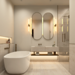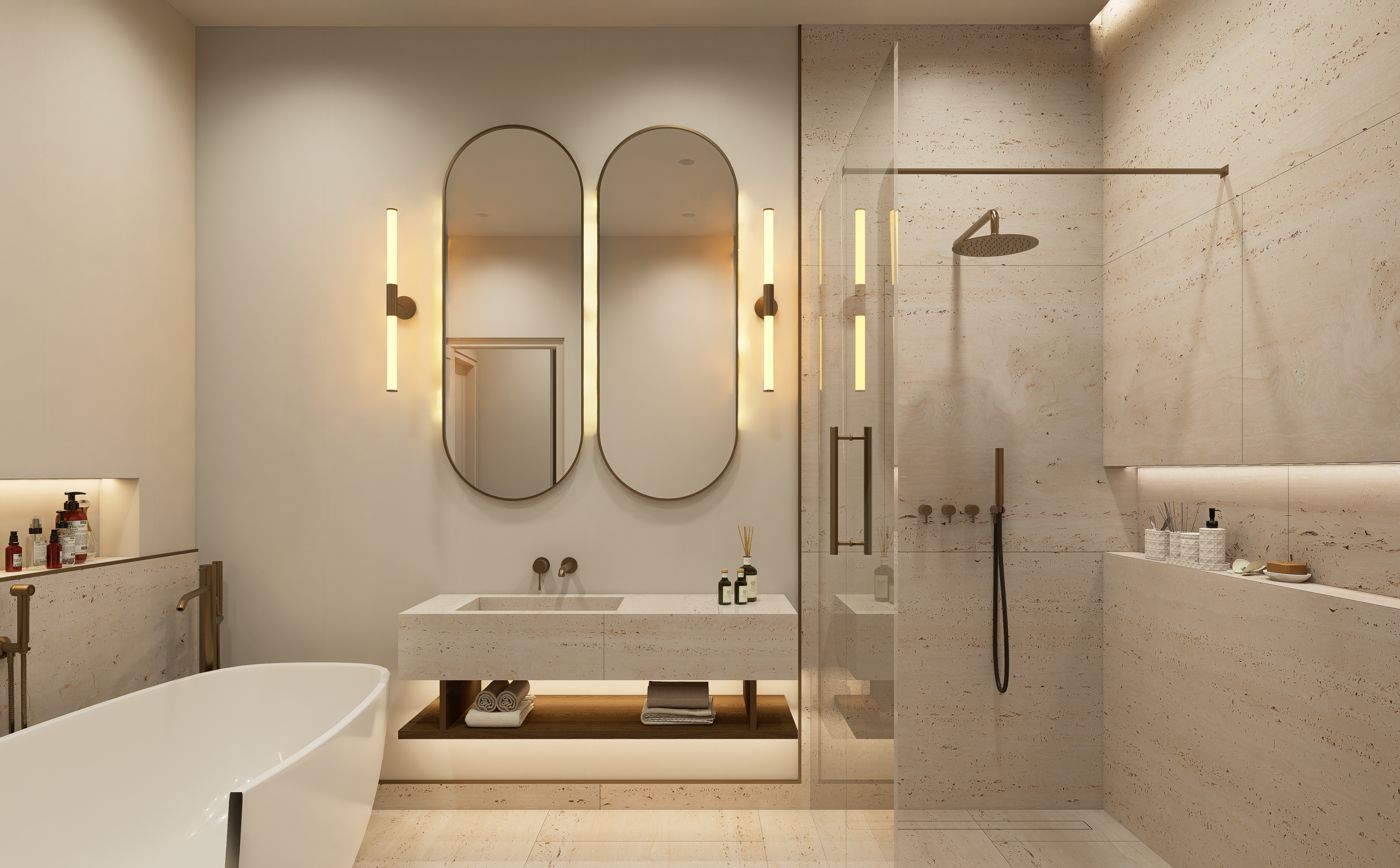 - Bathroom amenities Ligbad, dubbele wastafel, wastafelmeubel, inloopdouche