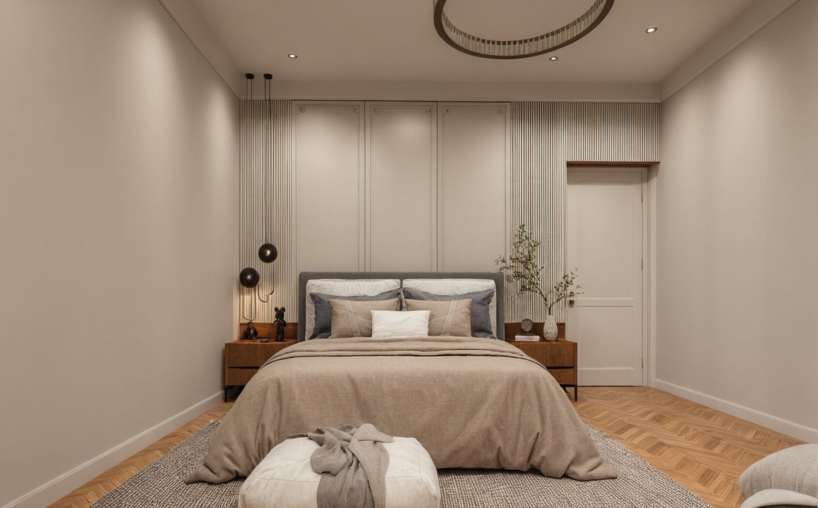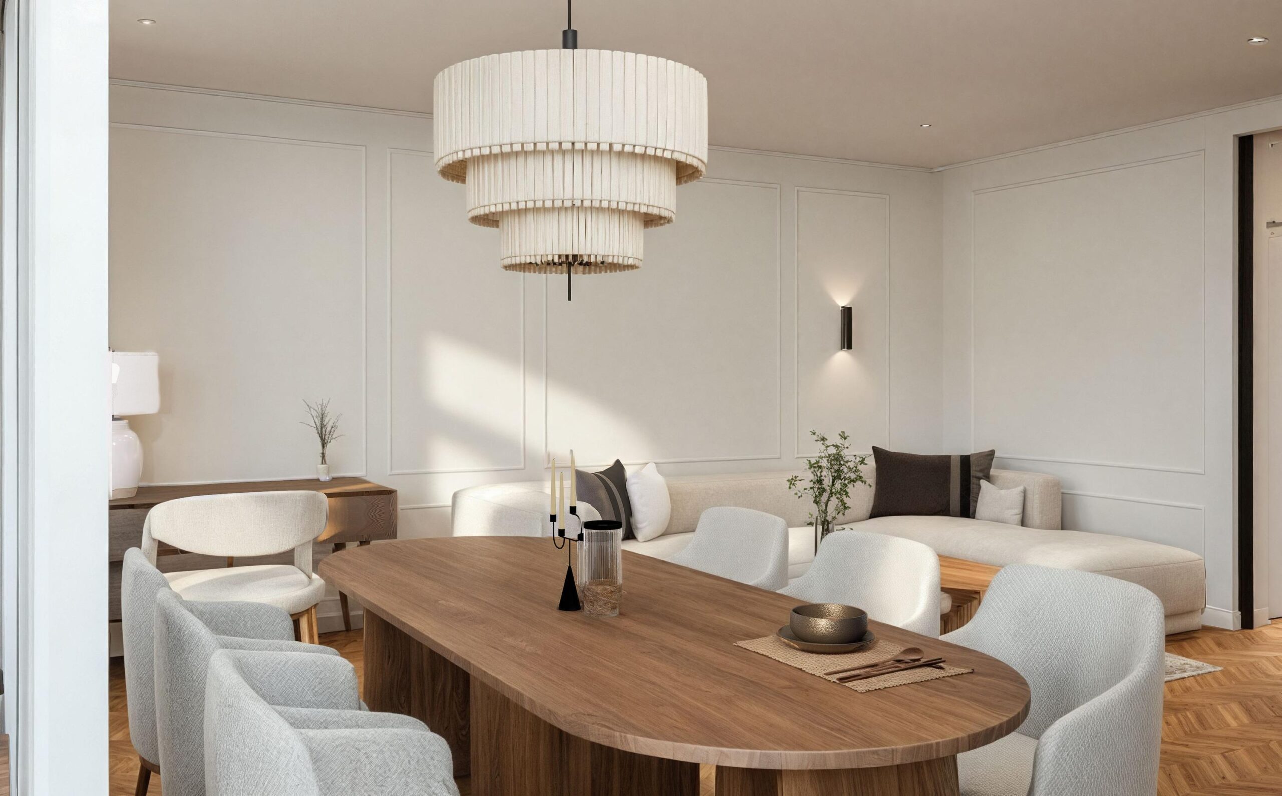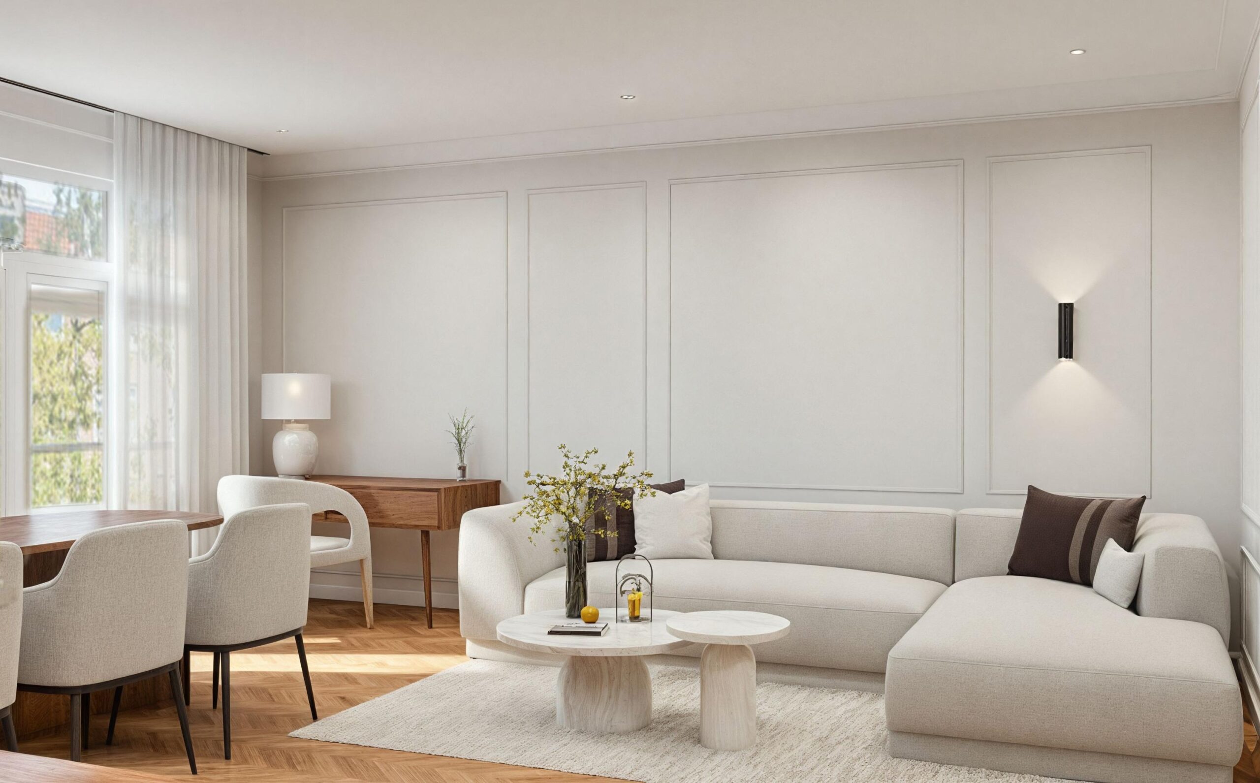Beautiful French doors open onto the south-facing balcony (approx. 4 m²) — perfect for morning sun and maximum daylight. The spacious living/dining room is located at the rear, featuring atmospheric wall lighting, decorative moulding, and a calm colour palette. Here too, French doors give access to the second balcony at the back.