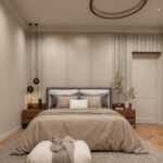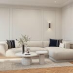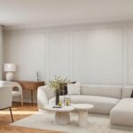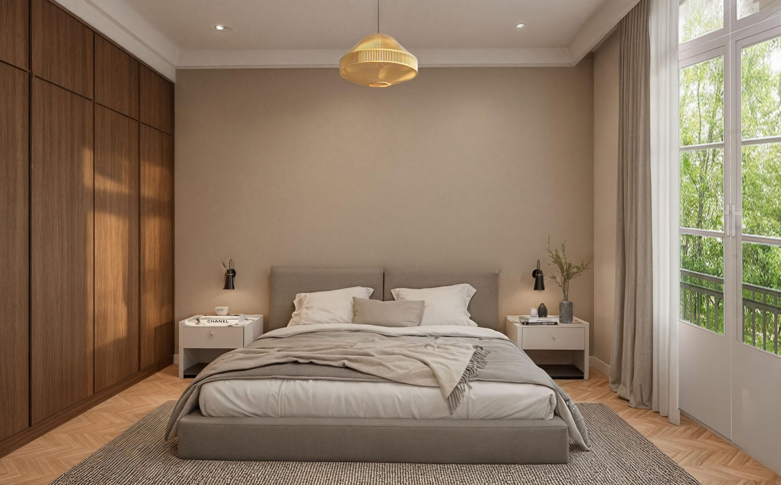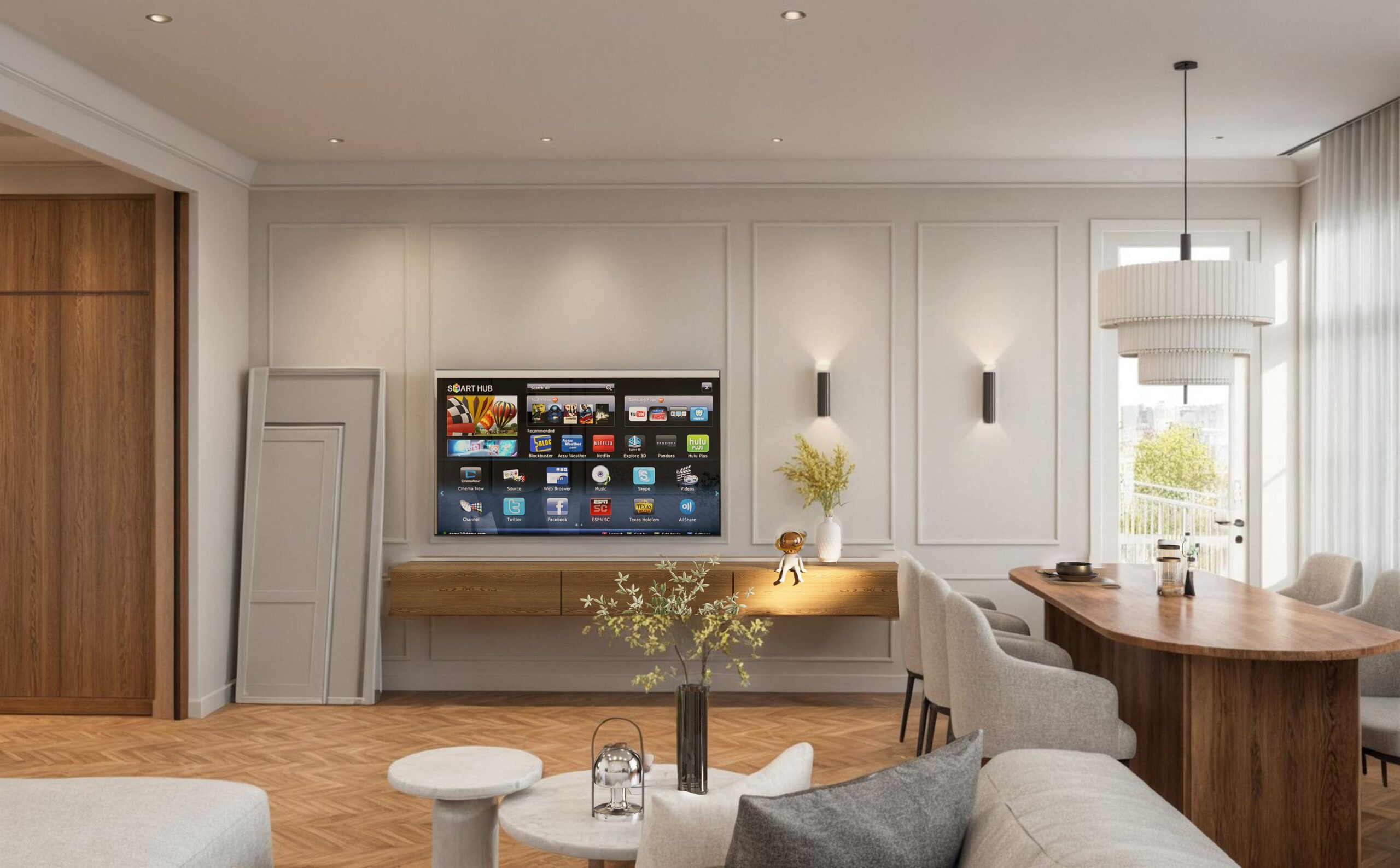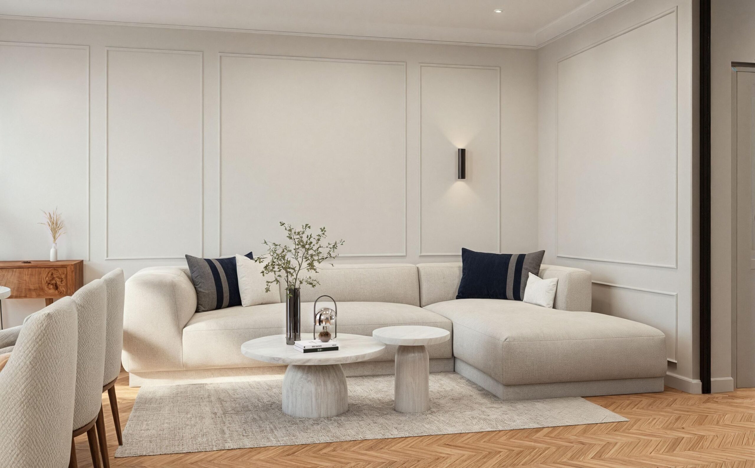 Beautiful French doors open onto the south-facing balcony (approx. 4 m²) — perfect for morning sun and maximum daylight. The spacious living/dining room is located at the rear, featuring atmospheric wall lighting, decorative moulding, and a calm colour palette. Here too, French doors give access to the second balcony at the back.