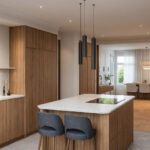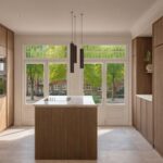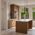 At the front you’ll find the bespoke open-plan kitchen with cooking island and large windows.