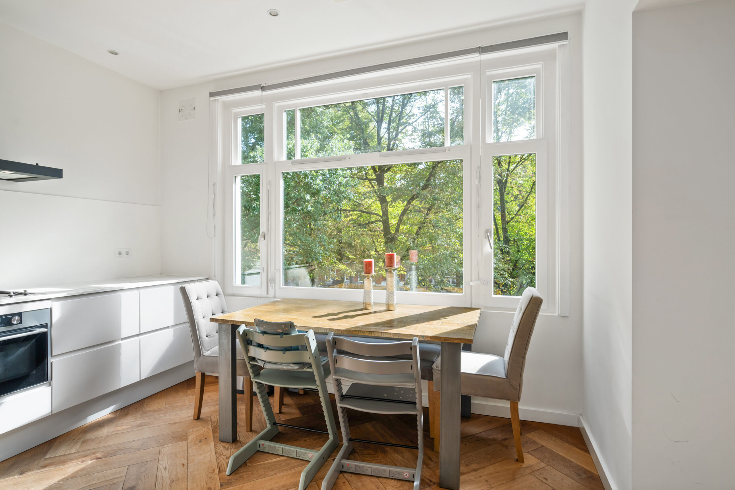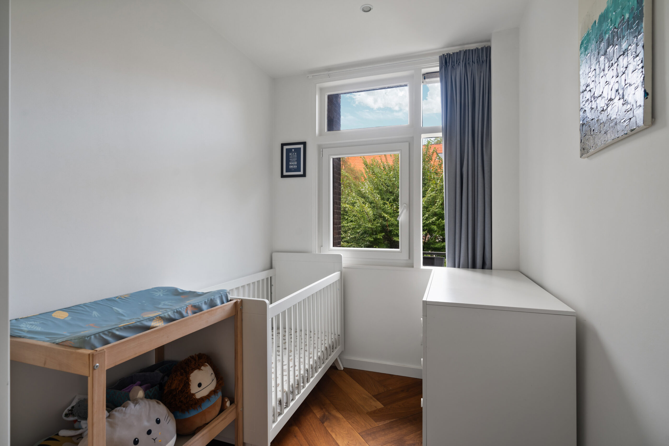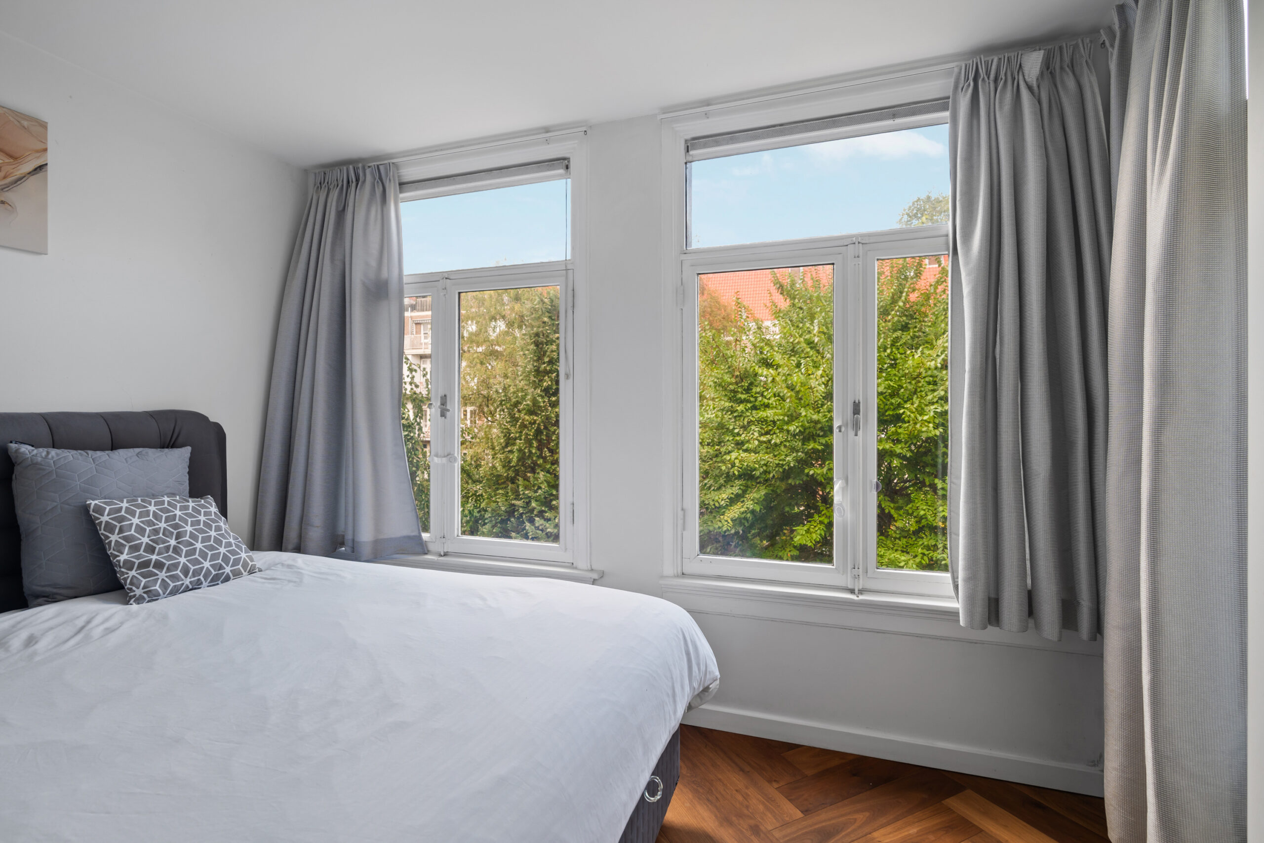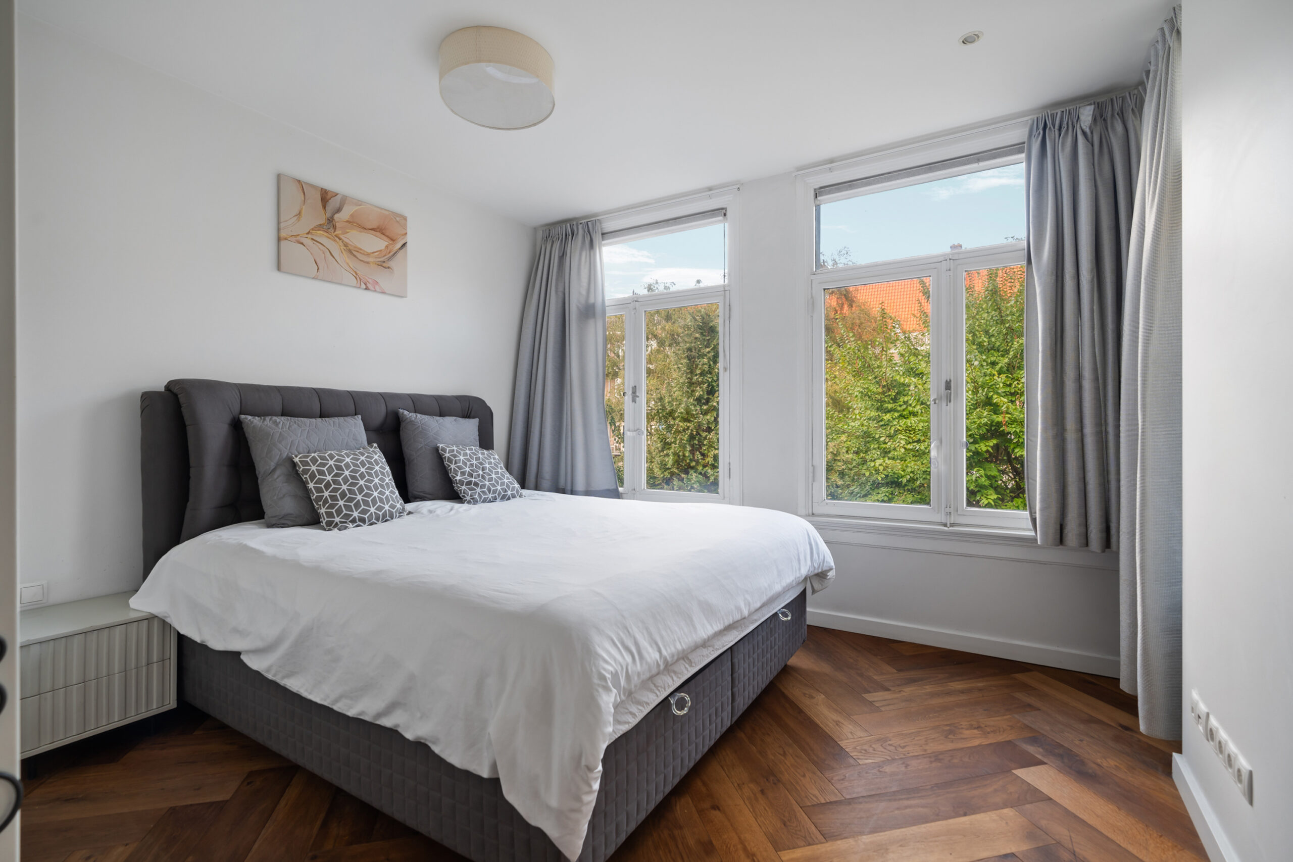 The sun-filled living room overlooks the green Churchill-laan. At the quiet rear area are three bedrooms, including a primary large suite with its own private bathroom featuring a walk-in shower, washbasin, and toilet.