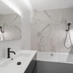 The centrally located luxury bathroom offers a duo bathtub, wall-hung toilet, and sleek vanity. Multiple bedrooms open onto the wide, sunlit balcony, perfect for outdoor enjoyment.