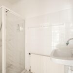 The bathroom is simple and fitted with a washbasin and walk-in shower. There is a separate toilet with a small sink. The hallway also offers a convenient built-in closet.