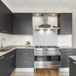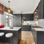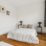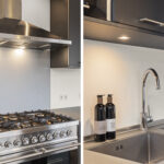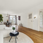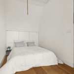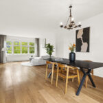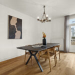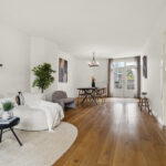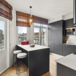 Hallway, a modern bathroom with walk-in shower, washbasin, floating toilet, and concealed connections for a washing machine and dryer. A spacious master bedroom at the front. A generous living room with solid oak parquet flooring and French doors leading to the rear balcony, a semi-open luxury kitchen with island and built-in appliances including fridge, freezer, dishwasher, and a Boretti gas stove with 6 burners and two ovens. From the kitchen there is access to a second balcony.