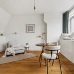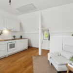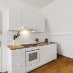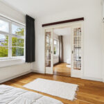 Landing/hallway, second separate toilet, central heating cabinet, spacious second bedroom with built-in wardrobes and a kitchenette. In the center is the second bathroom with double washbasin and bathtub with shower. The third bedroom, also with storage space, provides access to a very spacious, beautifully landscaped, and sheltered roof terrace facing southwest (plenty of sun!). Above both bedrooms is an attic storage, accessible via a loft ladder.