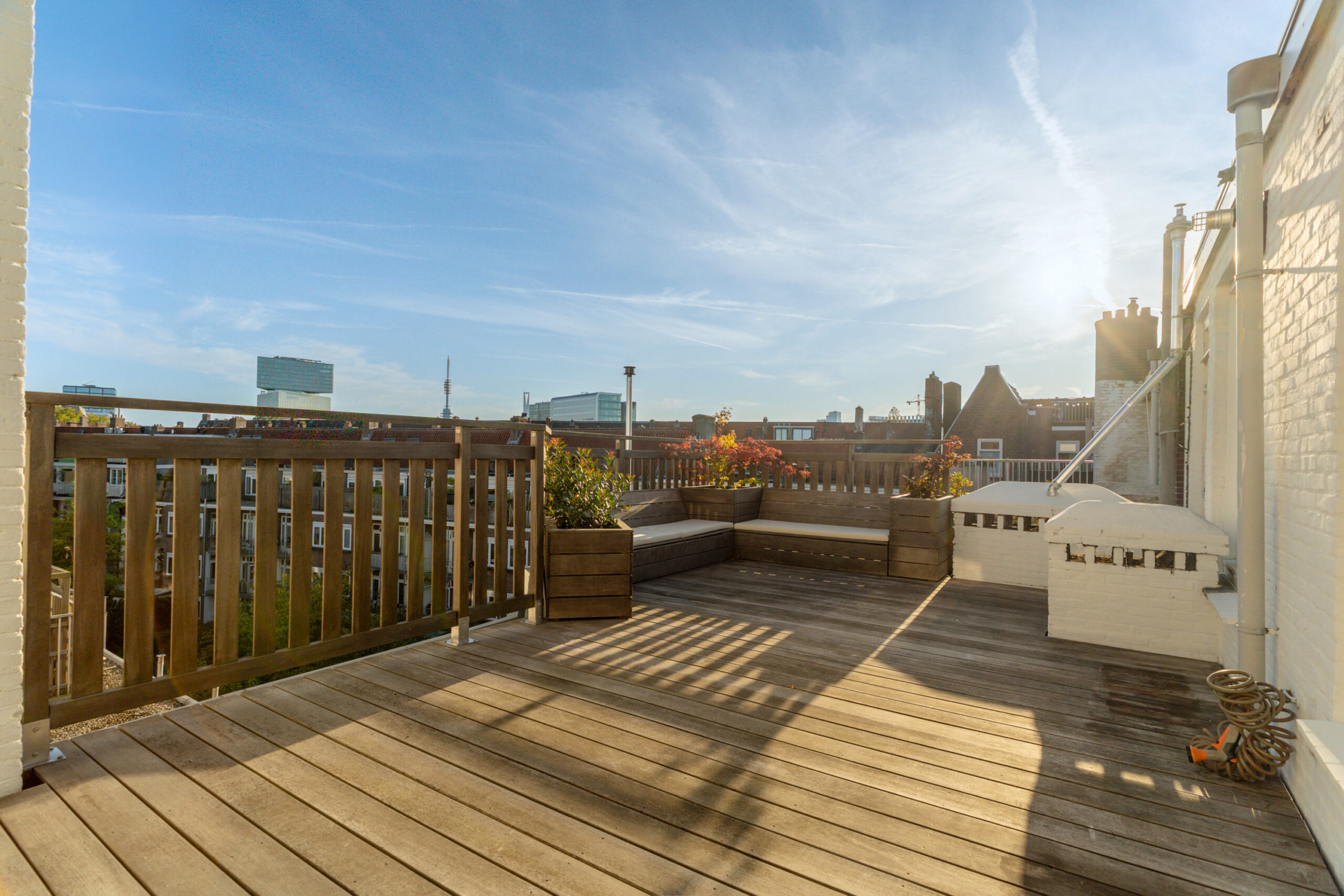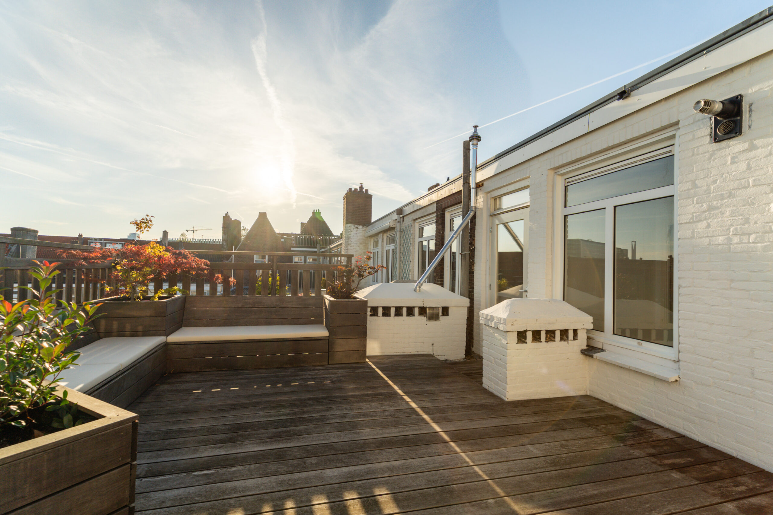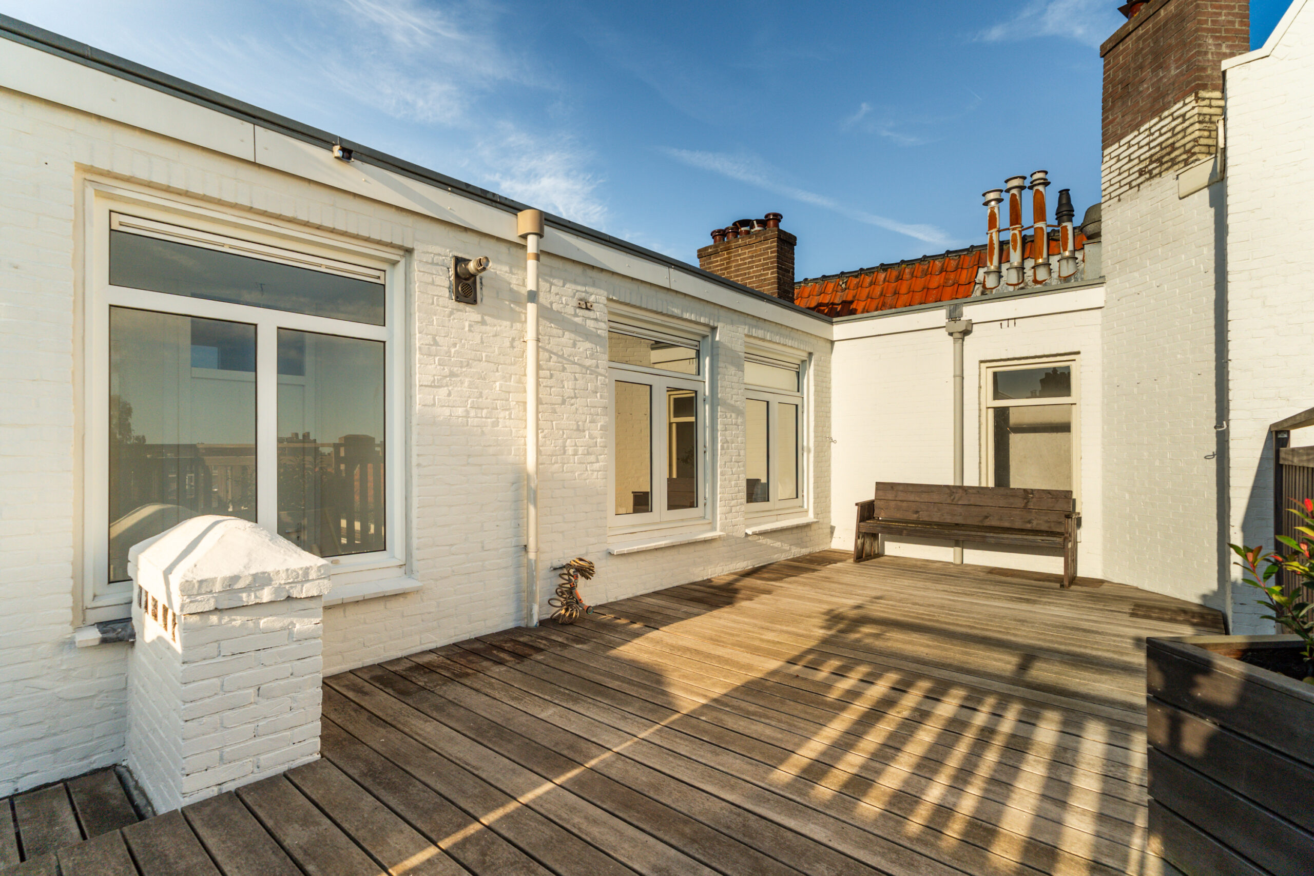 Lovely spacious duplex apartment (approx. 124m²) with 3 bedrooms, 2 bathrooms, 2 balconies and a unique large roof terrace facing southwest, where you can enjoy the sun all day. The property is located in the Rivierenbuurt in a quiet area, within walking distance of cozy terraces, coffee bars, shops, and restaurants. The ground lease has been bought off in perpetuity! Layout Second floor Entrance with stairs to the third floor. Third floor Hallway, a modern bathroom with walk-in shower, washbasin, floating toilet, and concealed connections for a washing machine and dryer. A spacious master bedroom at the front. A generous…
