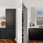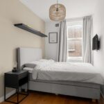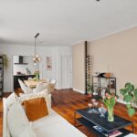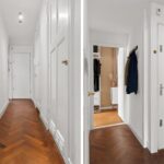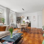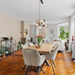 The hallway provides access to all rooms in the apartment and leads to the very spacious and bright living room facing south, with a bay window offering wide views over the street. Adjacent to the living room is a luxurious open U-shaped kitchen (renovated in 2021) equipped with built-in appliances such as a four-burner gas hob, extractor hood, dishwasher, fridge, freezer, and oven. Characteristic panel doors allow the kitchen to be closed off and add extra charm to the interior.
