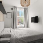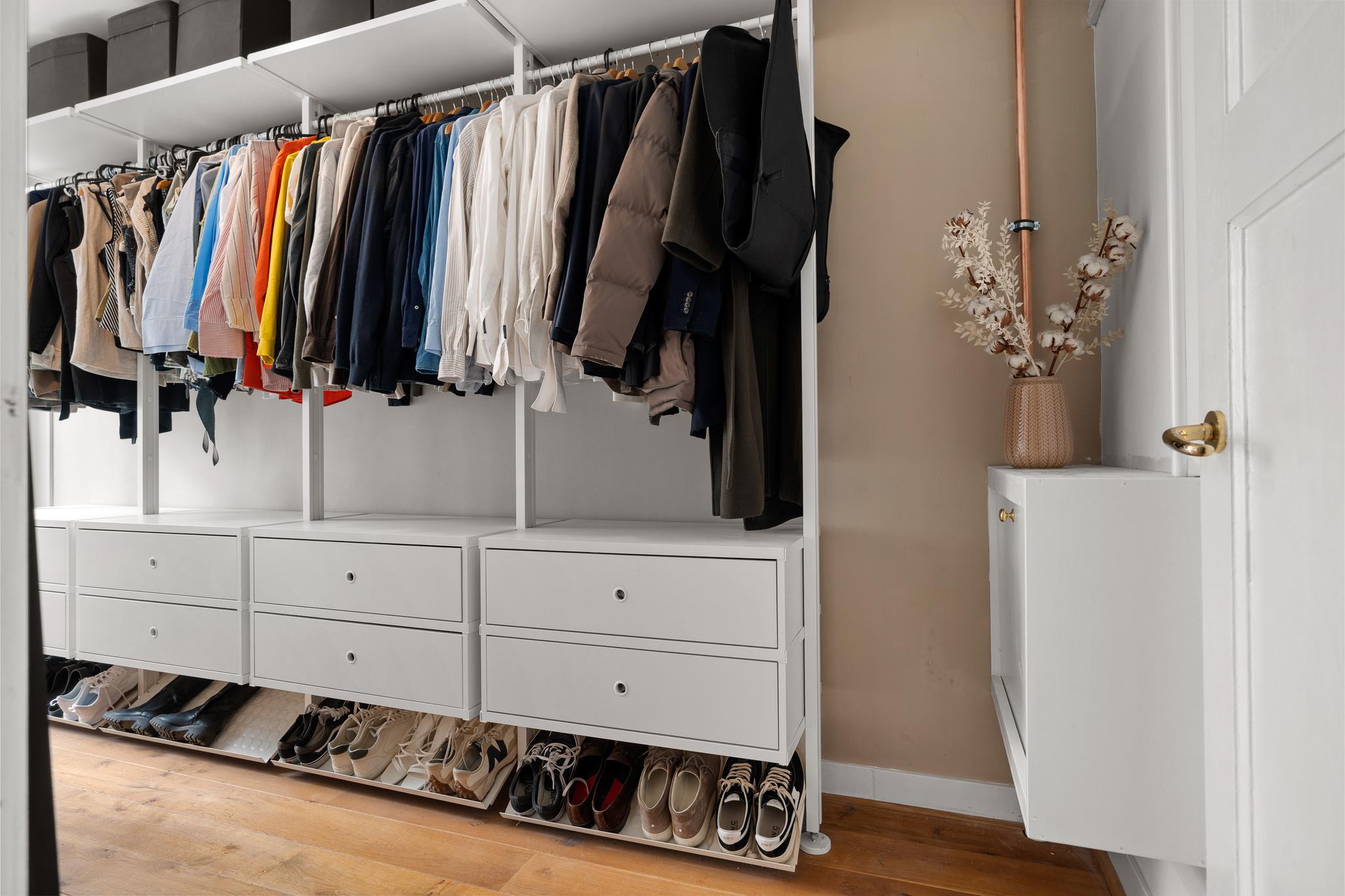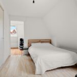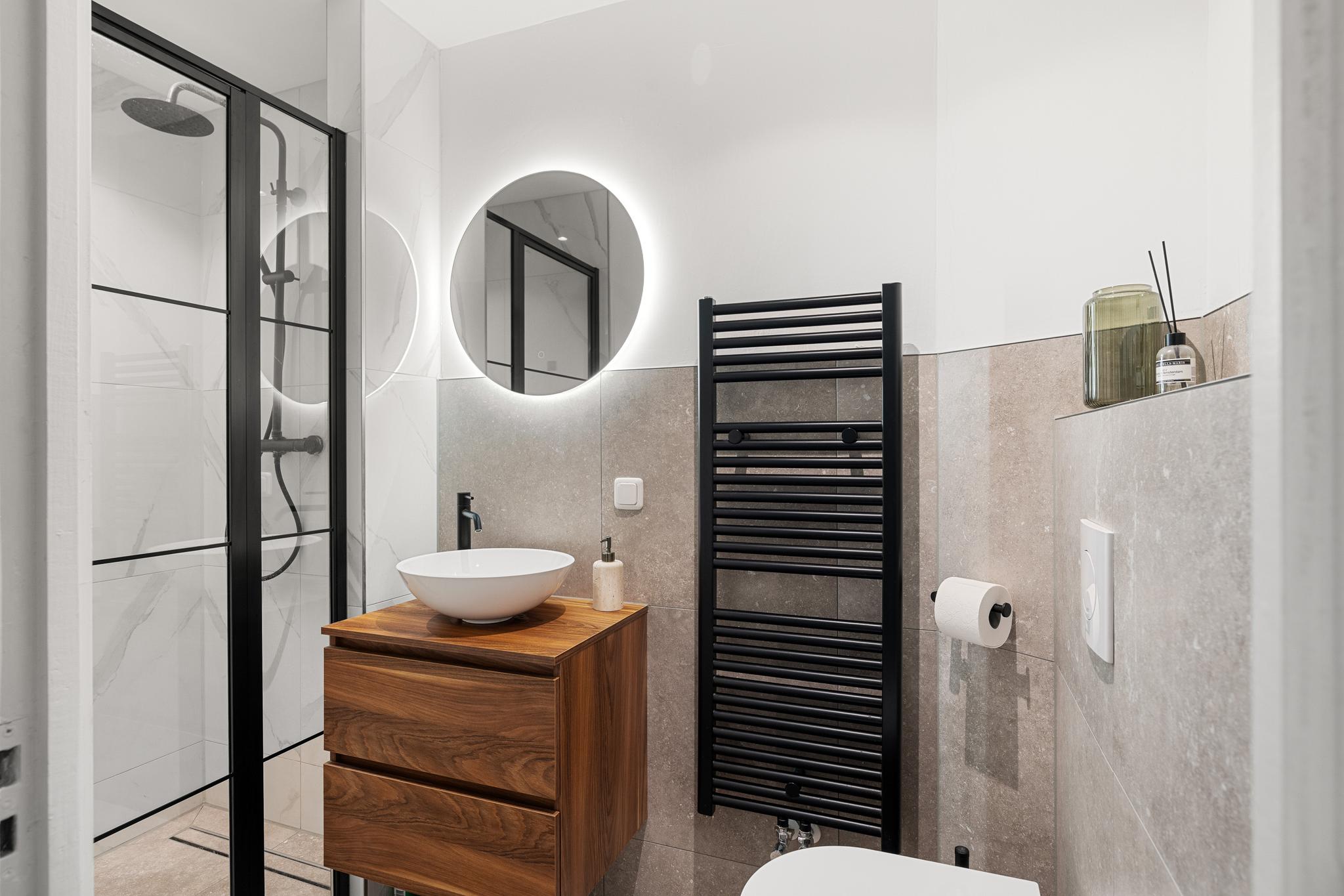 On either side of the hallway are two bedrooms. The master bedroom features a spacious built-in wardrobe. The bathroom (renovated in 2021) includes a luxurious walk-in shower, floating toilet, washbasin with vanity unit, and a designer radiator. Next to the bathroom is a separate laundry room with an Intergas central heating boiler, which was recently replaced in 2025.