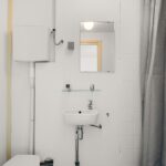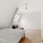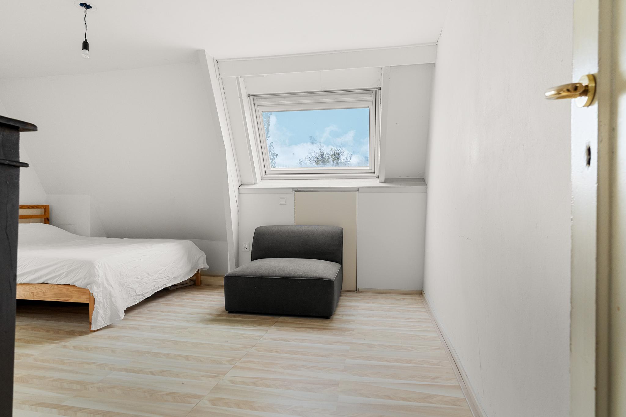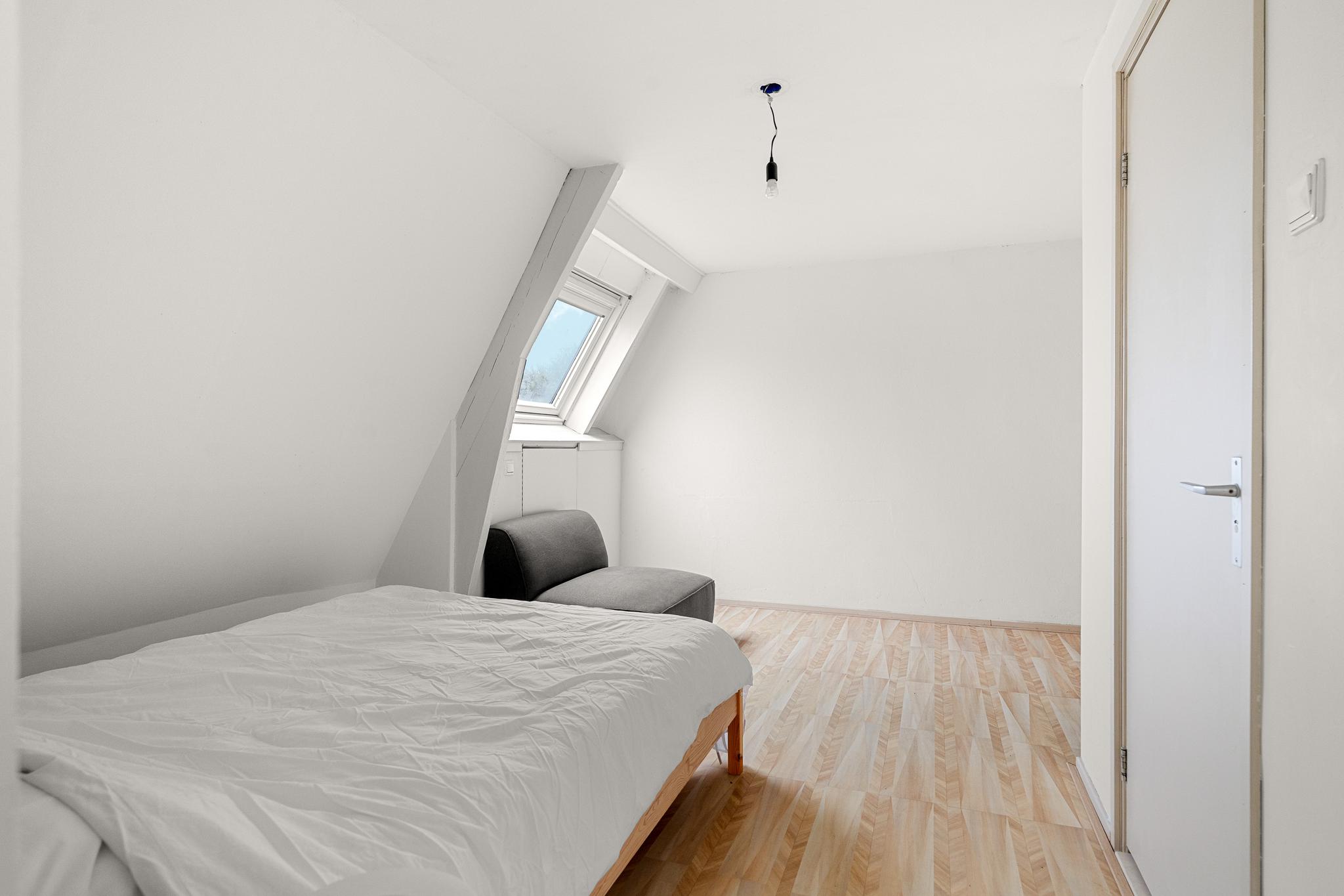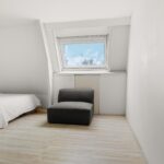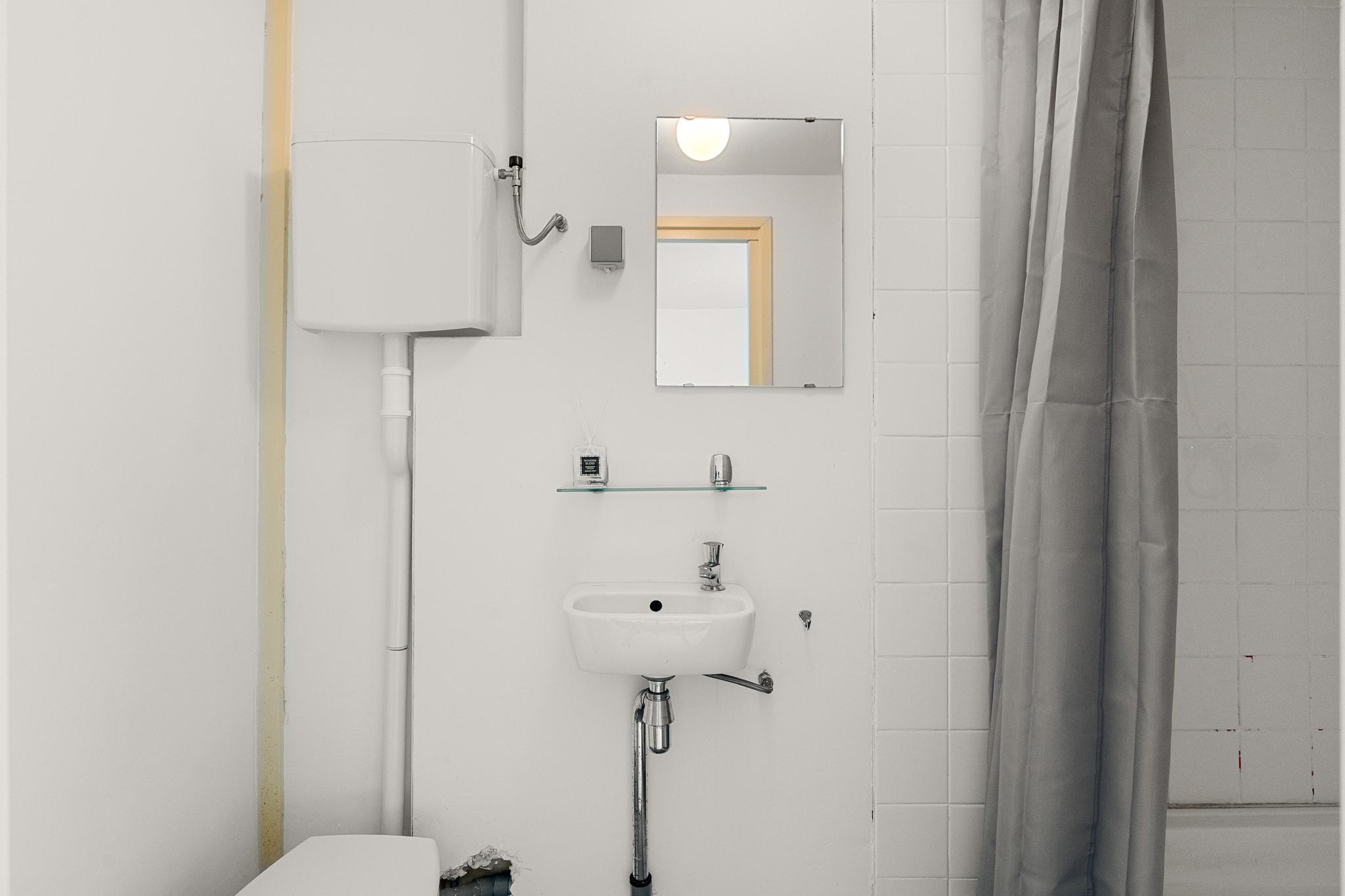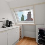 On the fourth floor is a large studio of approximately 23 m², with two Velux skylights providing natural light and ventilation. The main room is currently set up as a bedroom but would also be ideal as a workspace. The bathroom is accessible from the bedroom and includes a shower, toilet, and washbasin. At the rear of the studio is a kitchen area with a sink, from which the spacious storage room can also be accessed.
