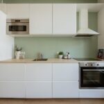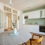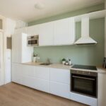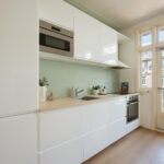 Entrance on the second floor. The hallway provides access to two separate rooms. The spacious living room is at the front of the apartment, while the closed kitchen is located at the rear. The modern kitchen is equipped with a fridge with freezer compartment, 4-burner stove, oven, dishwasher, and microwave. The kitchen opens onto the first balcony. The washing machine connection is located in a separate utility space under the stairs.