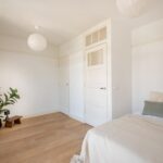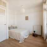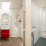 The top floor houses the two generously sized bedrooms. The rear bedroom provides access to the second balcony. The centrally located bathroom with skylight features a walk-in shower, toilet, and washbasin with cabinet.