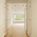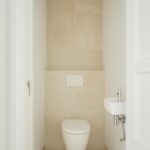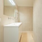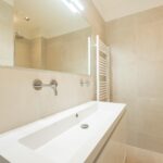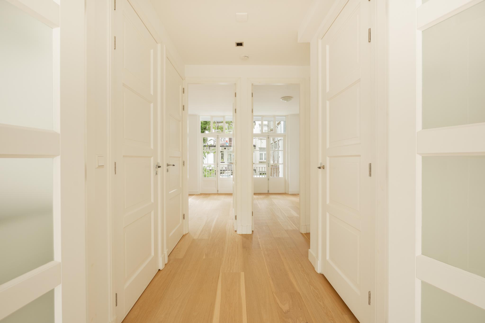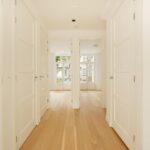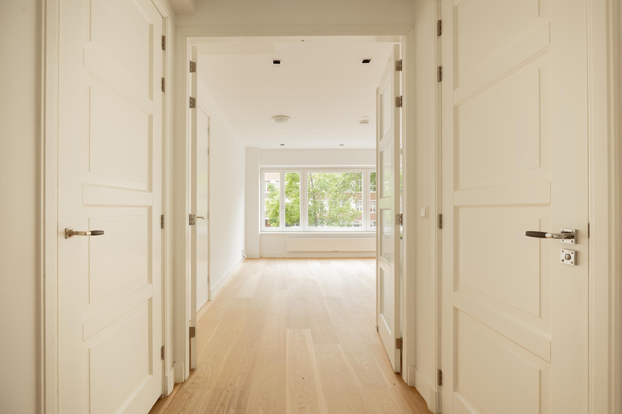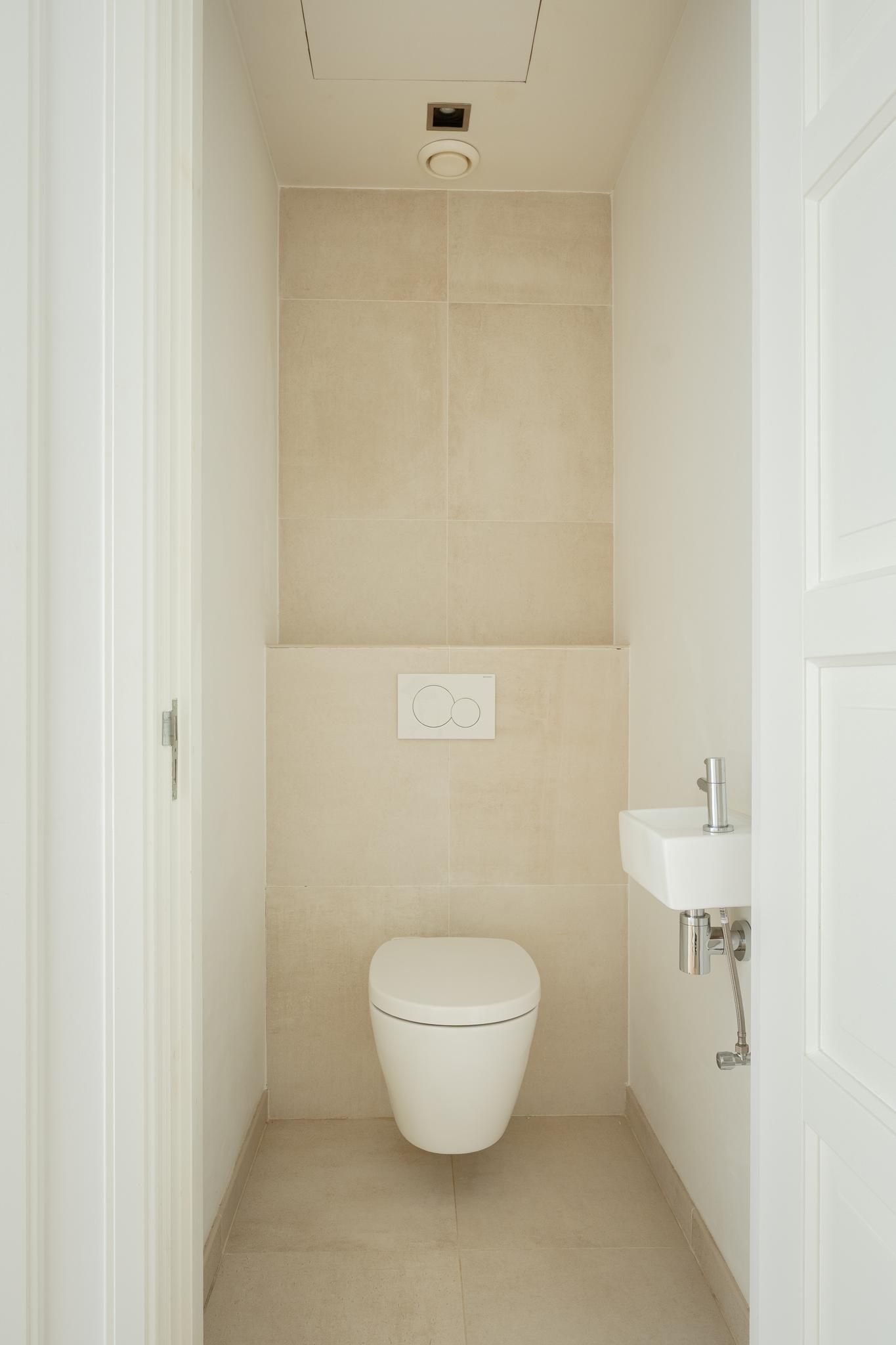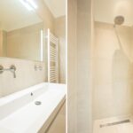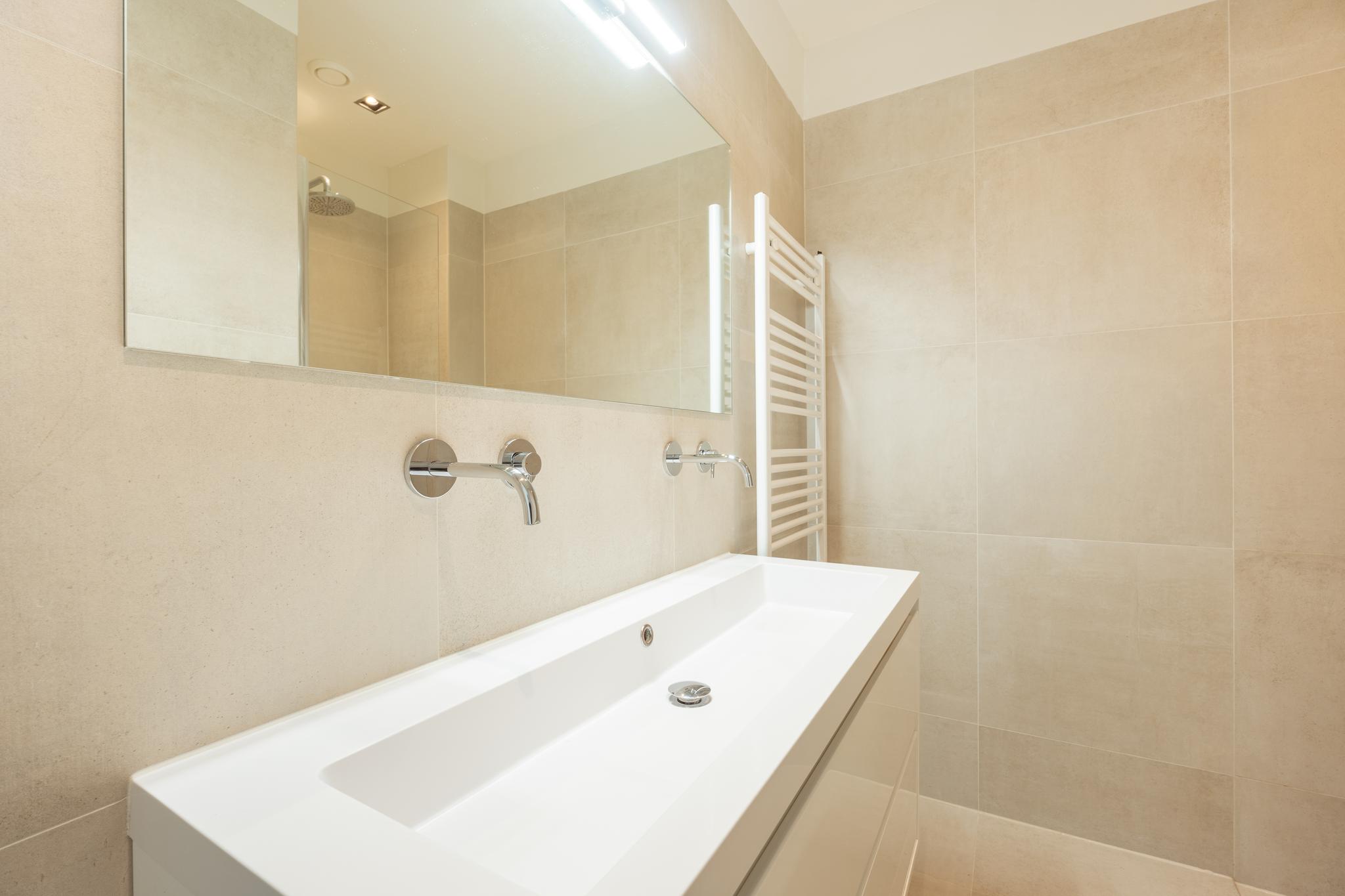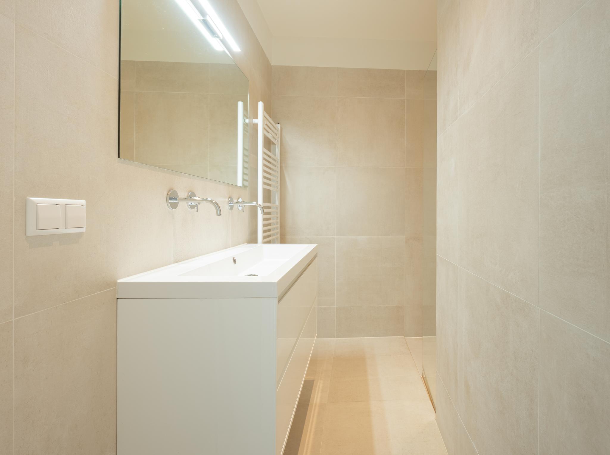 A generous central hallway provides access to the other rooms. Under-stairs storage cupboard with washing machine connection. Both bedrooms are located at the rear of the apartment. These rooms provide access to the rear-facing balcony of approximately 7 m², which spans the full width of the apartment and includes a storage cabinet housing the central heating system (Remeha Tzerra). The modern bathroom features a vanity with two mixer taps, a walk-in shower with wall-mounted shower head and hand shower, and multiple built-in ceiling spotlights. The toilet is separate and accessible from the hallway.