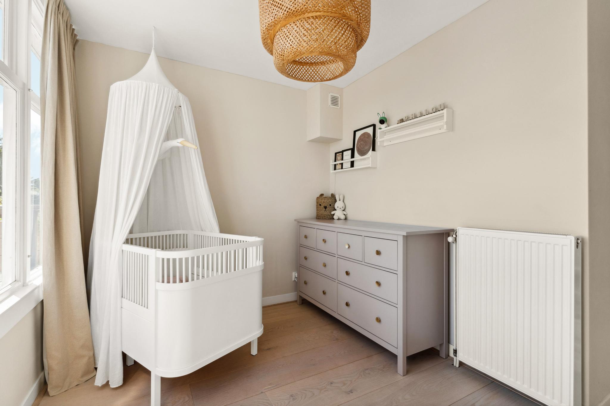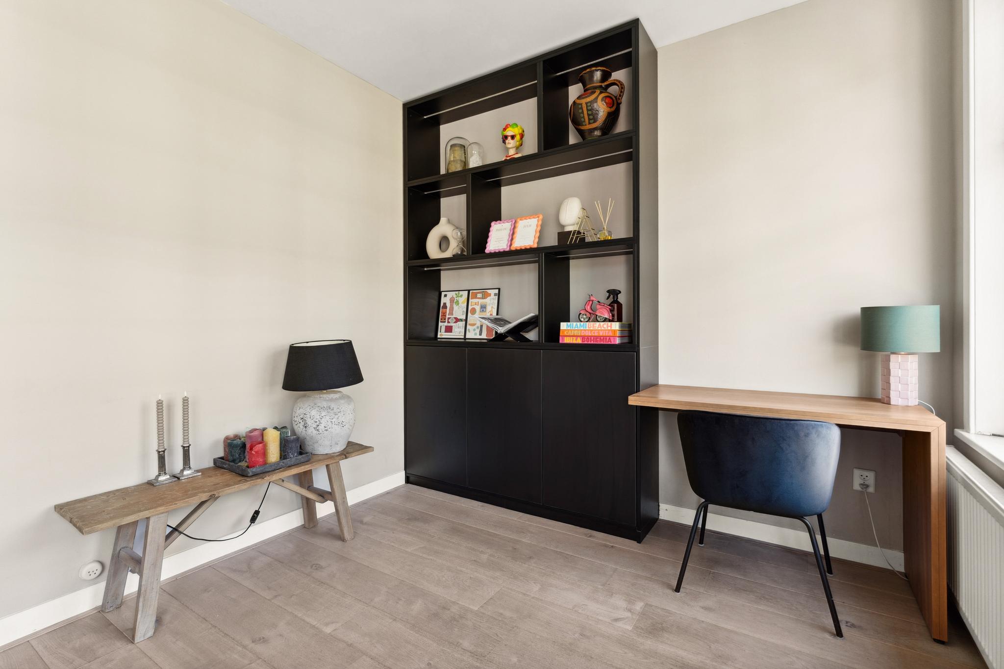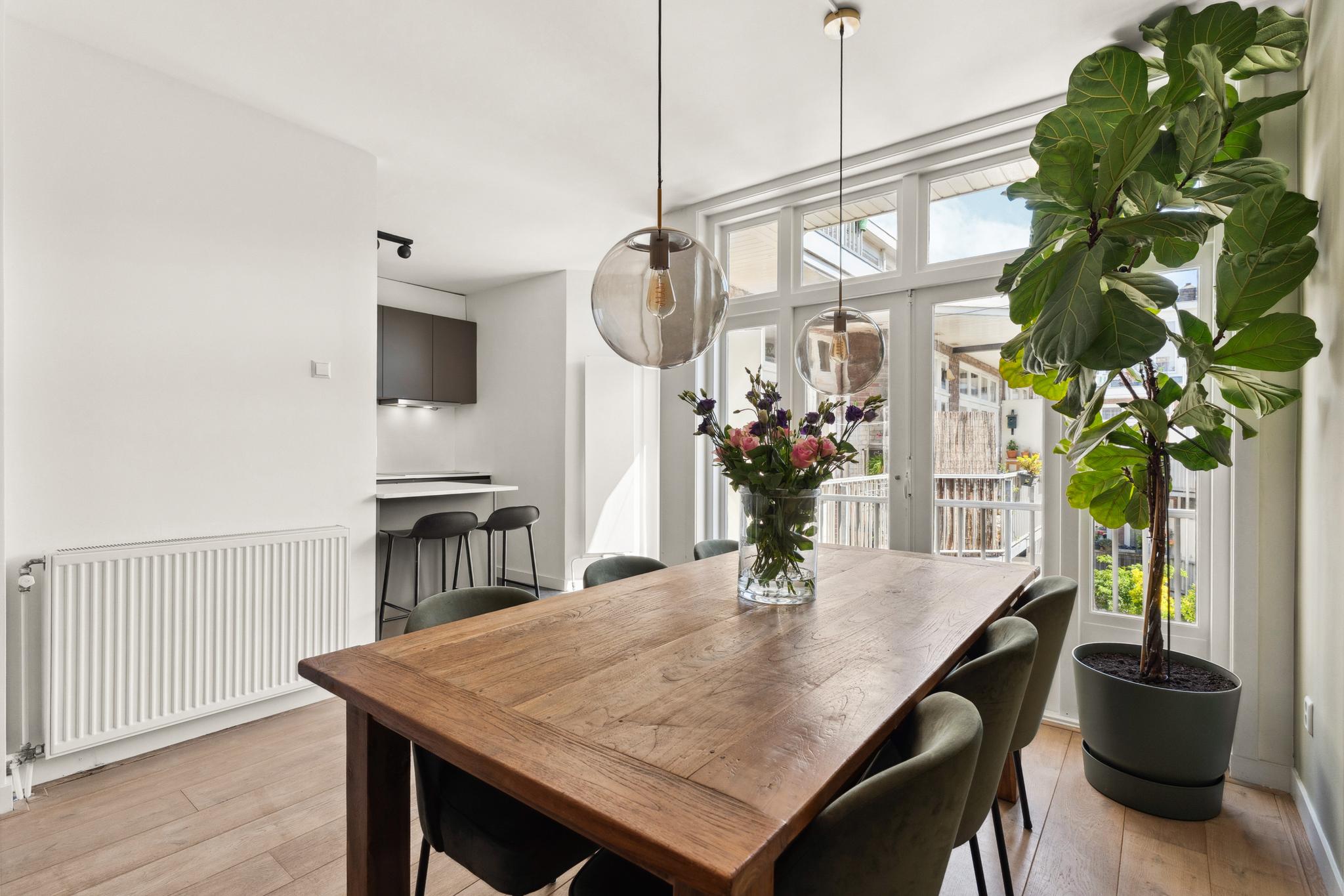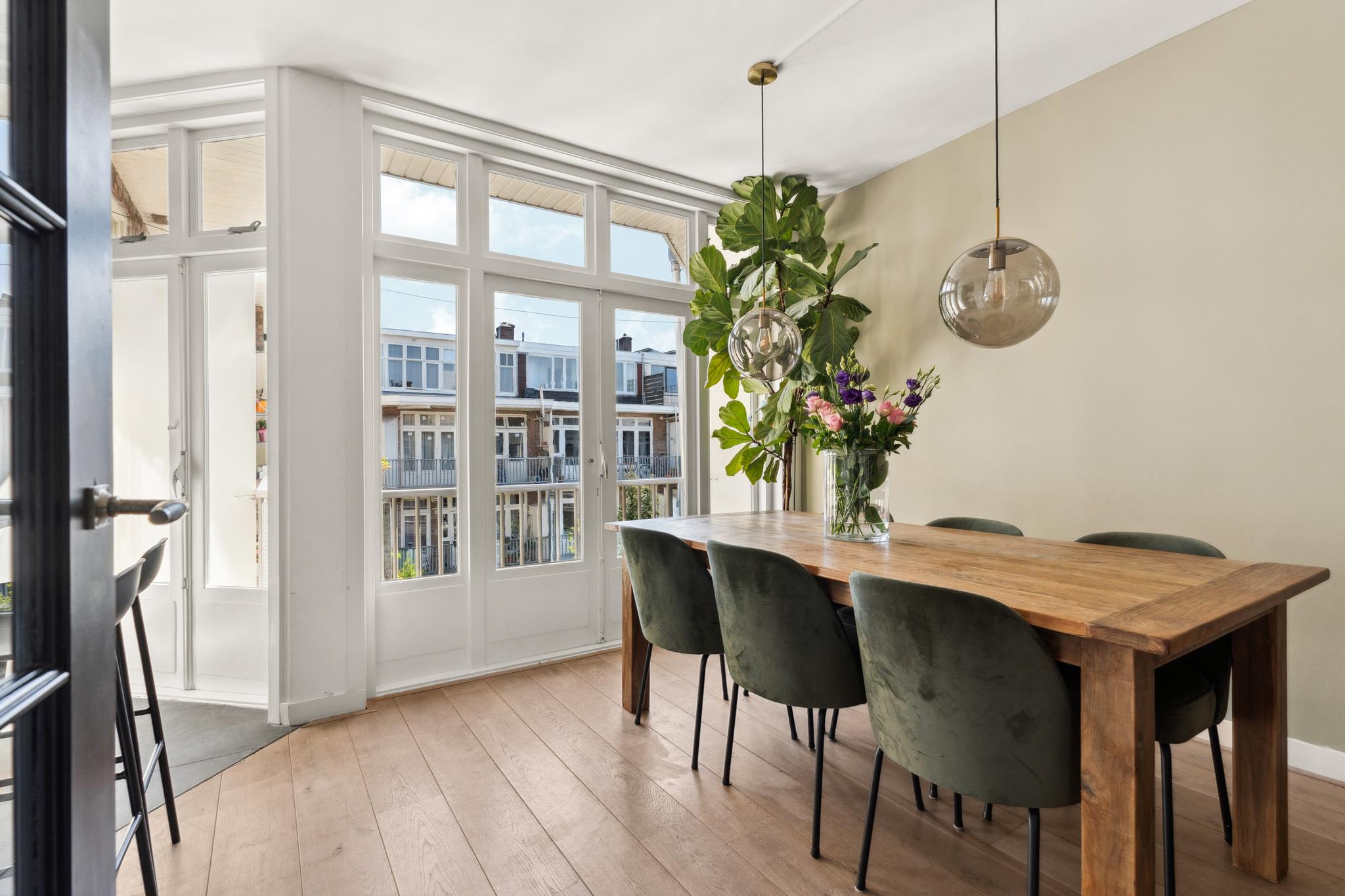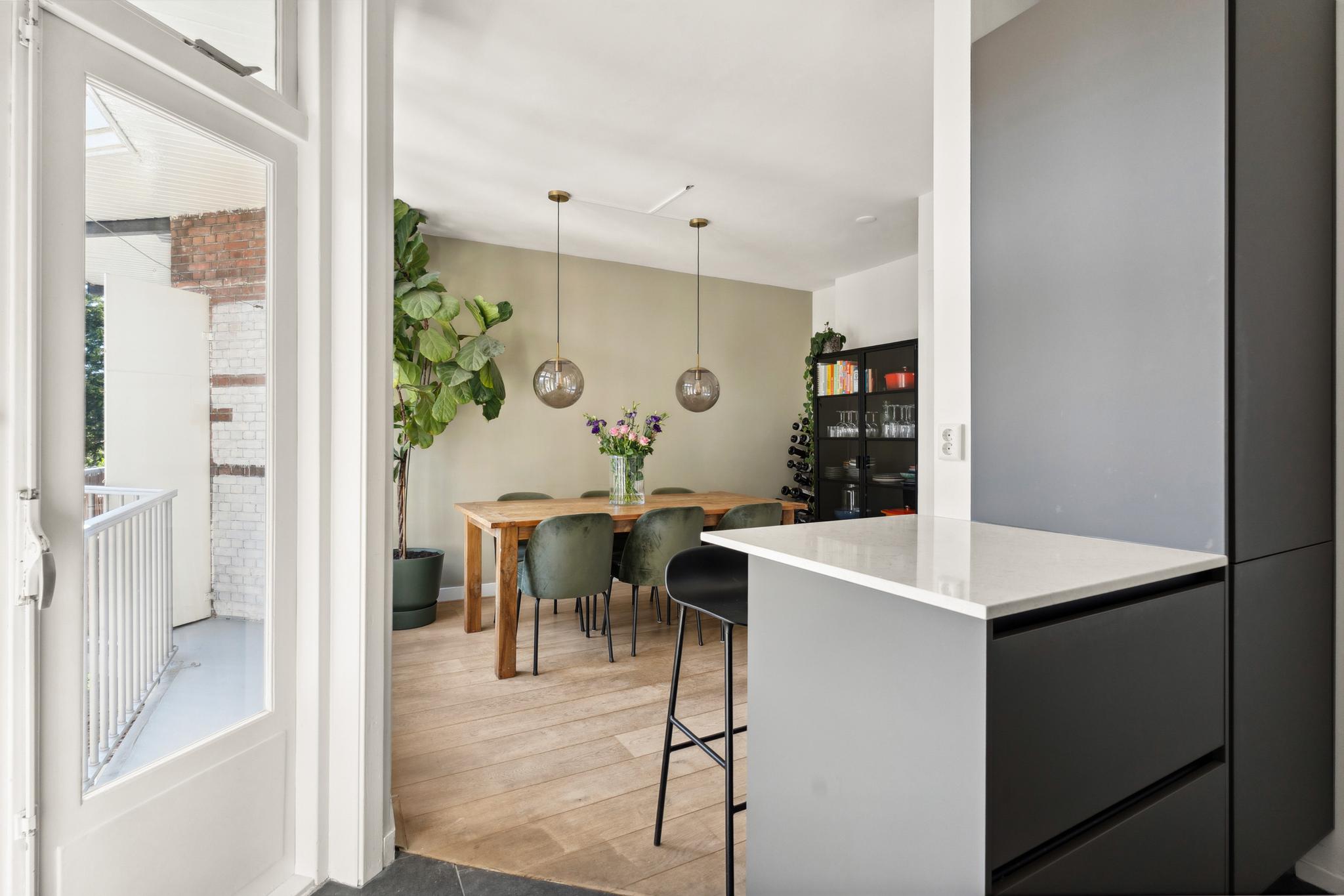 You enter into a hallway that provides access to all rooms. At the front is the bright living room with original stained-glass details. The adjacent side room has been added to the living area but can easily be closed off again to create a third (bed)room. At the rear is the dining area with a luxurious kitchen equipped with an induction cooktop, extractor hood, dishwasher, large oven, and fridge/freezer combination (all Bosch appliances). From the dining area, you have access to the balcony with morning sun. This floor also includes a separate toilet with small sink and a walk-in shower. The entire floor features a beautiful wooden floor, with tiles in the kitchen area.
