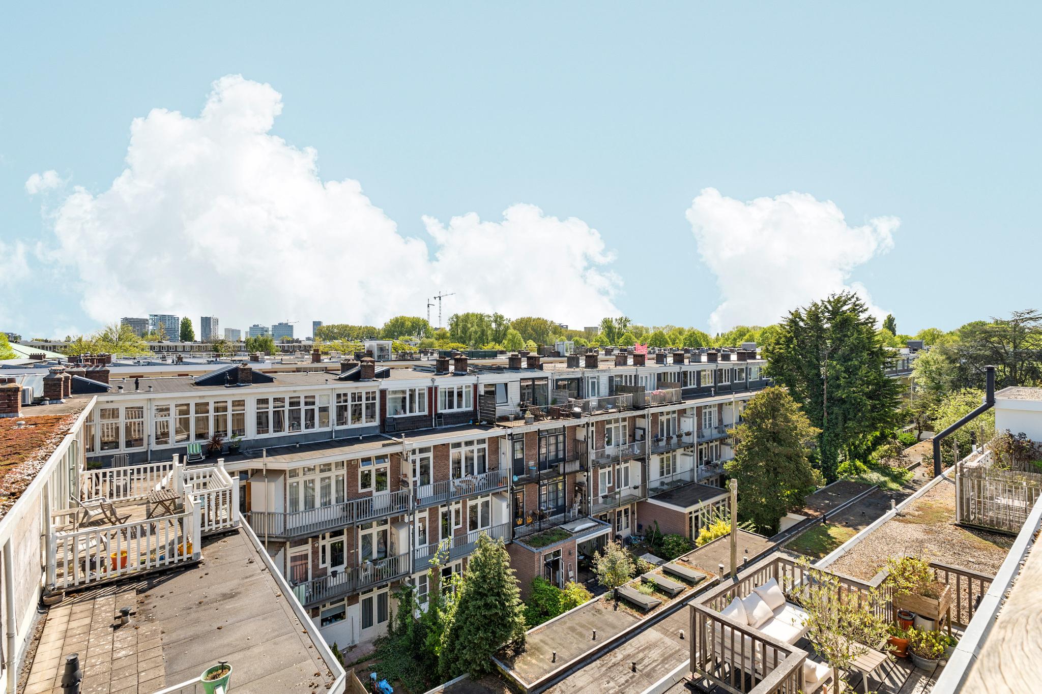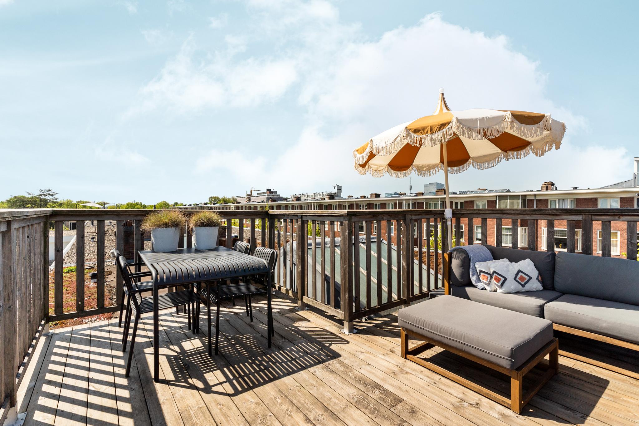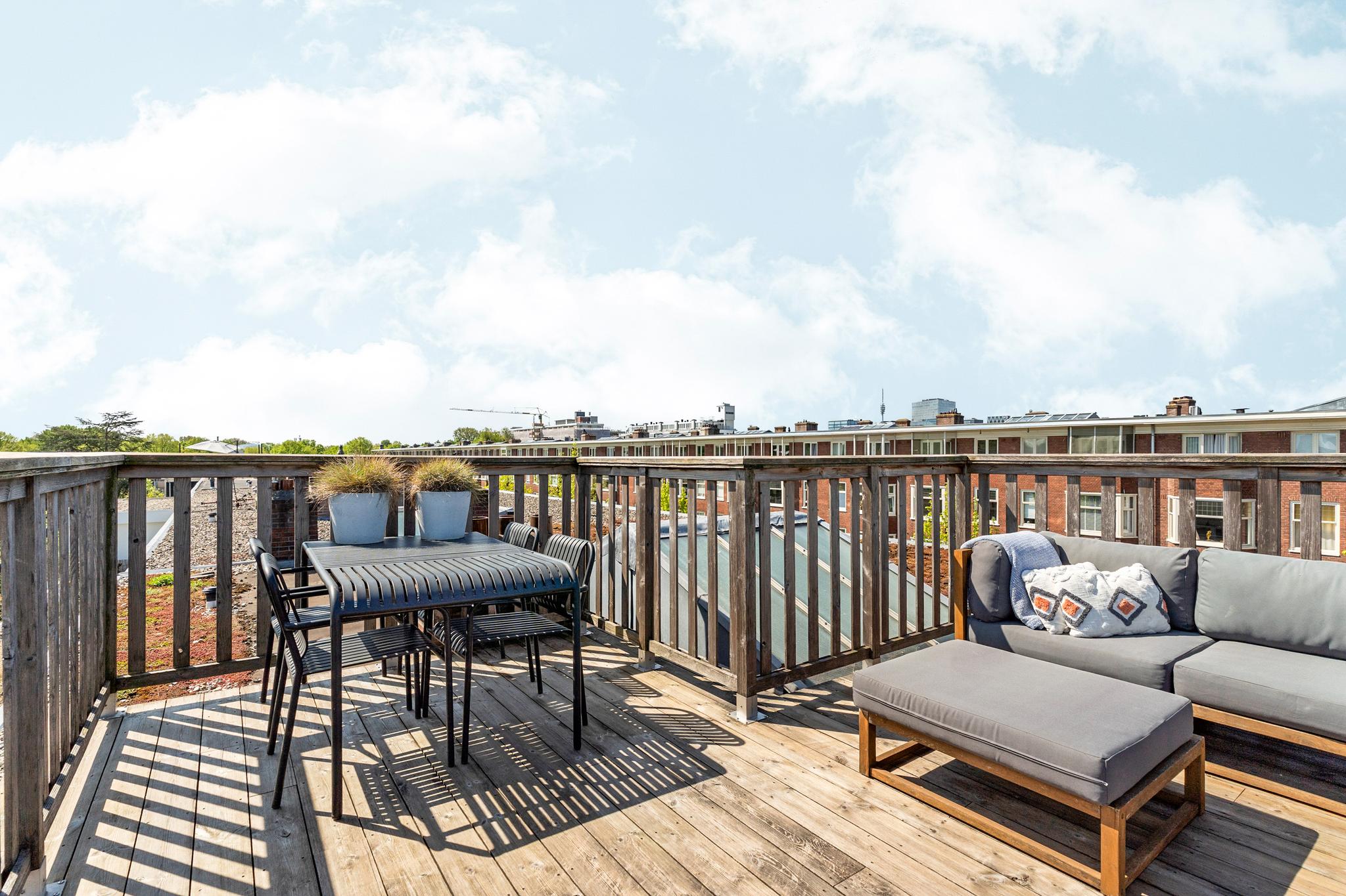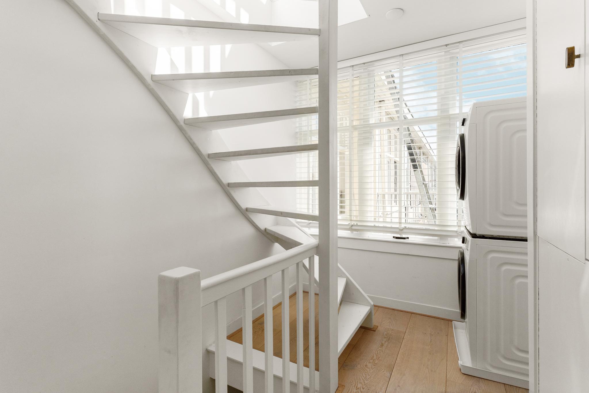 Landing with central heating unit (HR Remeha Avanta, built in 2020) and connections for a washing machine and dryer. The spacious master bedroom is located at the front and has access to the bathroom, which includes a walk-in shower, bathtub, washbasin, and toilet. The second bedroom is located at the rear, overlooking the internal gardens. The sunny roof terrace of approximately 18 sqm is a true highlight and can be accessed via a fixed staircase from the landing. The roof terrace was built with a permit in 2018.