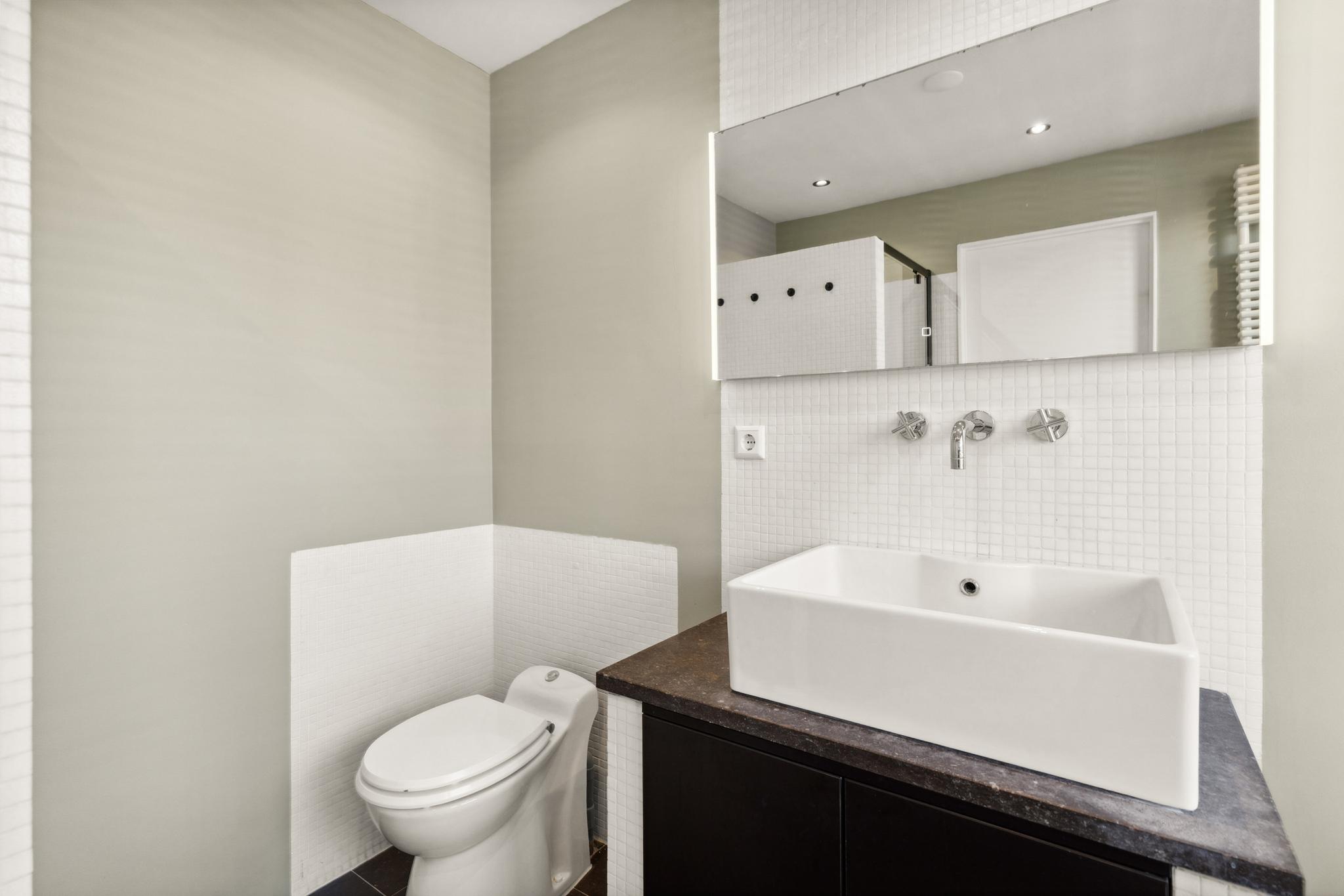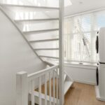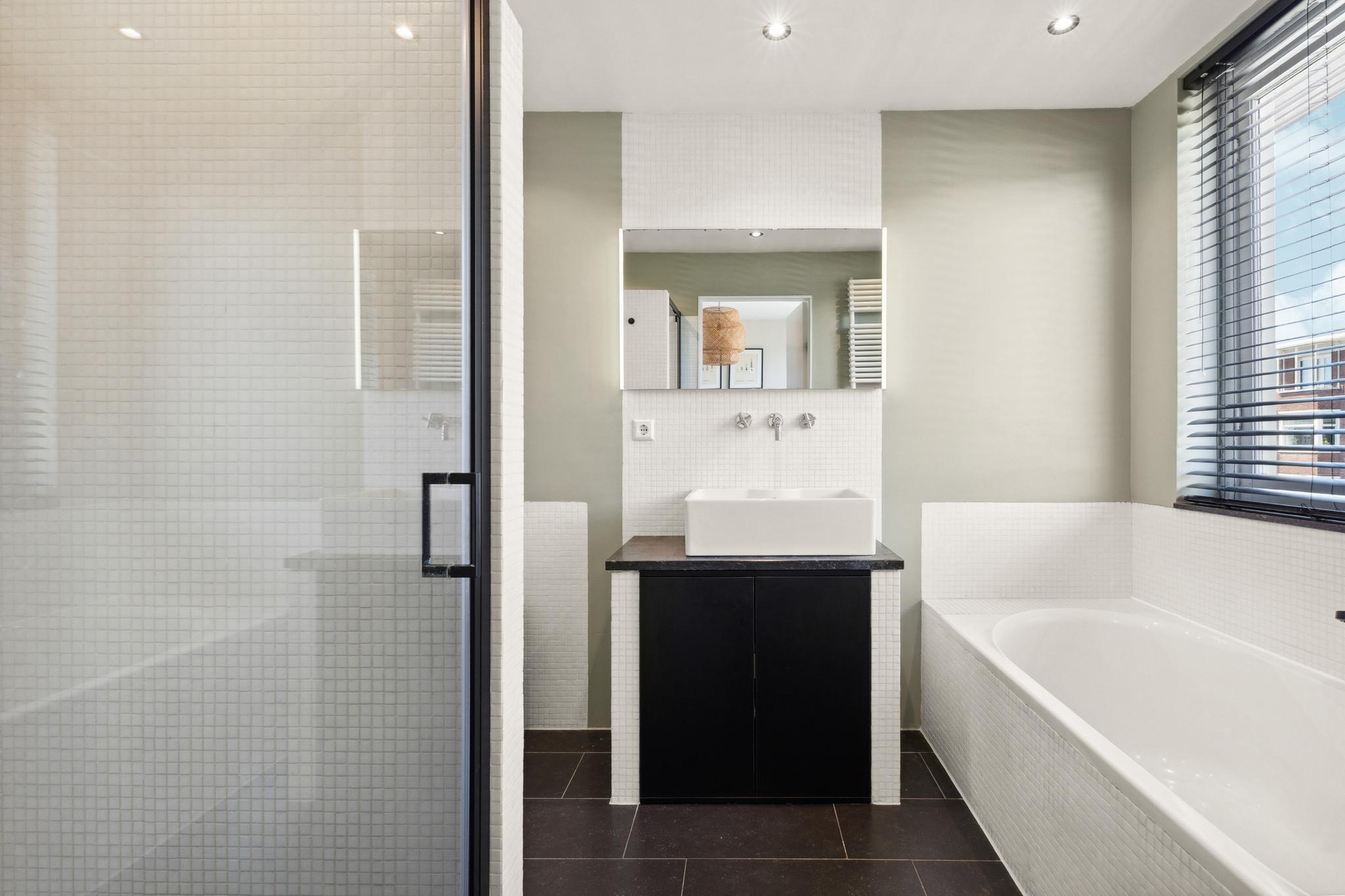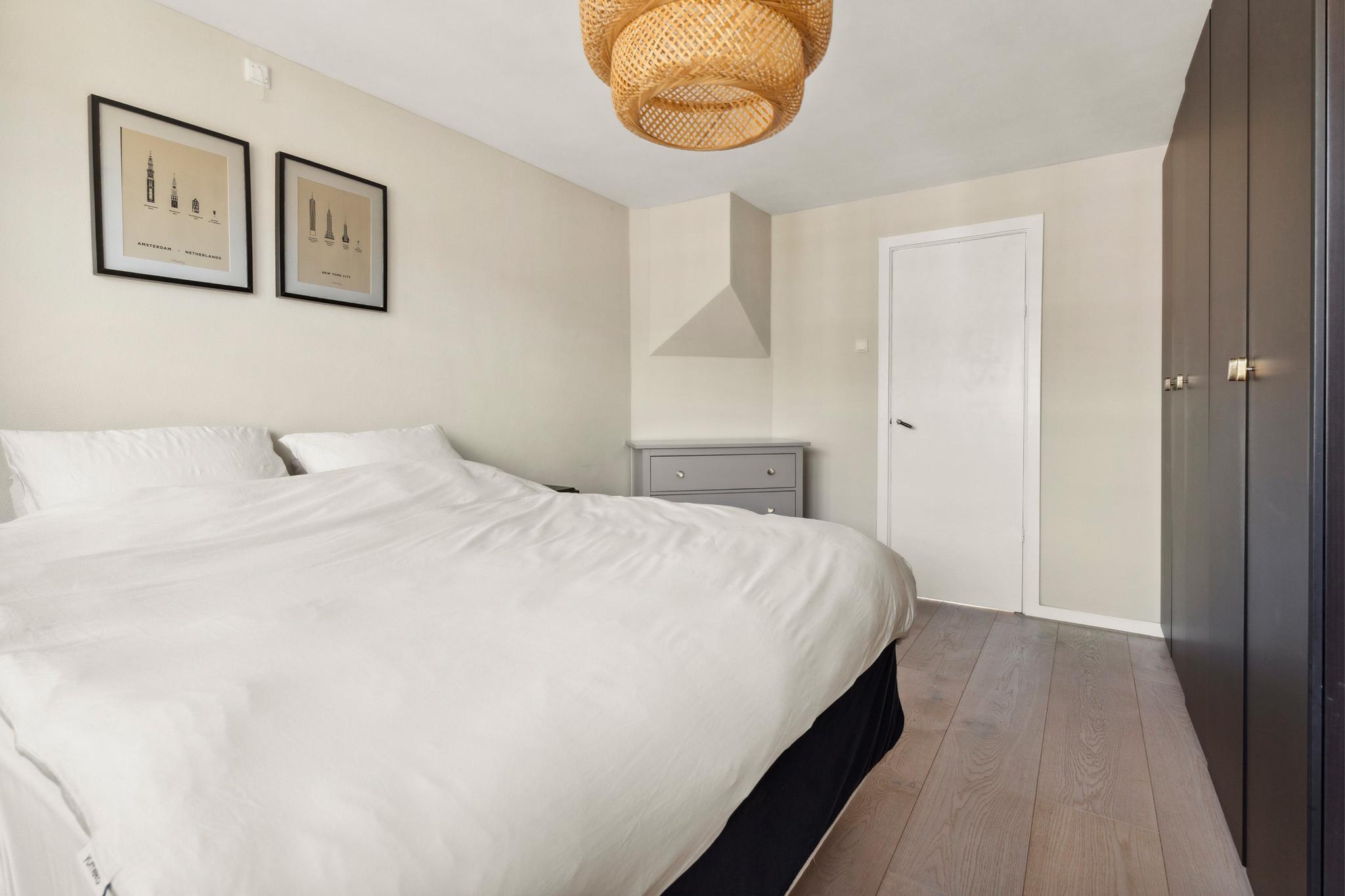 Landing with central heating unit (HR Remeha Avanta, built in 2020) and connections for a washing machine and dryer. The spacious master bedroom is located at the front and has access to the bathroom, which includes a walk-in shower, bathtub, washbasin, and toilet. The second bedroom is located at the rear, overlooking the internal gardens. The sunny roof terrace of approximately 18 sqm is a true highlight and can be accessed via a fixed staircase from the landing. The roof terrace was built with a permit in 2018.