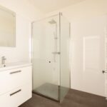 In the middle of the home is the bathroom, fitted with a walk-in shower, sink with mirror, and a designer radiator. There is also a separate toilet and a laundry area. At the rear of the property are the two bedrooms.