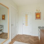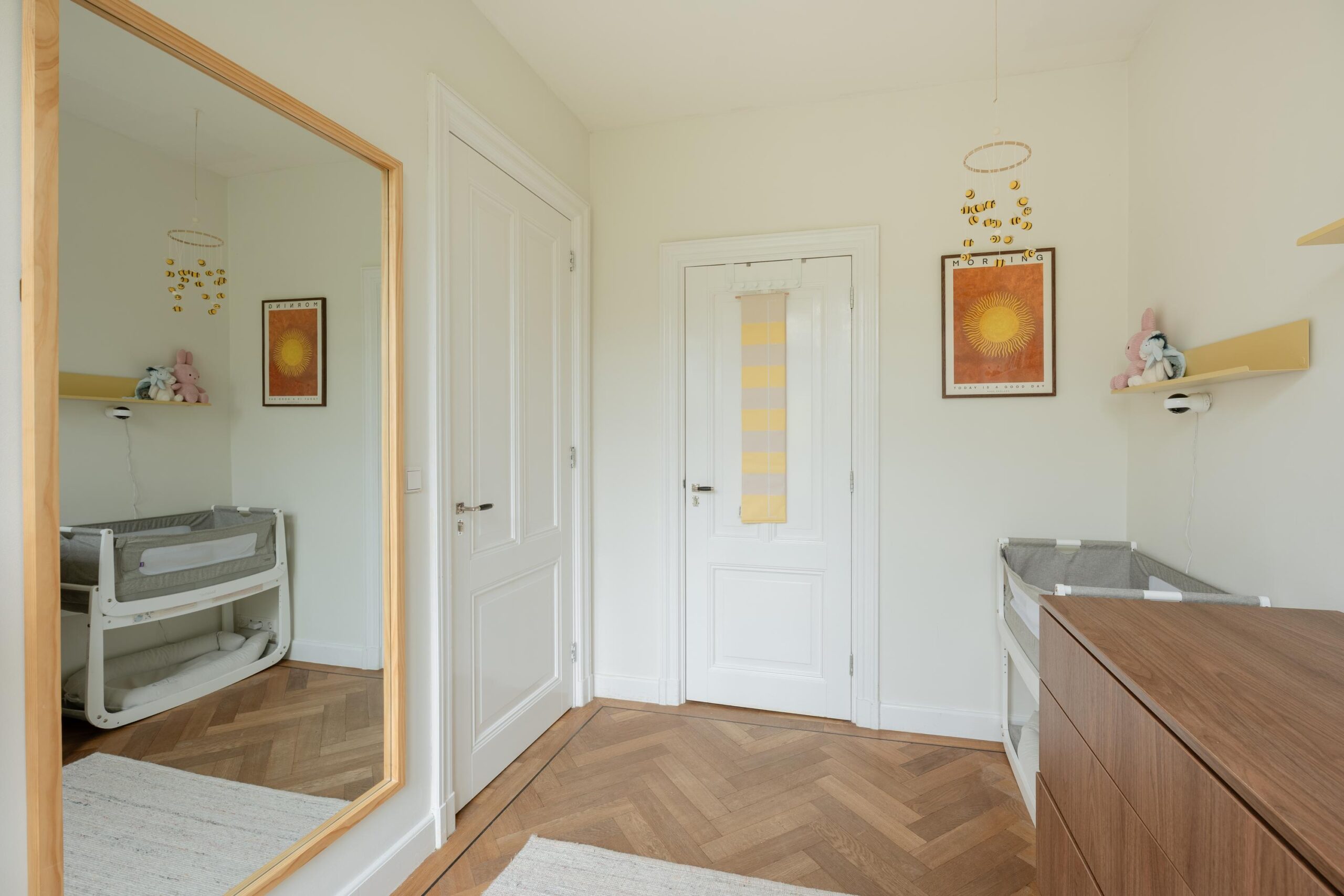 The entrance to the apartment is on the 3rd floor, where a functional landing provides access to a separate toilet with washbasin and the spacious through-living room. The living room has a balcony at the front. Thanks to the high ceilings combined with the large windows, the apartment feels very spacious.