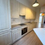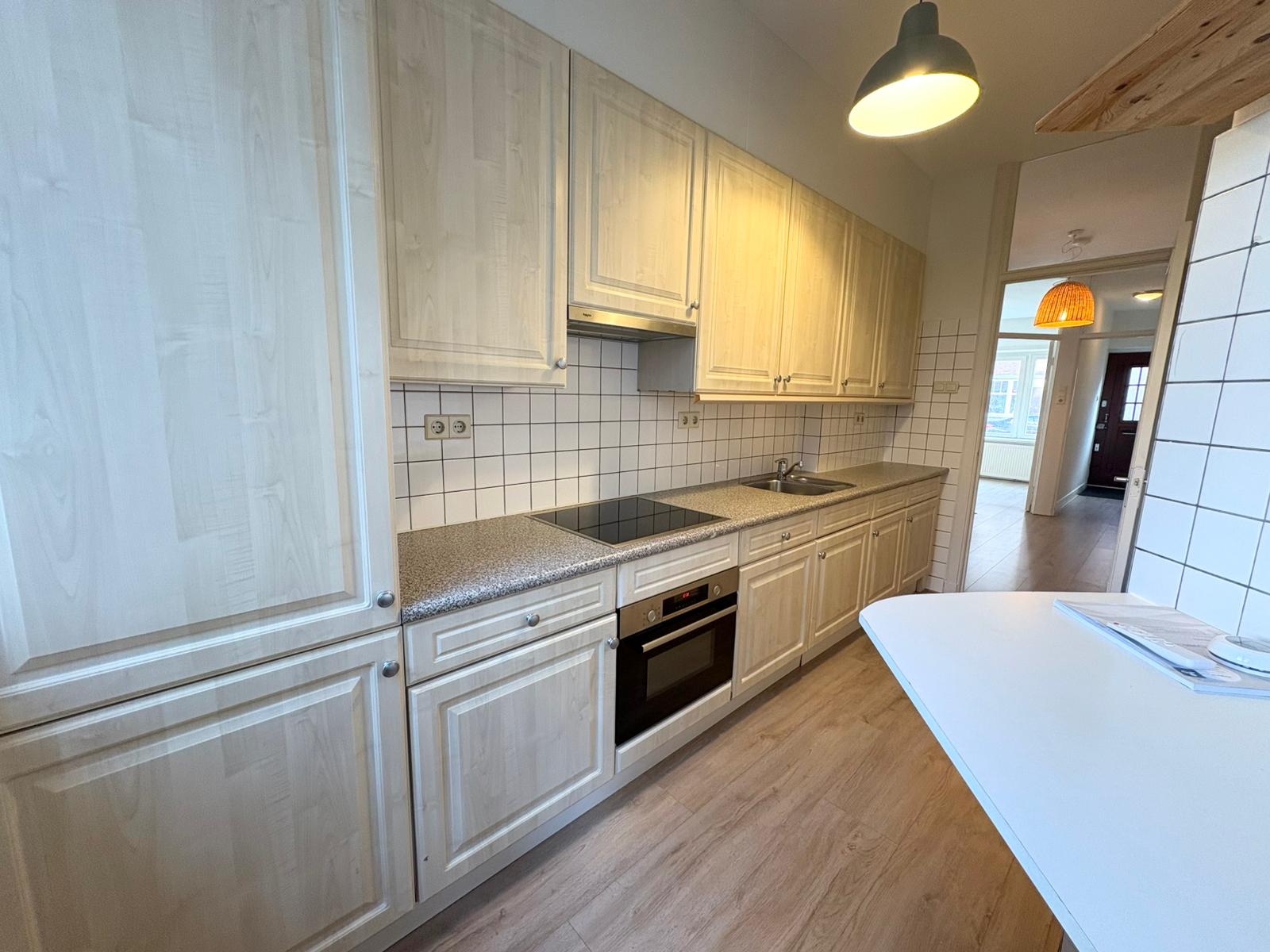 The kitchen is equipped with various built-in appliances and also offers access to the garden.