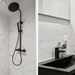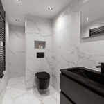 - Modern bathroom with walk-in shower and vanity unit;