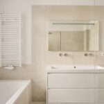 Double doors lead to an additional room at the rear, suitable as a bedroom or lounge, with direct access to the sunny balcony. Hallway gives access to the generous bathroom and separate toilet. The bathroom includes a vanity unit with double taps and illuminated mirror, a bathtub with hand shower, walk-in shower, toilet, and bidet. The ceiling features built-in spotlights.A second bedroom is accessible from the hallway, with double doors opening onto the balcony.