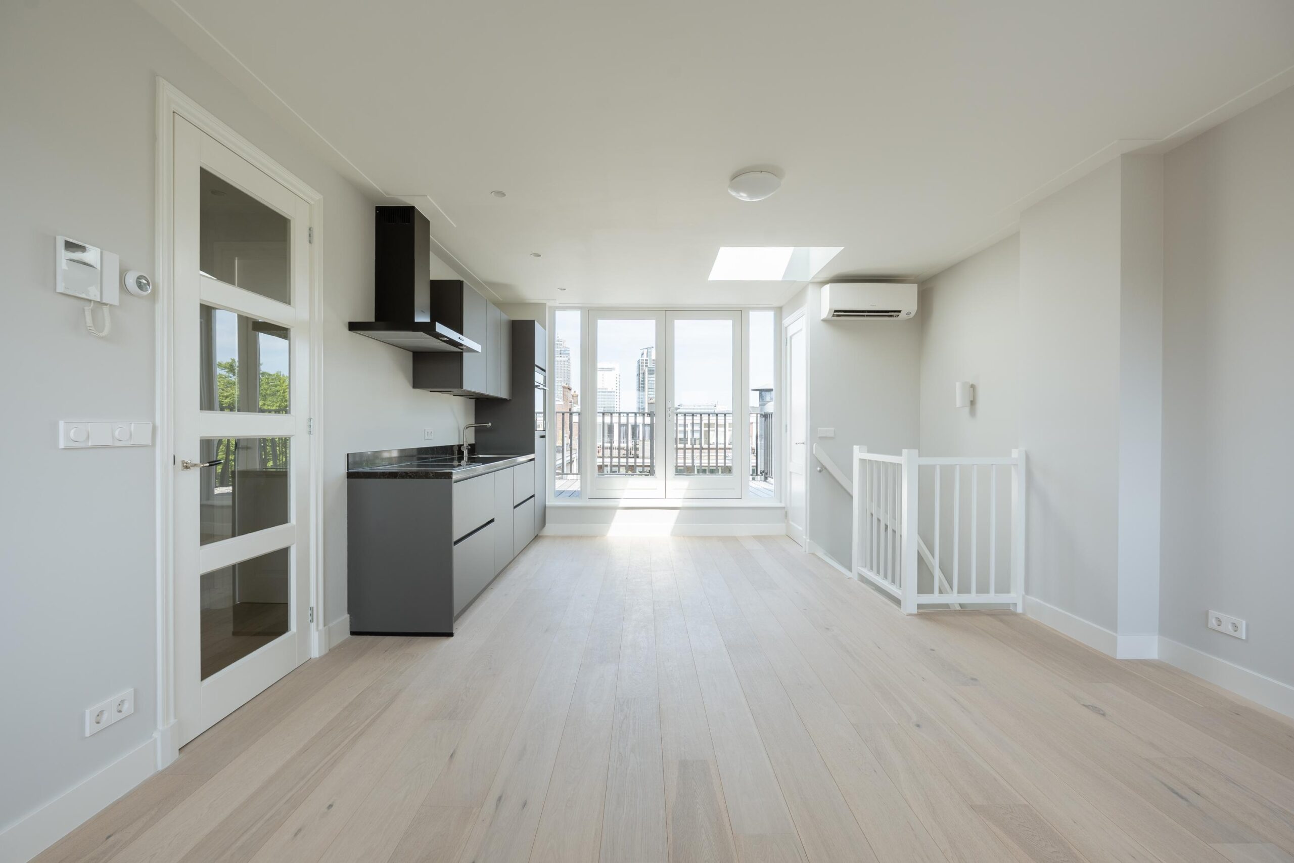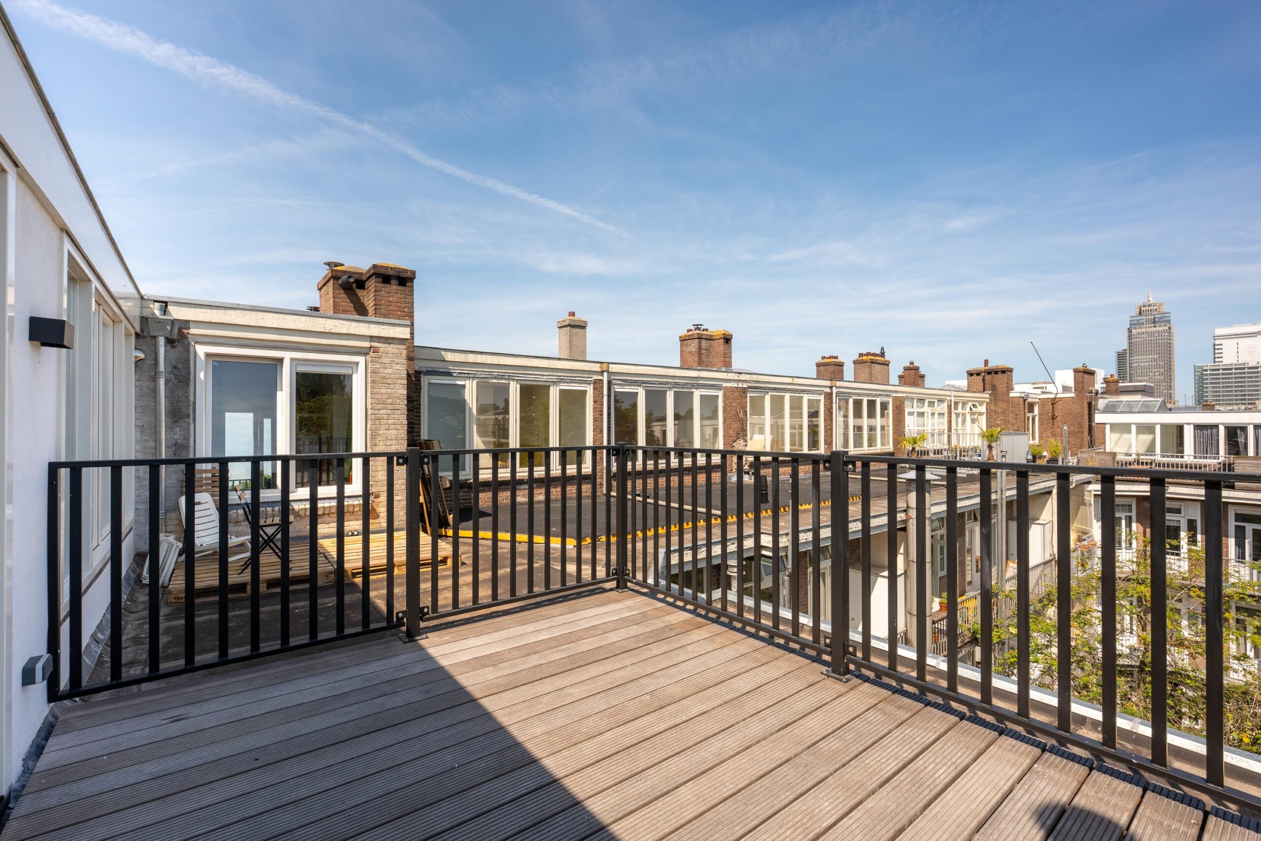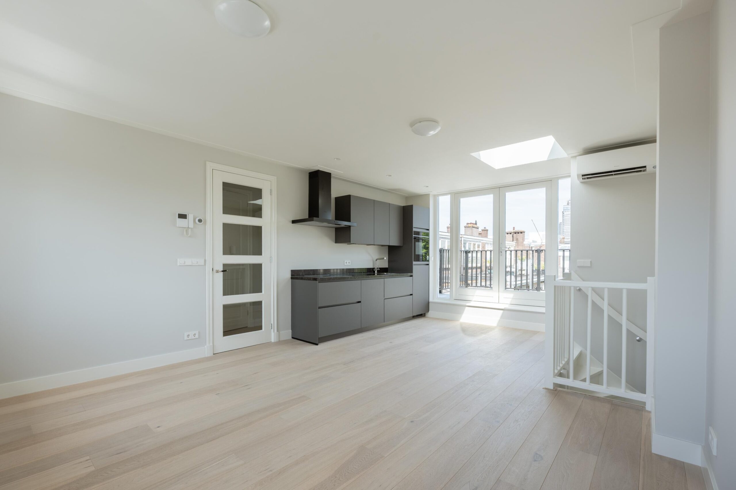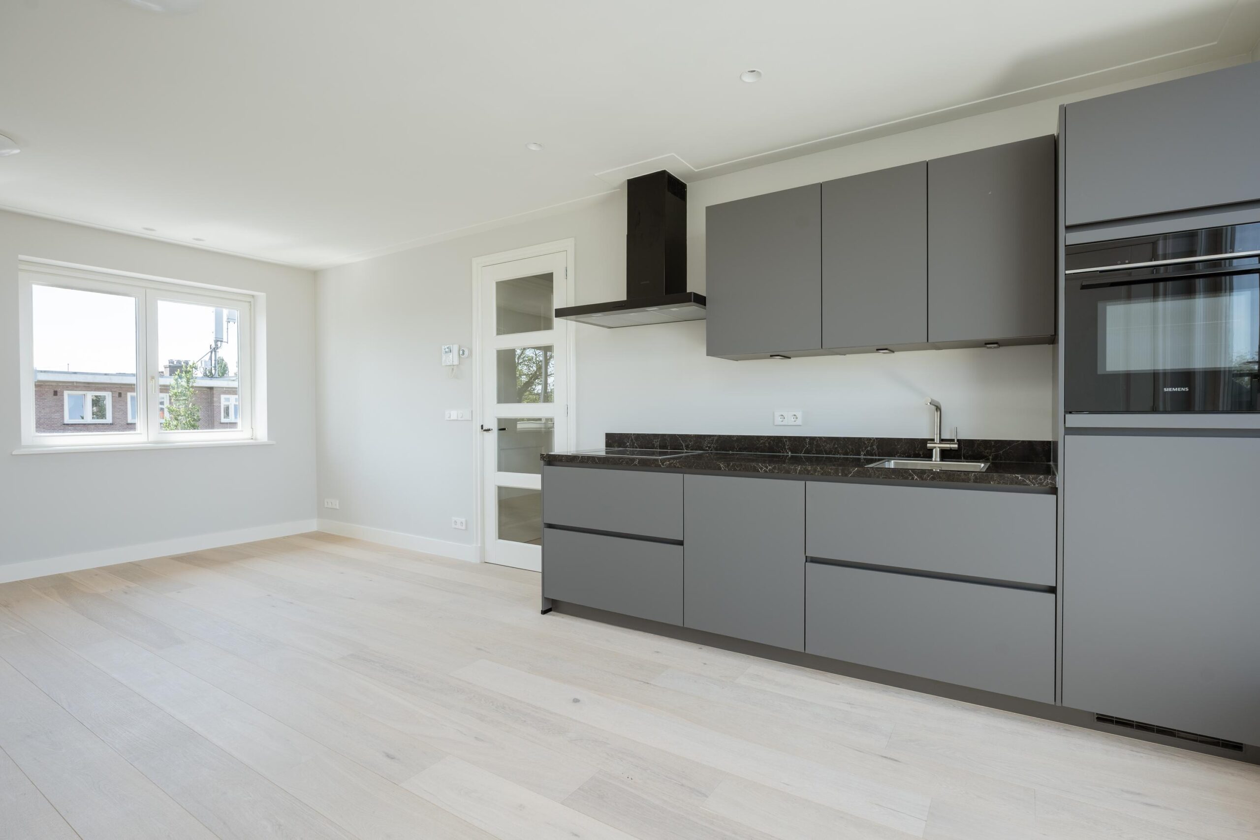 Bright through-living room with open kitchen. The kitchen is fitted with a 4-burner induction hob, extractor hood, dishwasher, fridge with freezer compartment, and a combination oven/microwave (all Siemens). French doors open onto the roof terrace of approx. 15 m², which includes lighting, electrical outlets, and a water connection. The central heating system (Intergas HRE, built in 2024) and washing machine connection are concealed in a cupboard accessible from the living room.