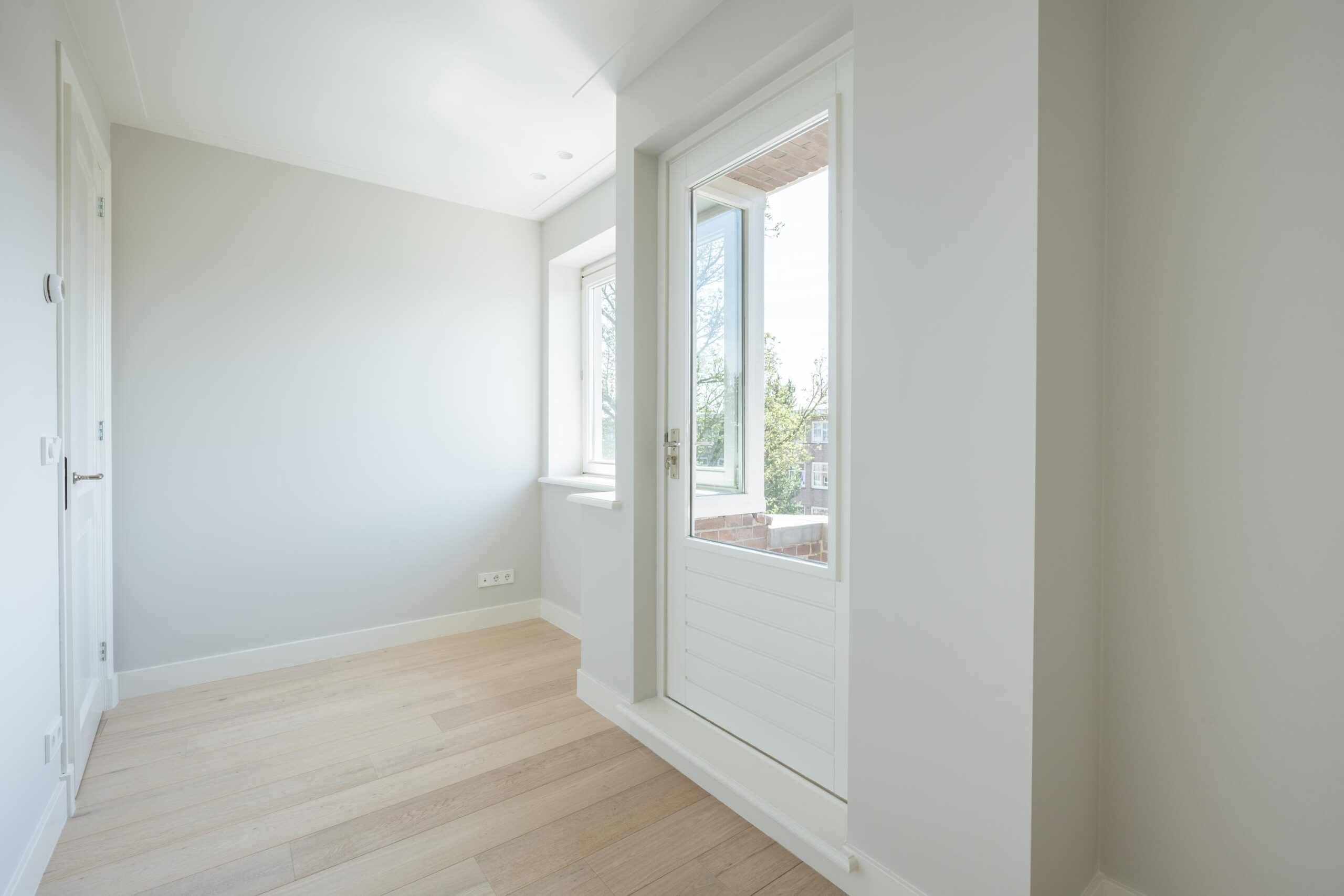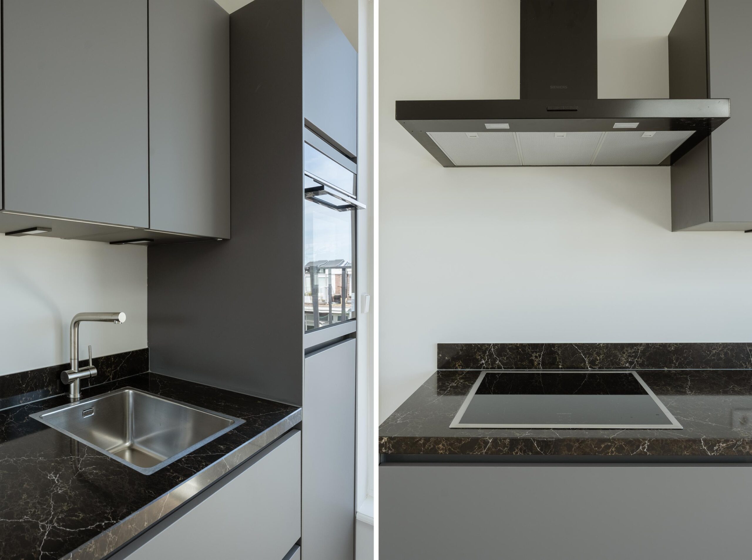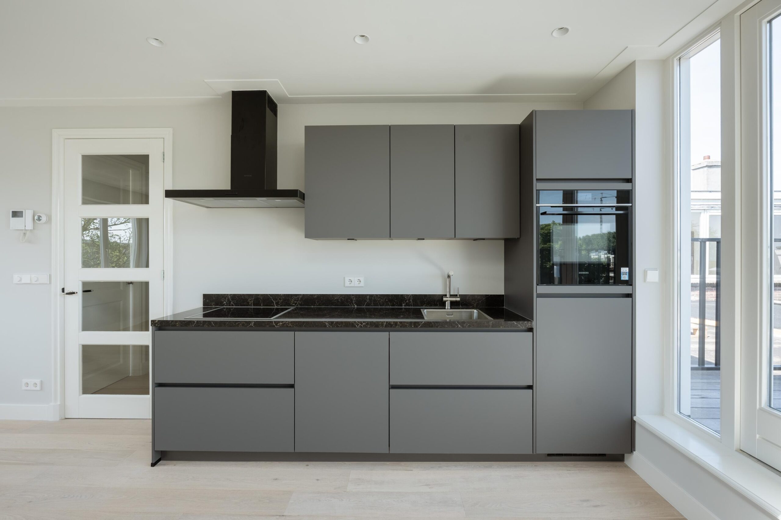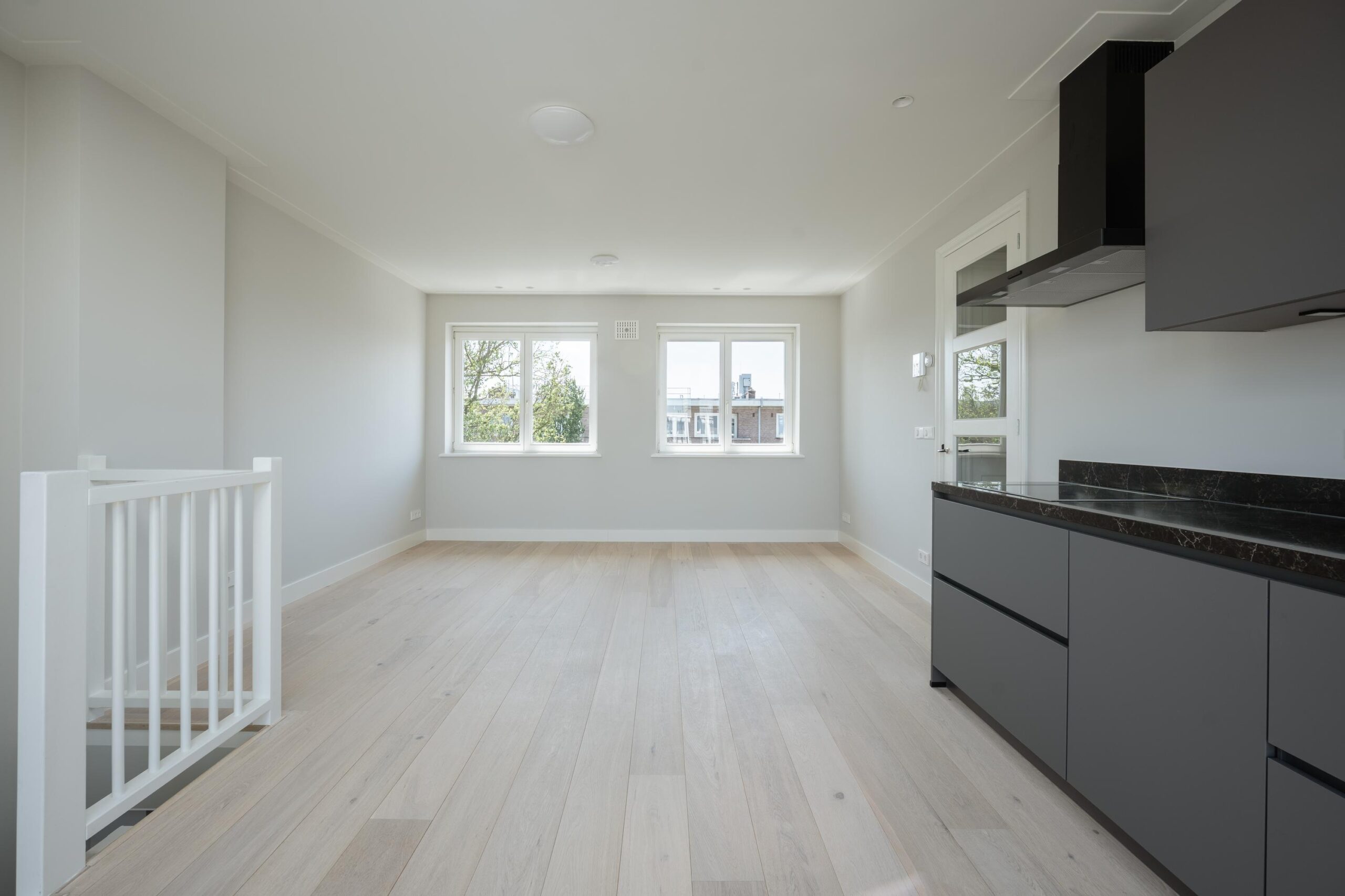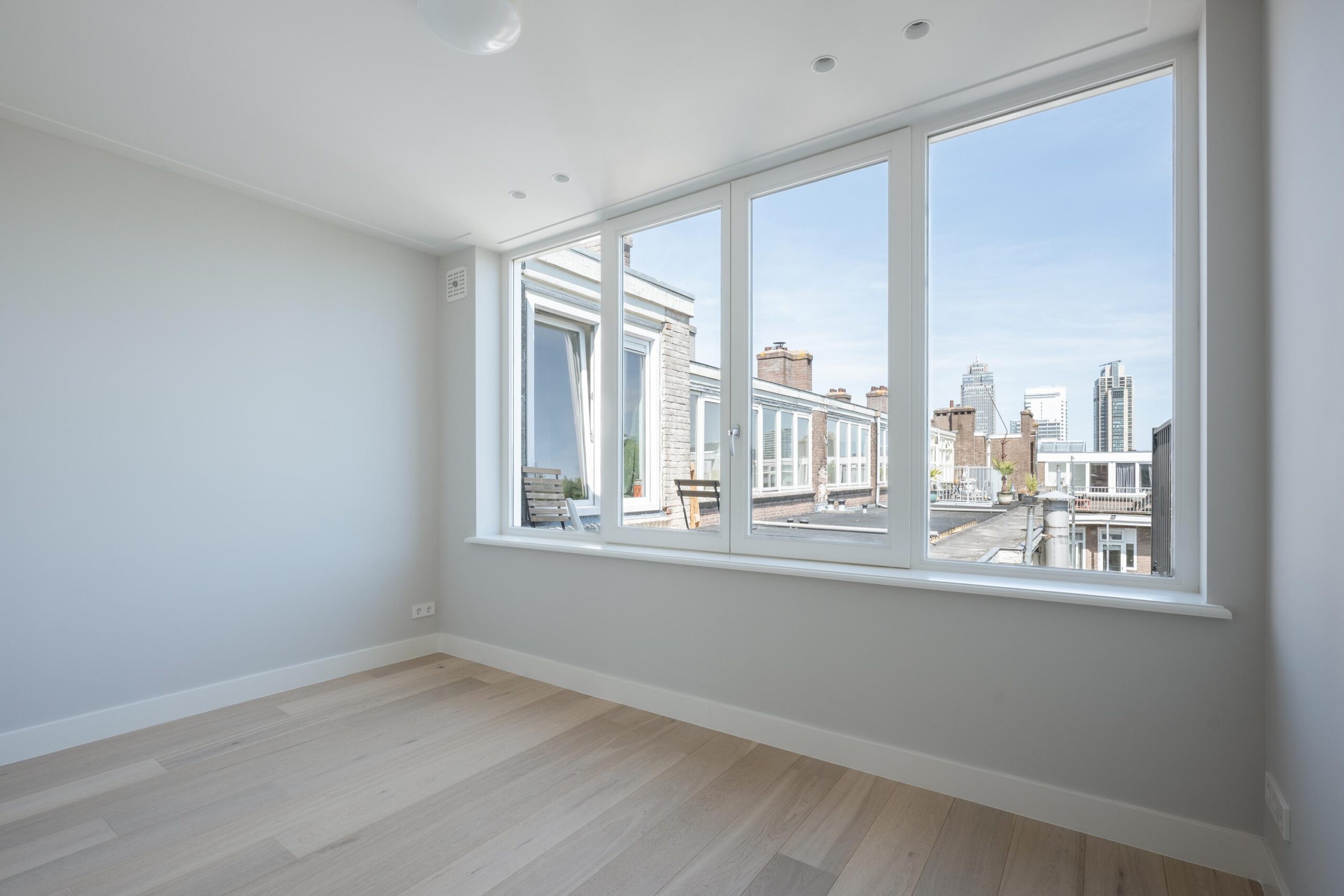 Bright through-living room with open kitchen. The kitchen is fitted with a 4-burner induction hob, extractor hood, dishwasher, fridge with freezer compartment, and a combination oven/microwave (all Siemens). French doors open onto the roof terrace of approx. 15 m², which includes lighting, electrical outlets, and a water connection. The central heating system (Intergas HRE, built in 2024) and washing machine connection are concealed in a cupboard accessible from the living room.