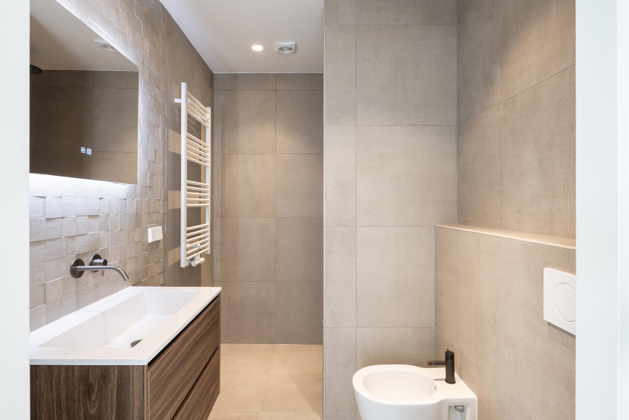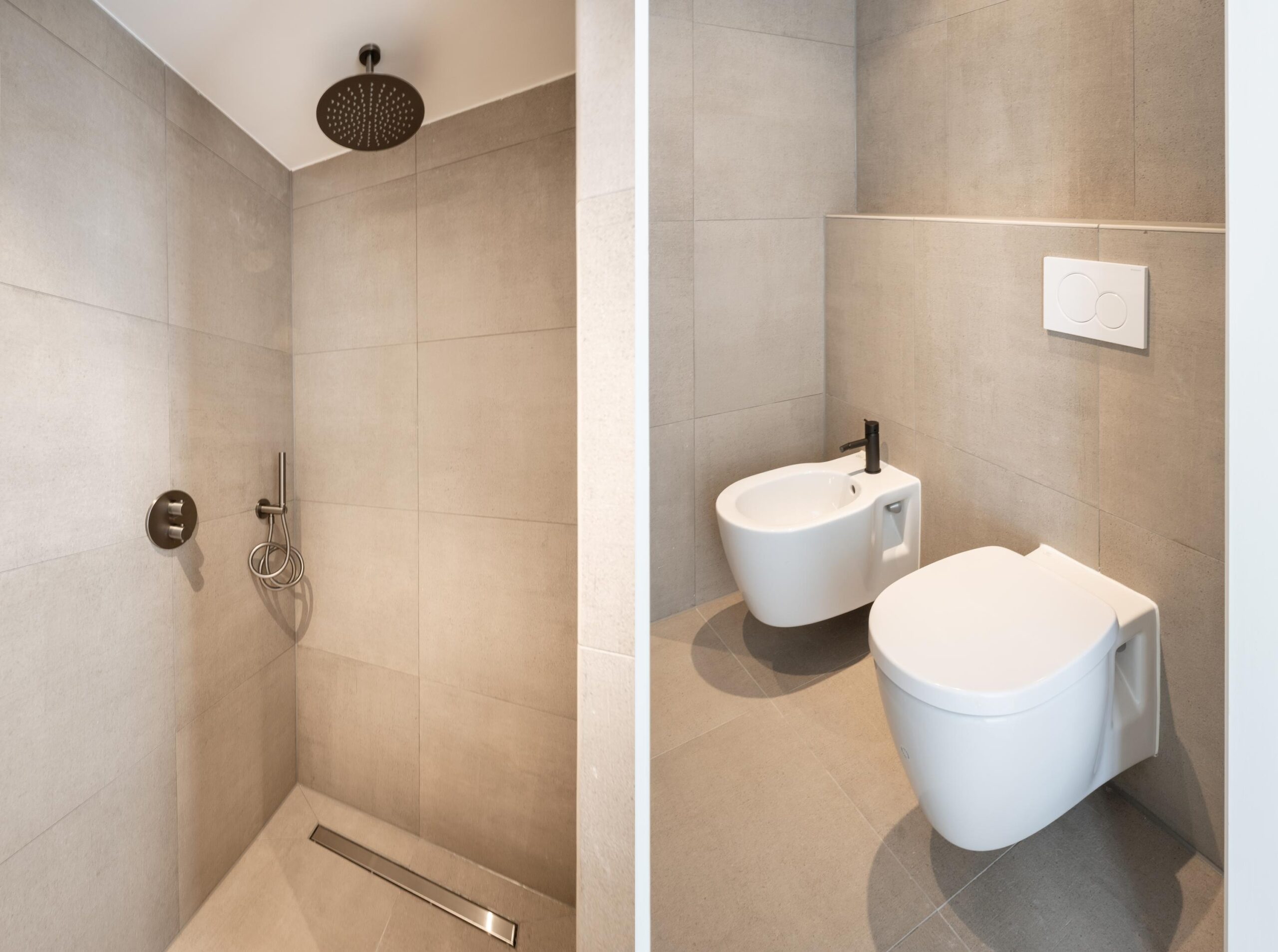 The front bedroom provides access to a small balcony. The second bedroom is located at the rear. The bathroom is situated between the two rooms and is equipped with a washbasin with illuminated and heated mirror, toilet, bidet, and a spacious walk-in shower with ceiling rain shower and hand shower.