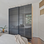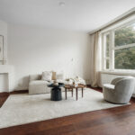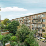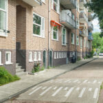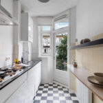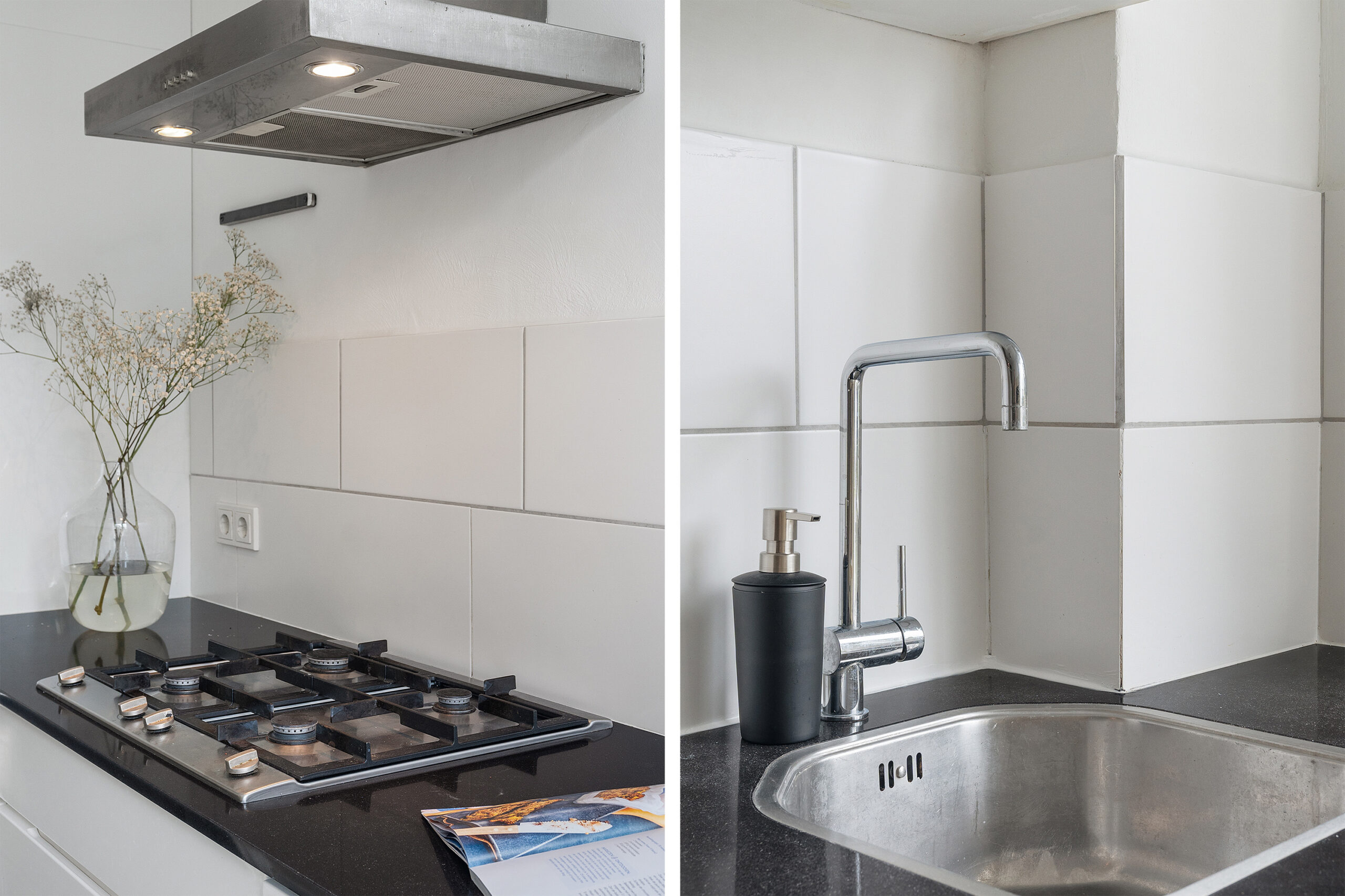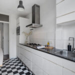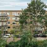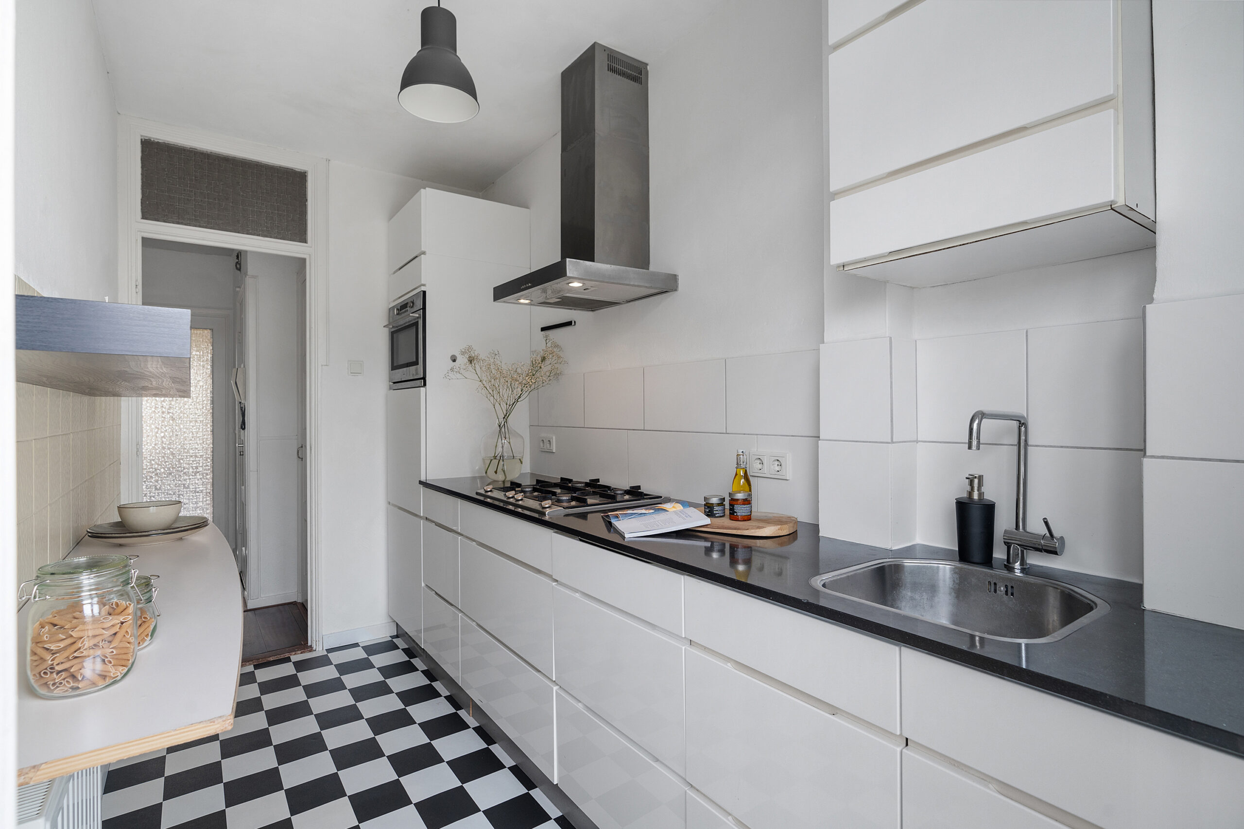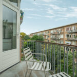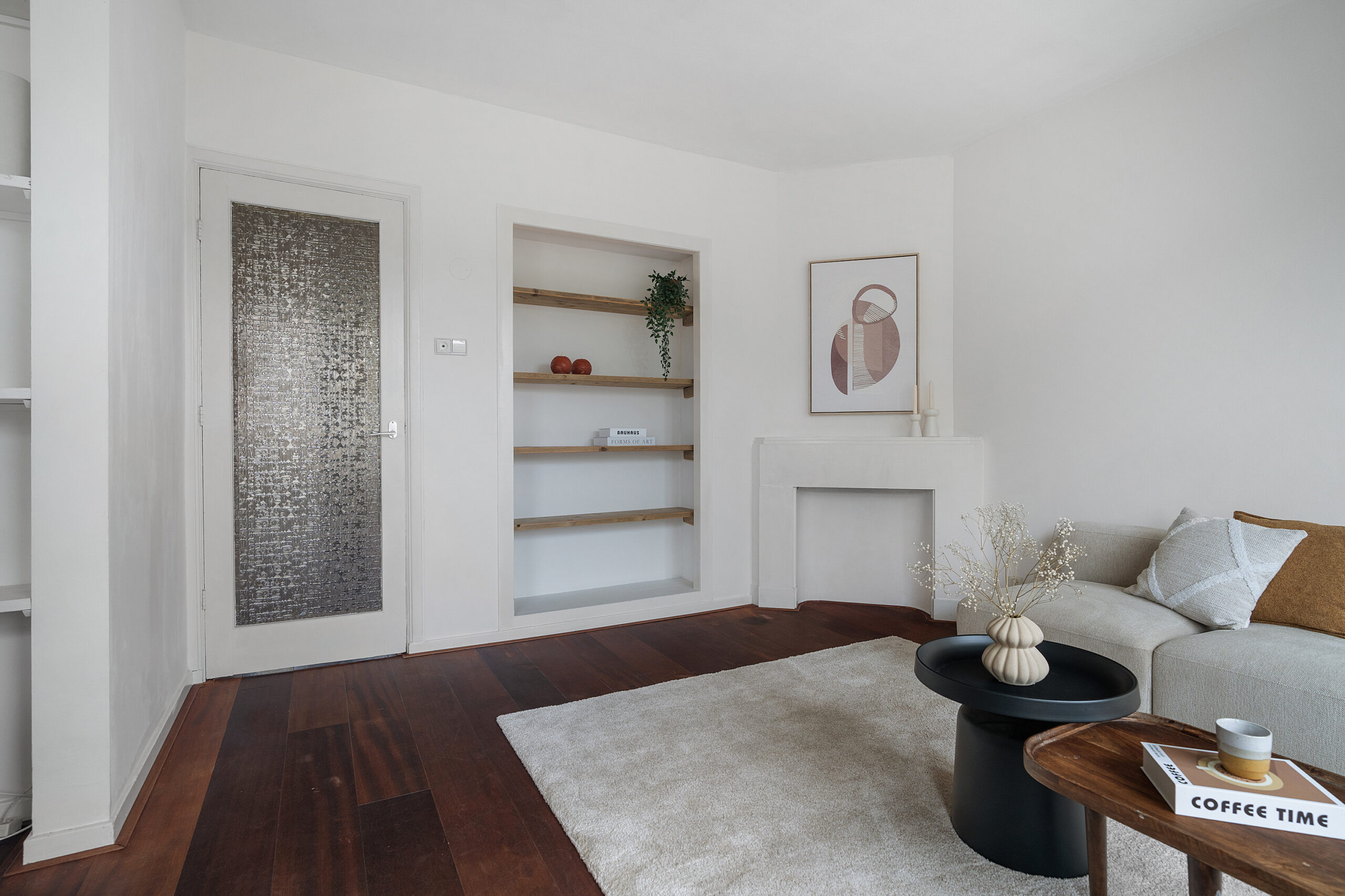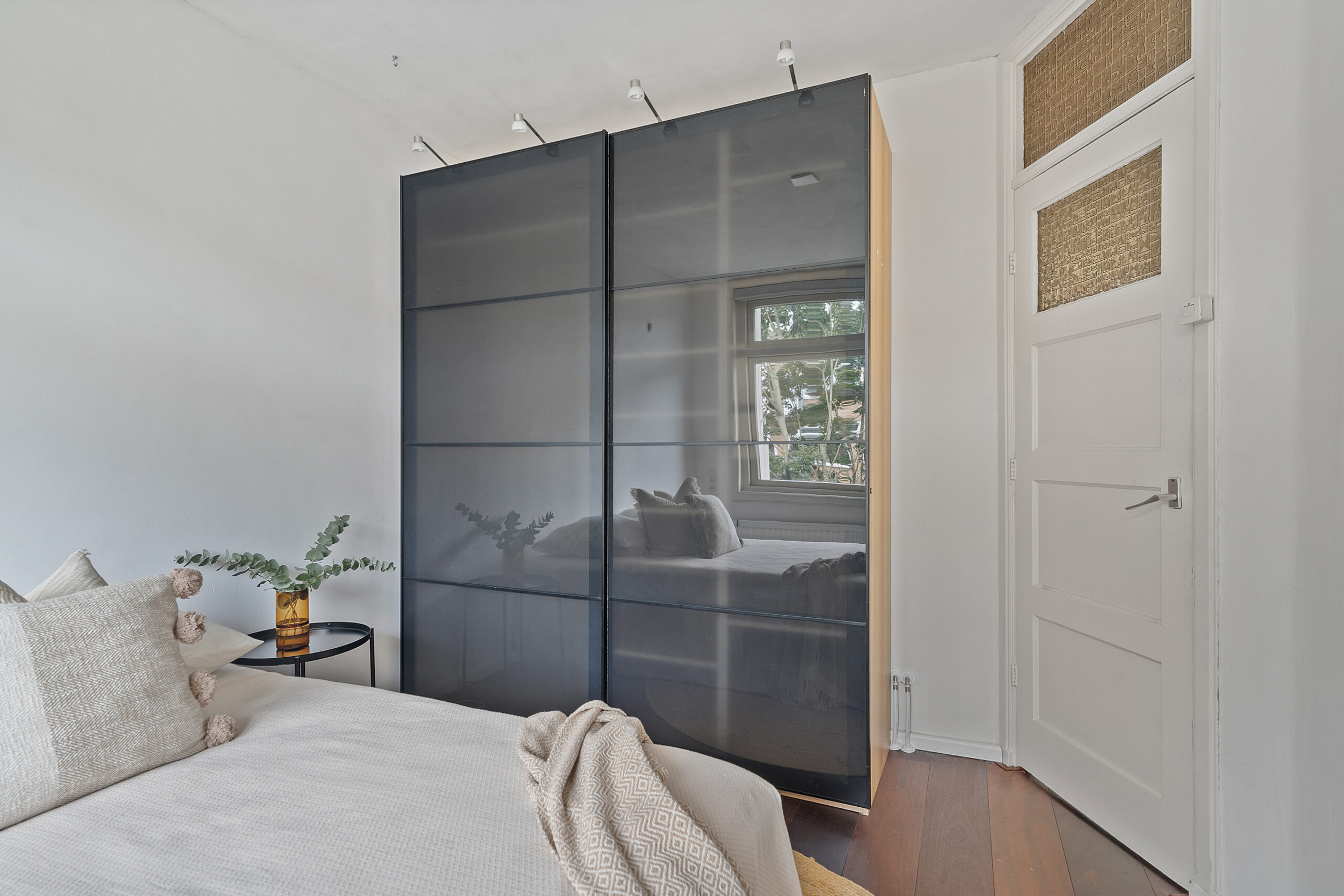 The bright living room at the front gives access to the west-facing balcony and offers the possibility to create a second bedroom. In the center of the home is the bathroom with bathtub and toilet. At the rear, you’ll find the neat kitchen with various built-in appliances and access to the east-facing balcony, as well as the spacious bedroom with a large wardrobe. The apartment features a beautiful Jatoba hardwood floor. On the ground floor, there is a private storage unit. Energy label C and the ground lease has been bought off in perpetuity.