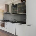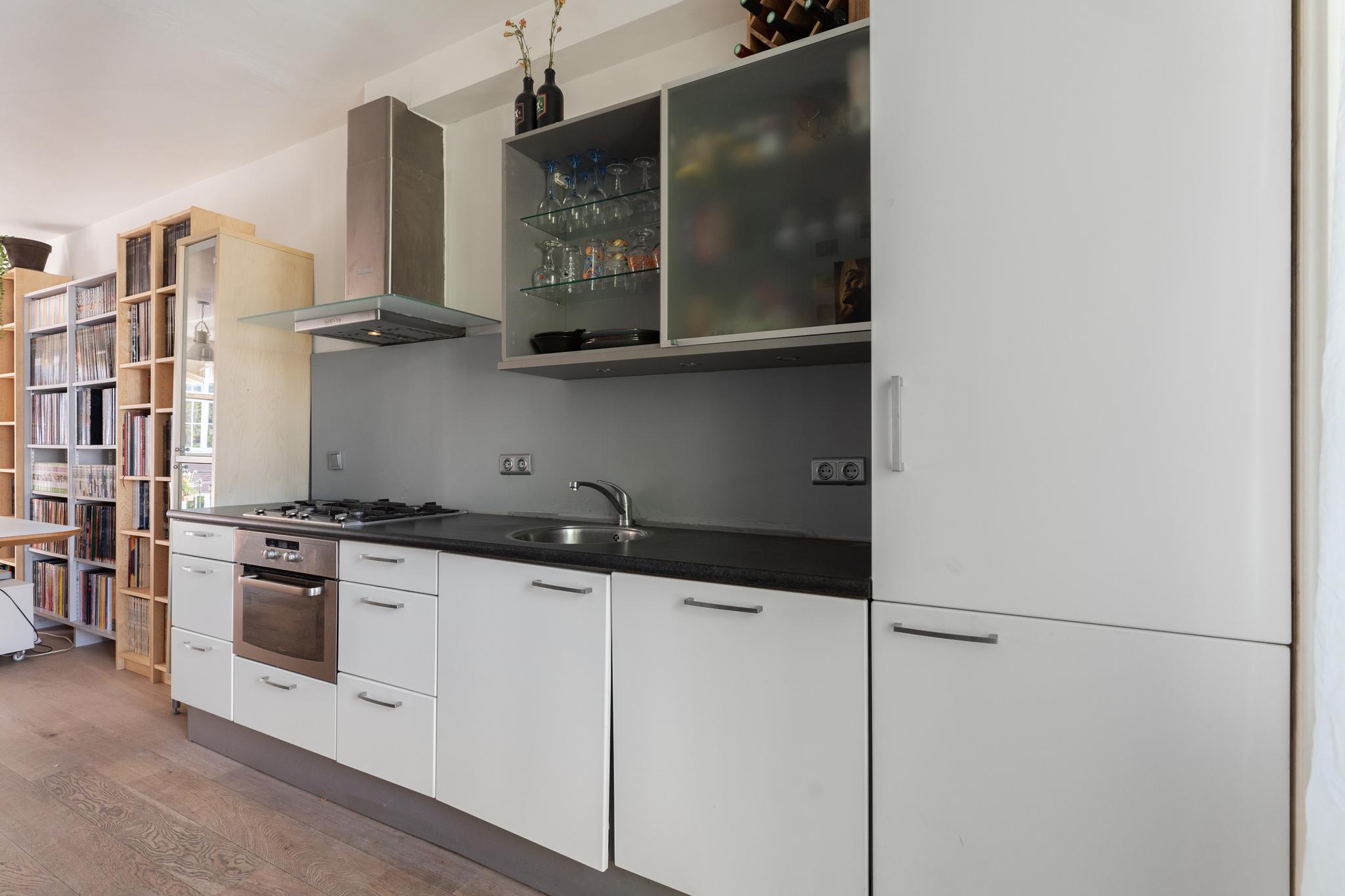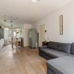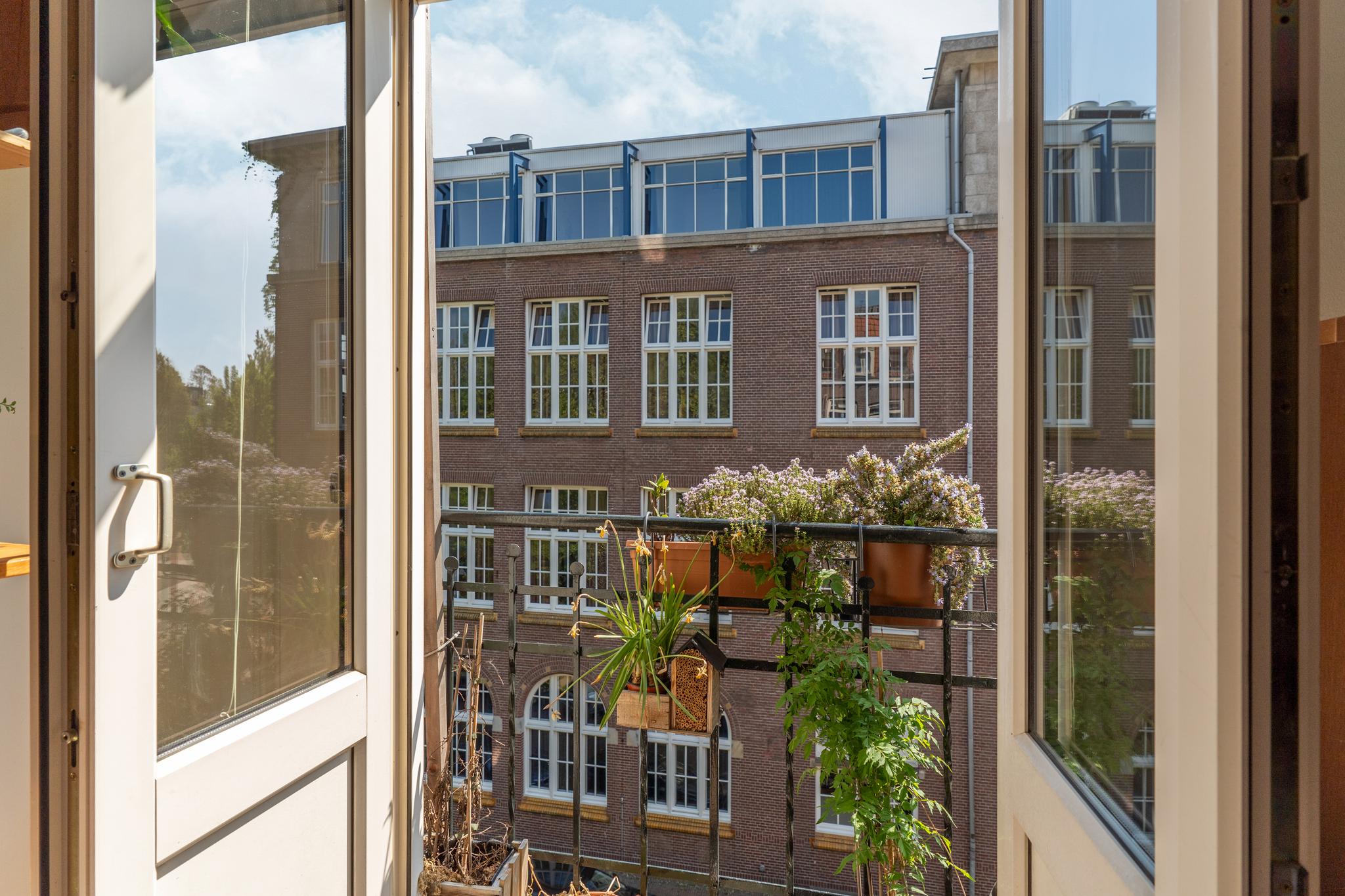 Private entrance. At the front of the apartment, you’ll find the bright living room with open kitchen and double French doors opening onto a French balcony with unobstructed views over Timorplein.