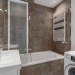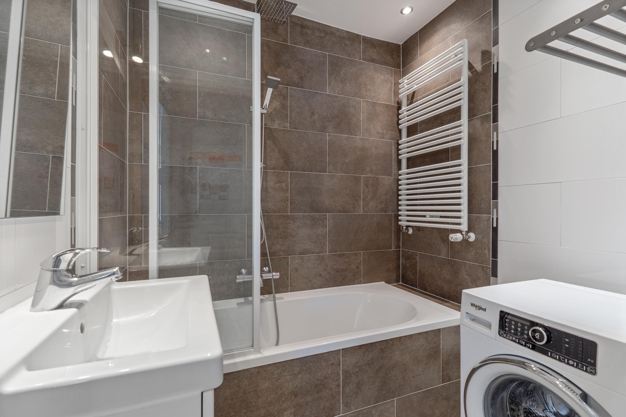 The spacious bathroom features a bathtub, rain shower, designer radiator, modern vanity unit, and a washing machine connection. The toilet is separate.