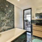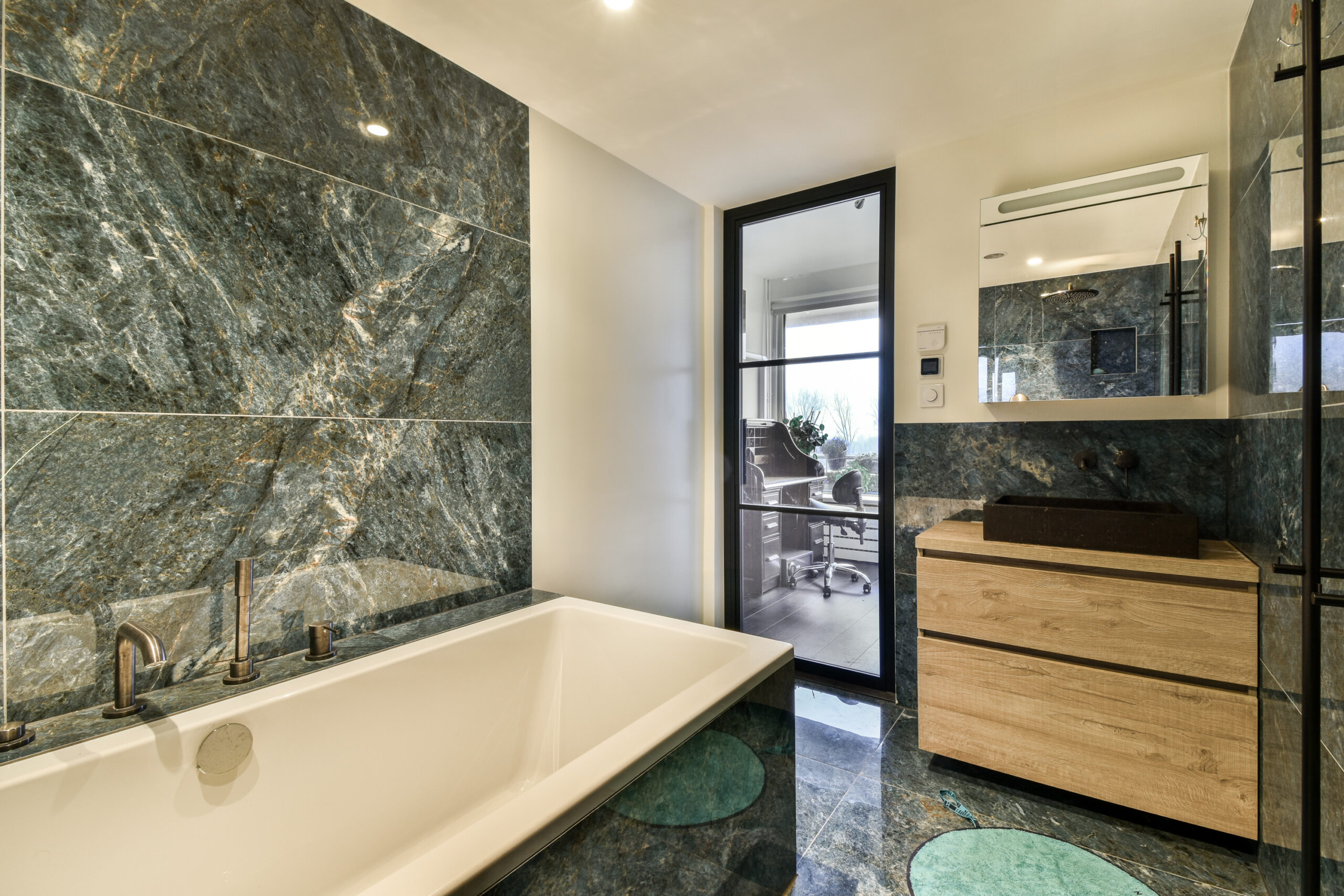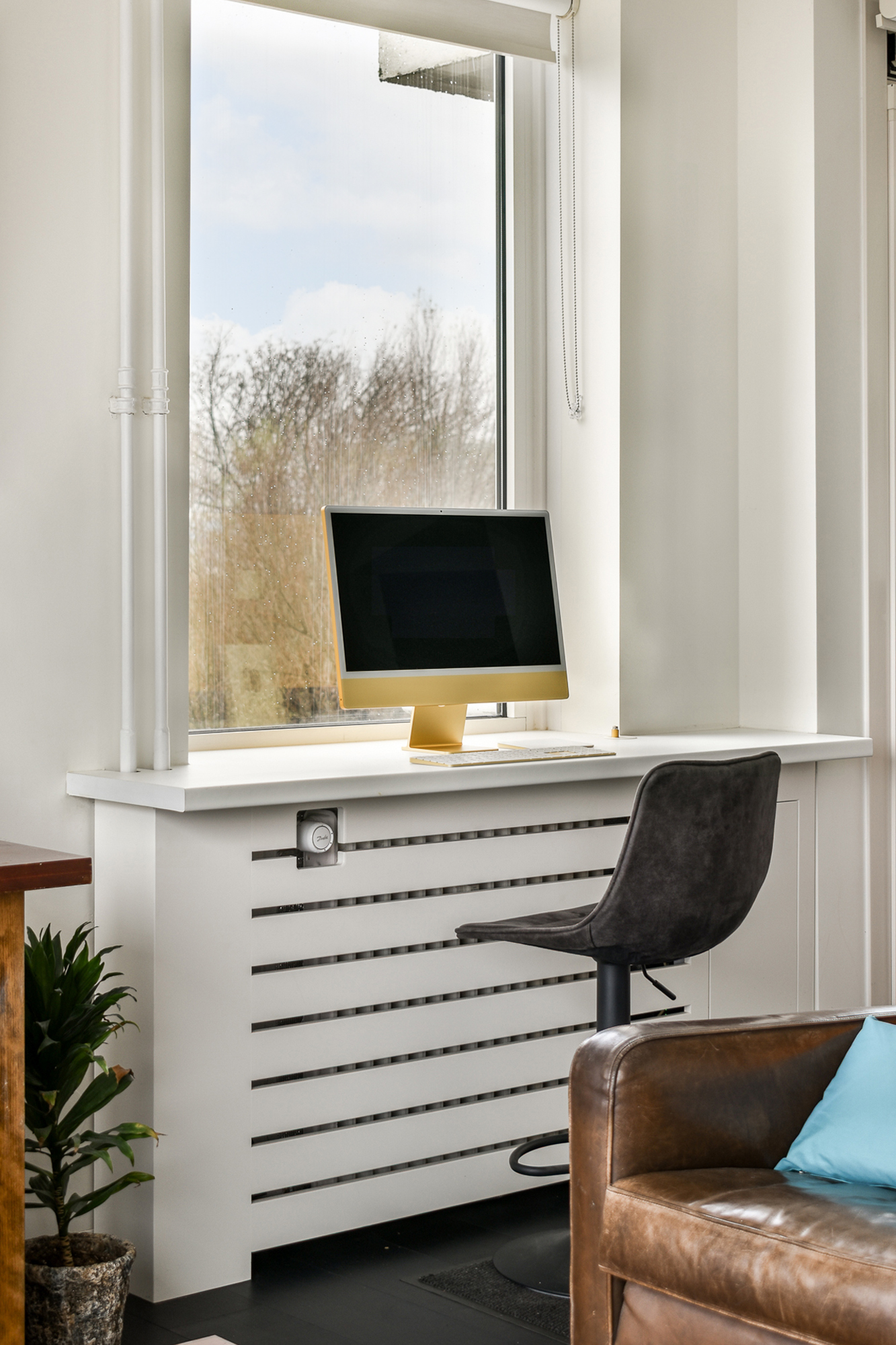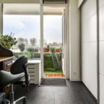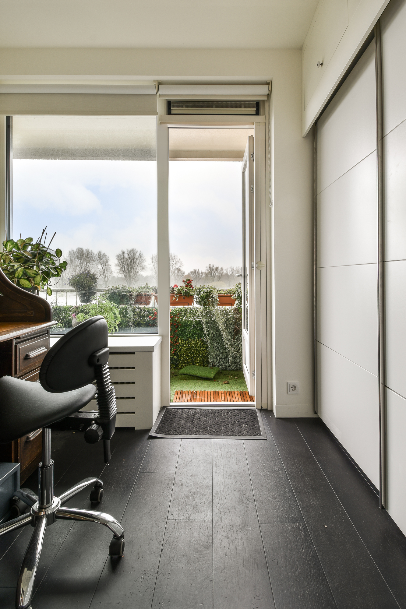 From the living room, you can access the study, the bedroom, and the bathroom. The bedroom is a pleasant and quiet space to retreat to. The study is ideal for working from home or other daily activities and is equipped with a built-in wardrobe and a separate laundry cabinet. This room also features air conditioning with a heating function. From the study, you can access the second balcony, located on the south side, where you can fully enjoy the sun and the beautiful view. The bathroom, also from 2023, includes a shower, a bathtub, a washbasin, and a mirrored cabinet. The toilet is separate.