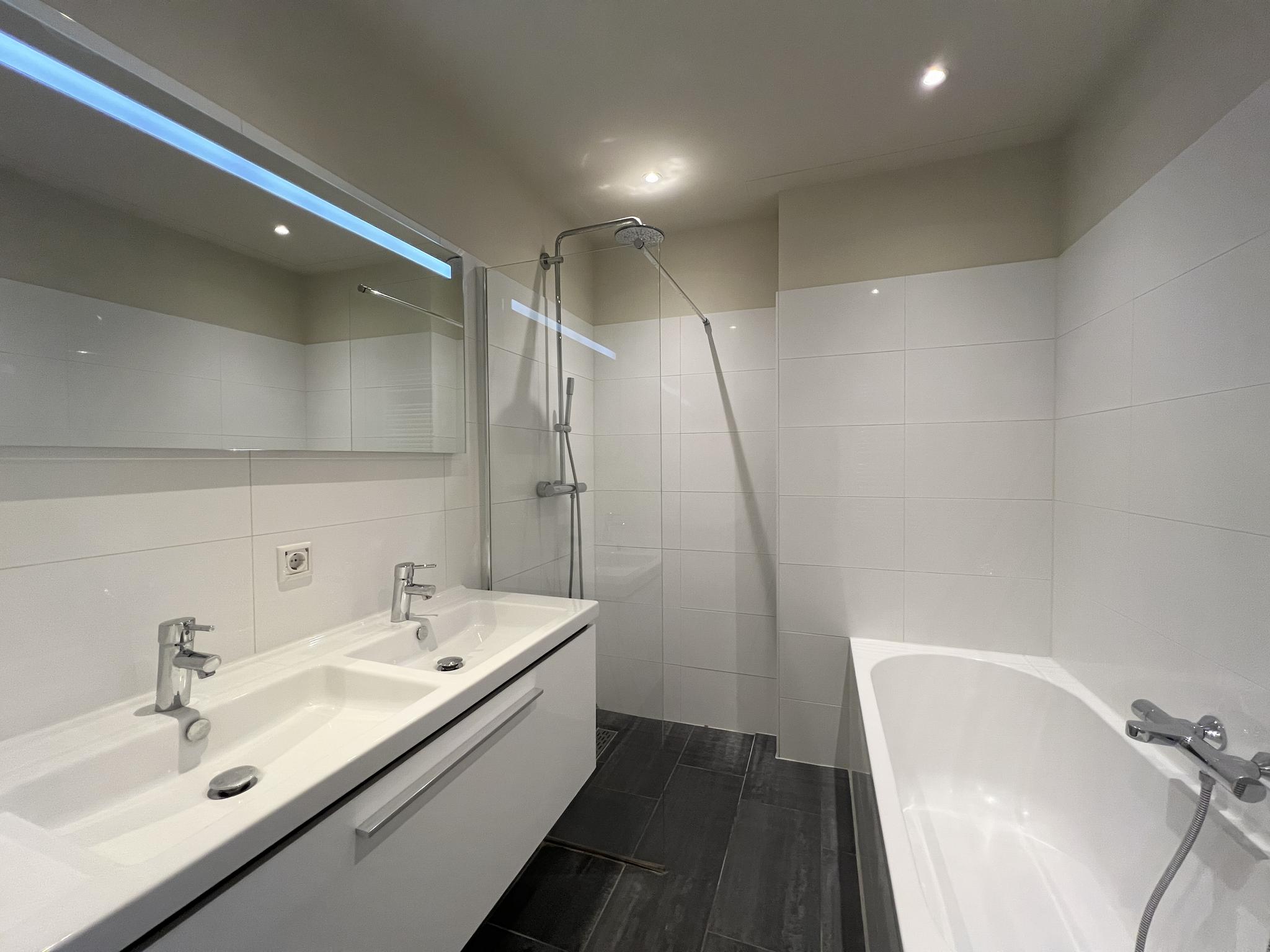 Entrance to the apartment on the third floor. Central hall provides access to all rooms. Living room with open kitchen located at the front. From the living room you have a view of the square in front. The luxurious kitchen is equipped with a dishwasher, a fridge/freezer combination, a 5-burner gas stove, a combination oven/microwave, a stainless steel extractor hood and a natural stone worktop. The spacious and modern bathroom has a washbasin with 2 mixer taps, a bath with hand shower and a walk-in shower. The (floating) toilet is separate. The