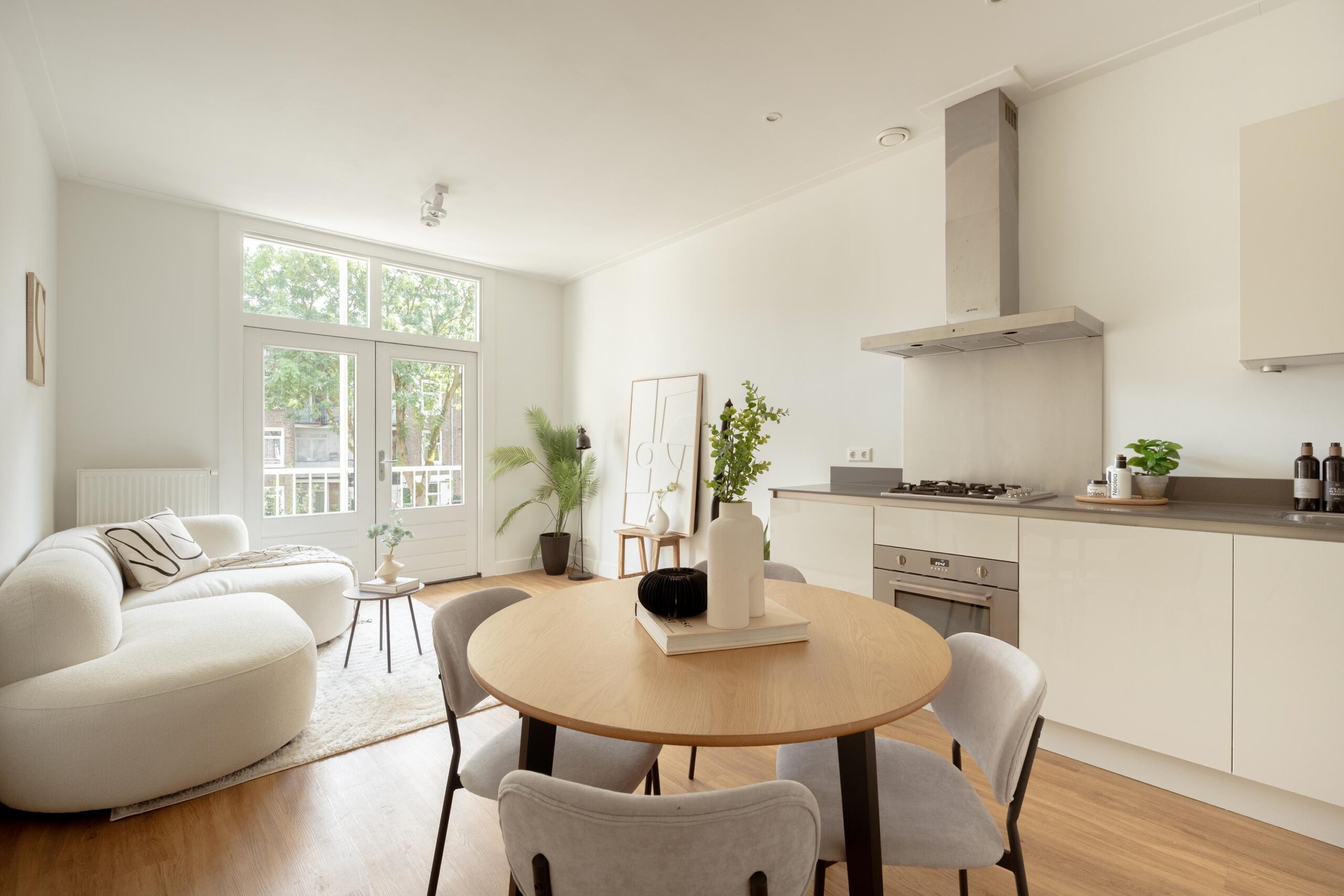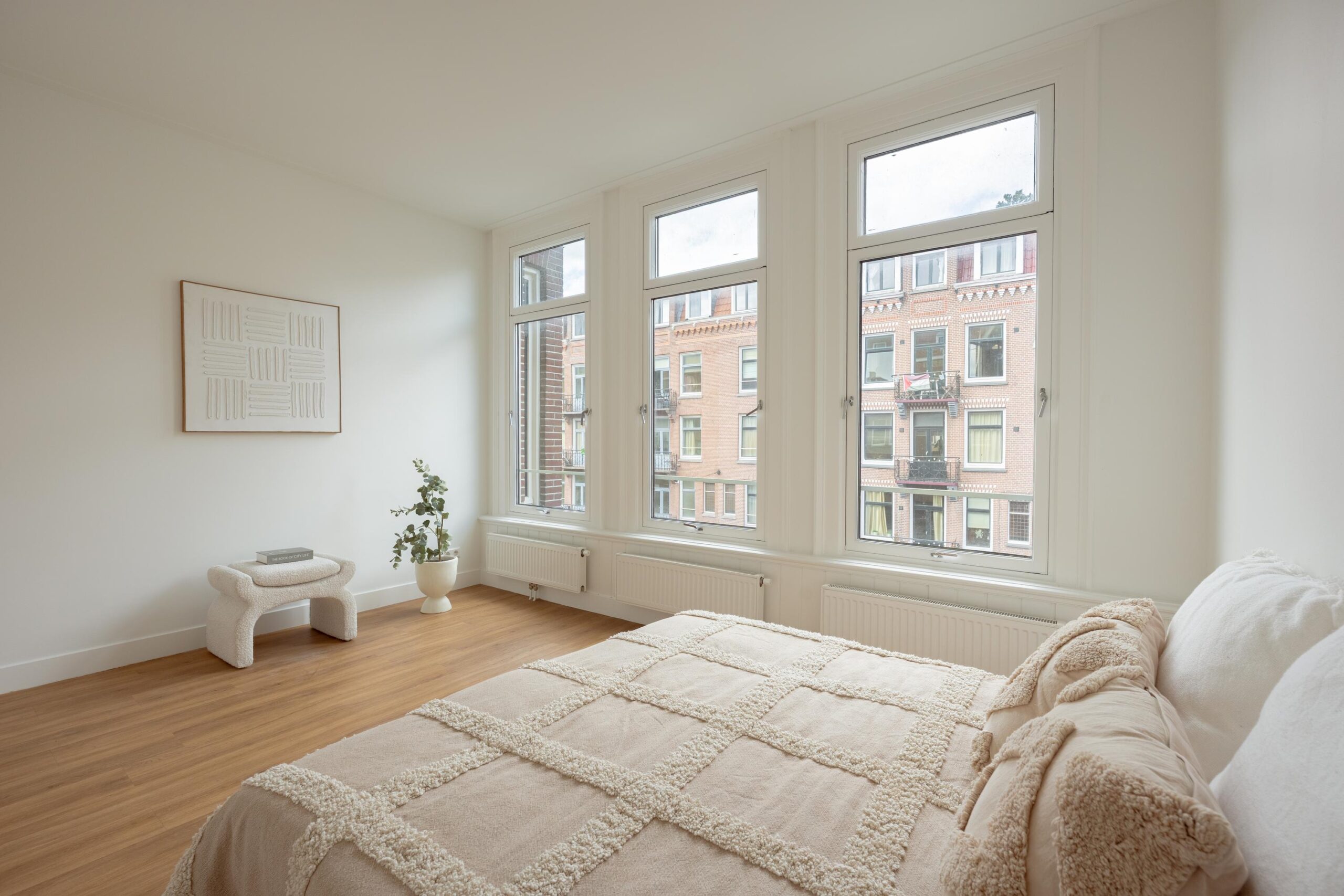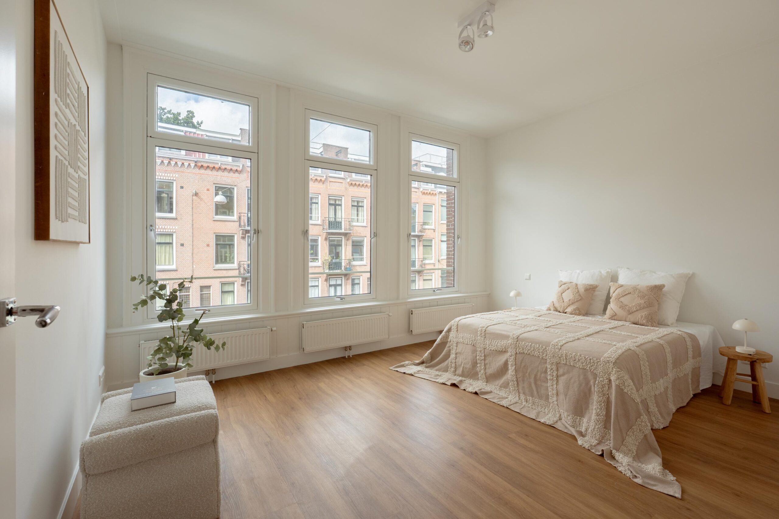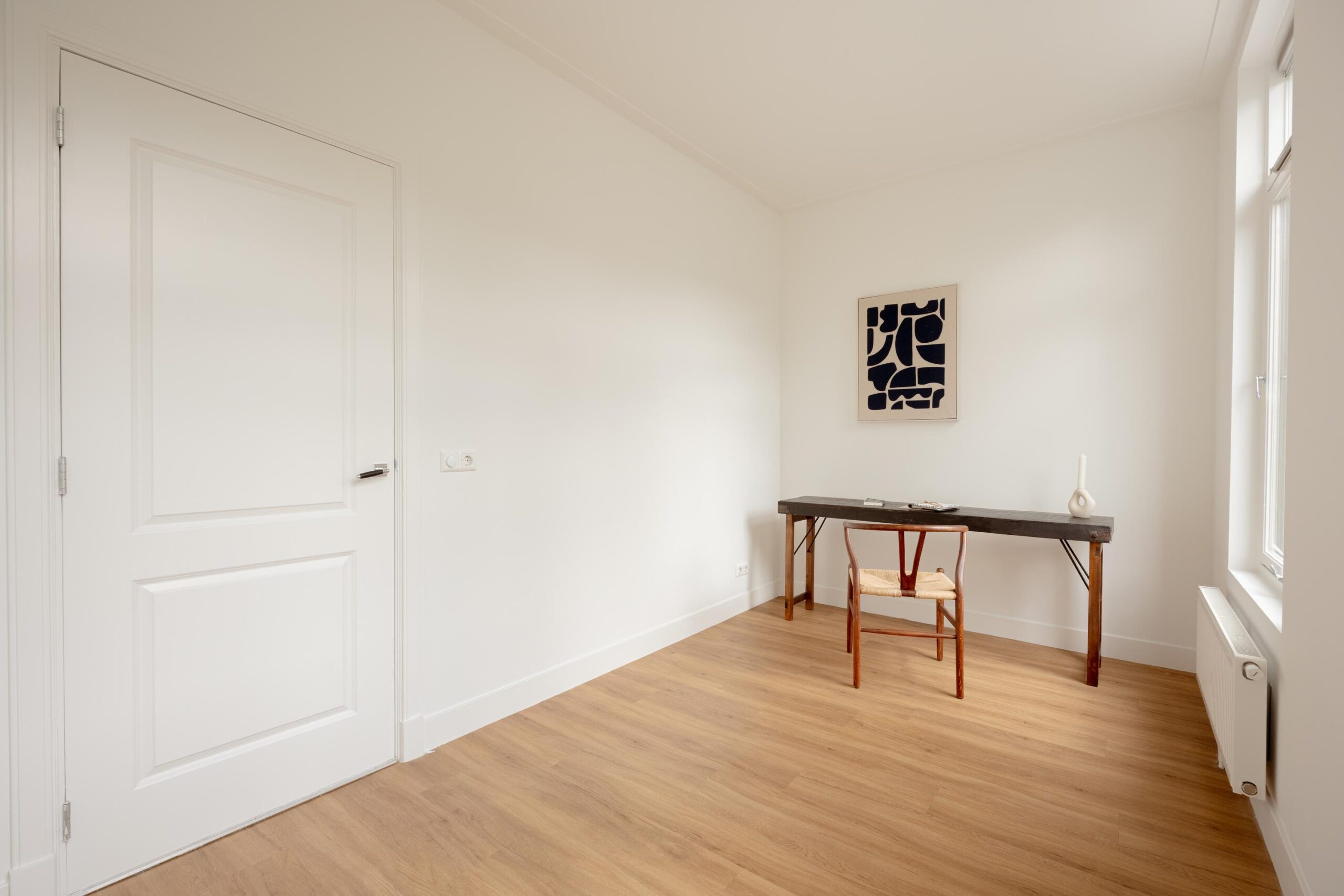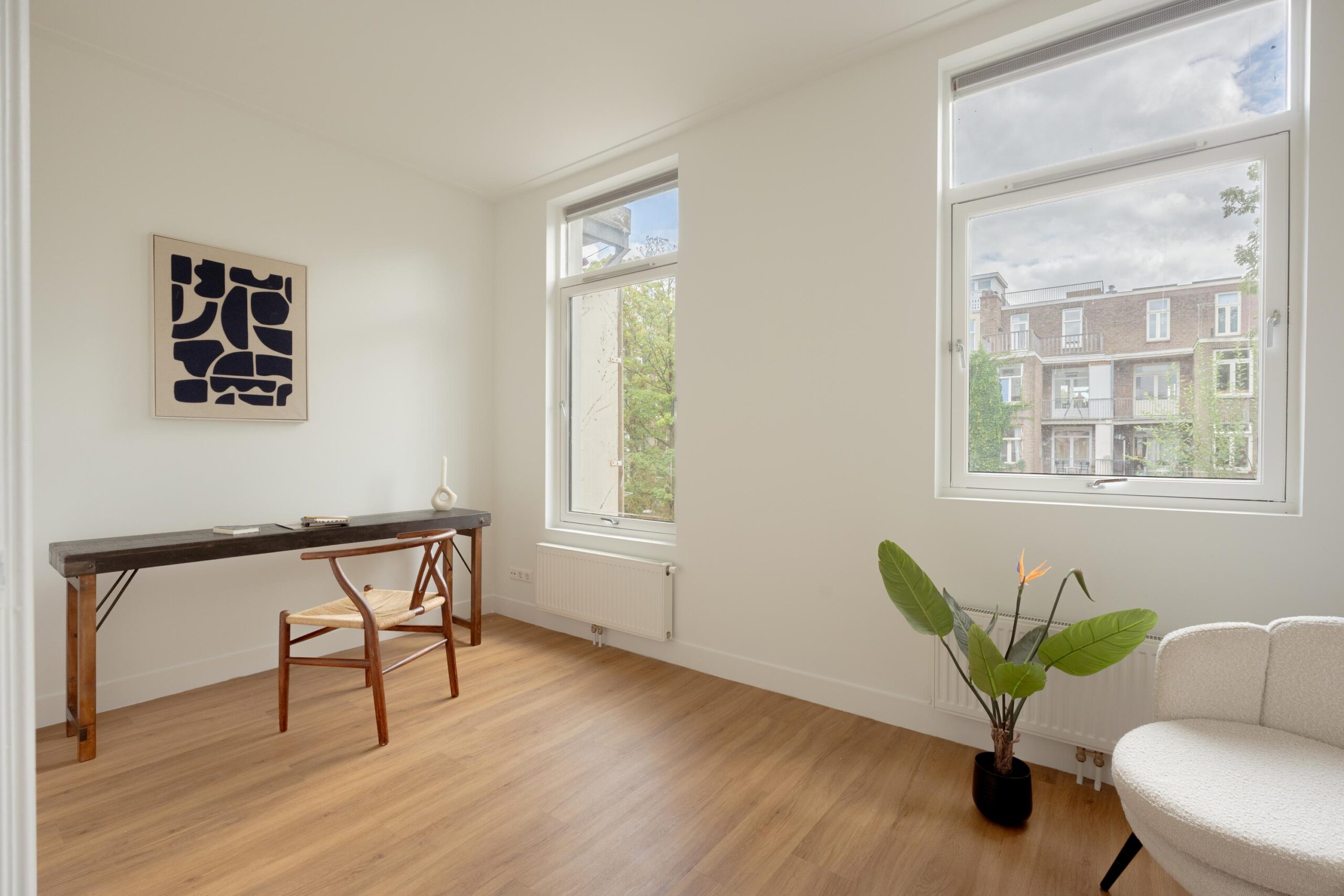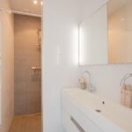 Central hallway, separate toilet, and boiler room (Intergas HRE, built in 2015). Bright living room at the rear with open-plan kitchen and access to a sunny south-facing balcony. The kitchen is equipped with a 4-burner gas hob, dishwasher, oven, and fridge/freezer combination. The washing machine connection is neatly concealed in a separate cabinet accessible from the kitchen. Also located at the rear is one bedroom. The other two bedrooms are situated at the front of the apartment. The bathroom, accessible from the hallway, features a vanity unit with two mixer taps, a walk-in shower, and several recessed ceiling spotlights.