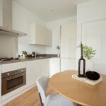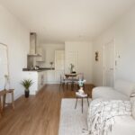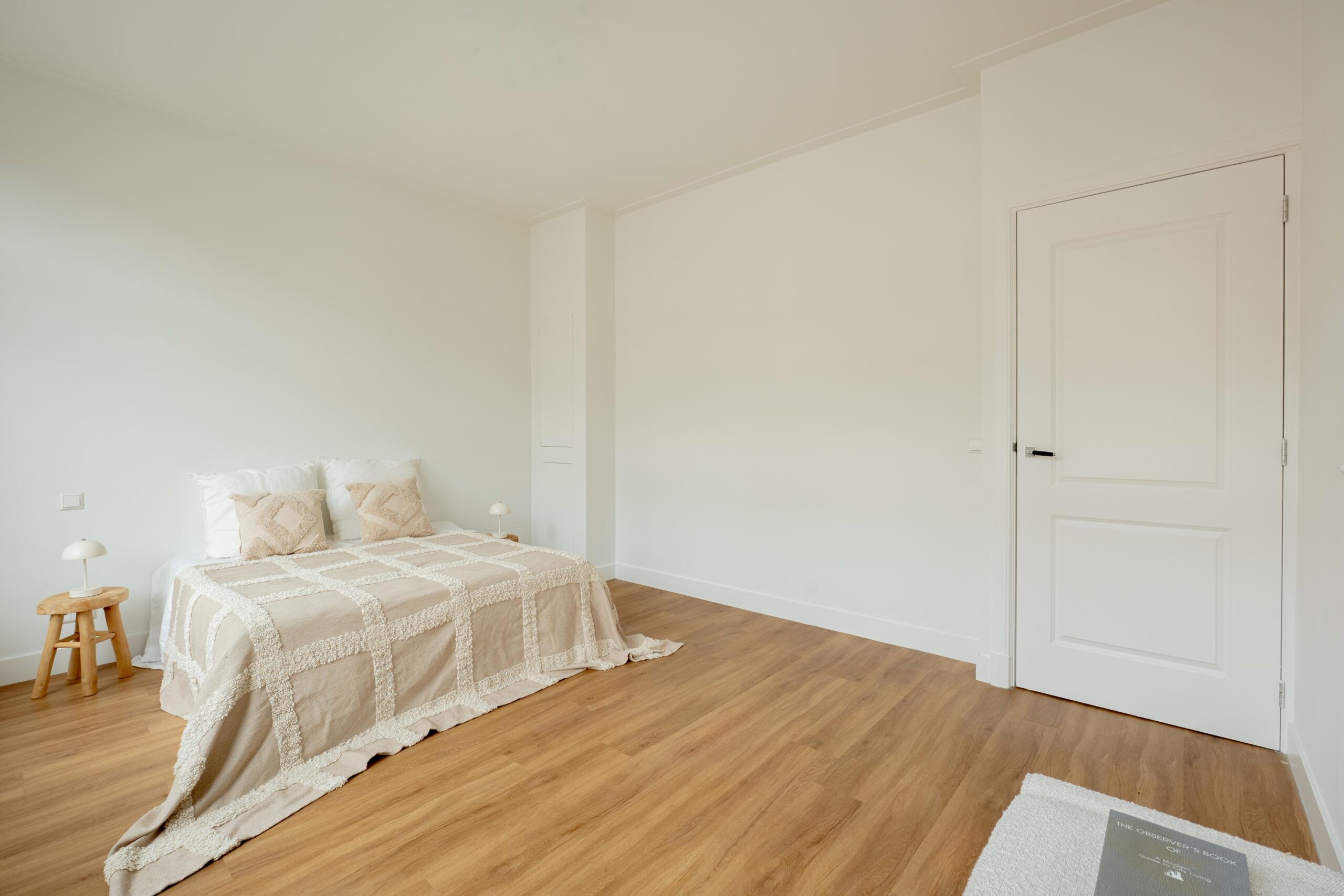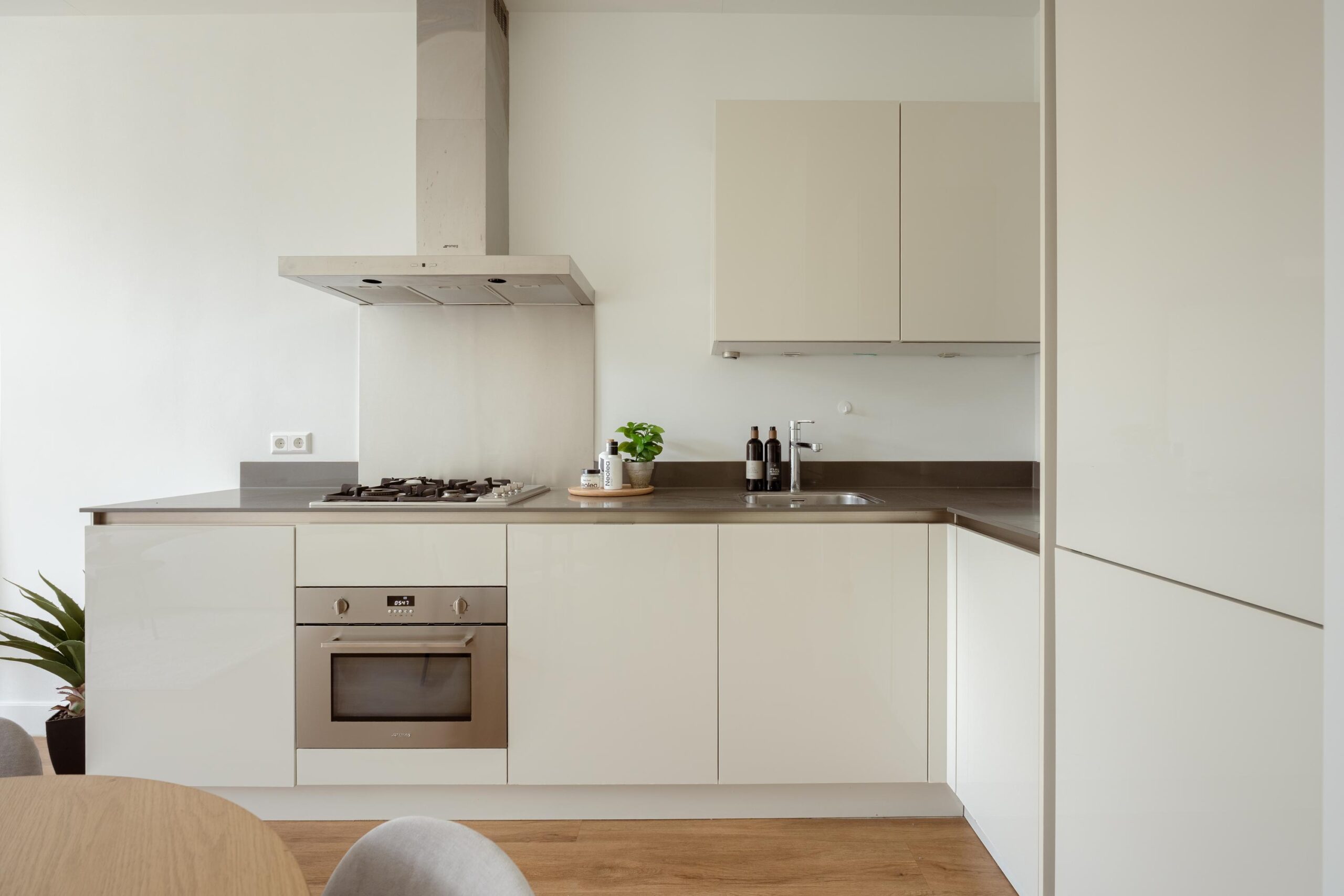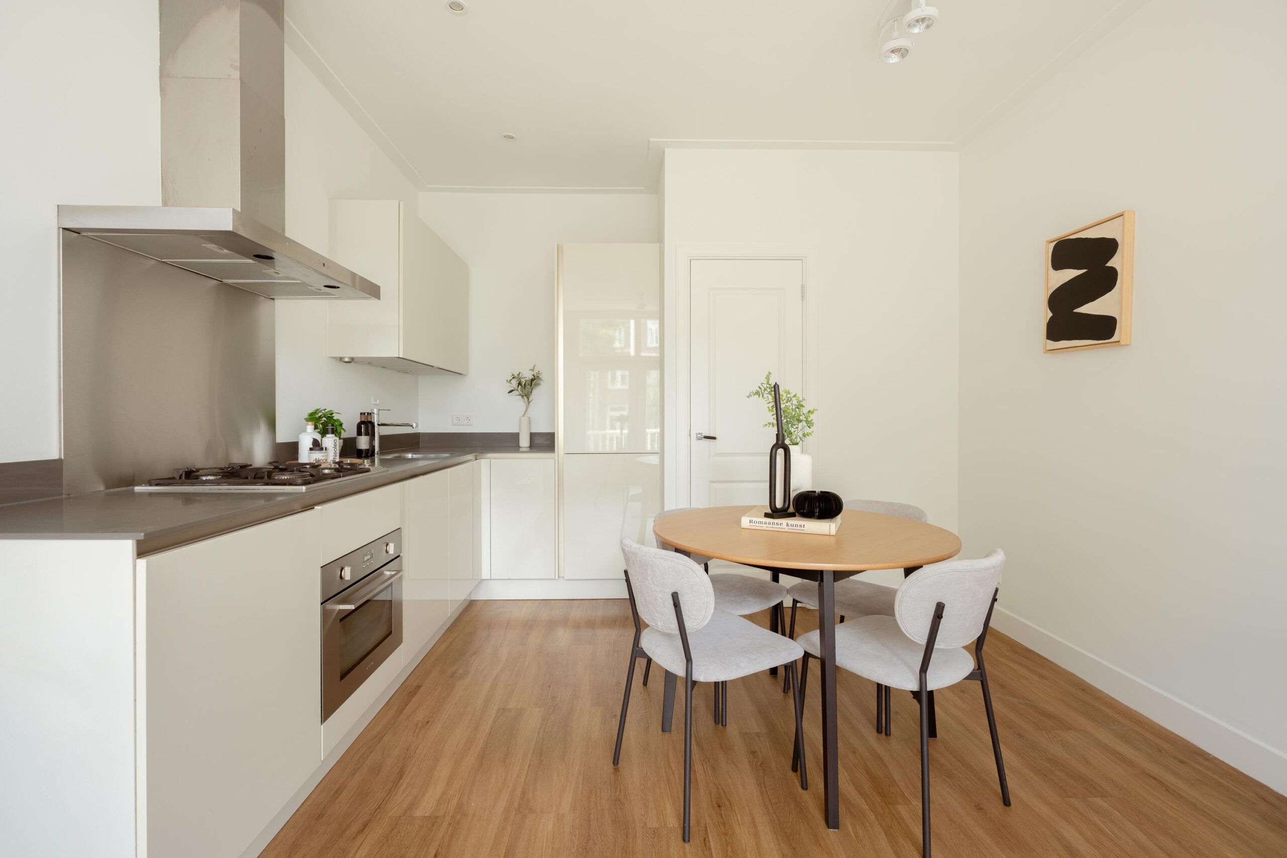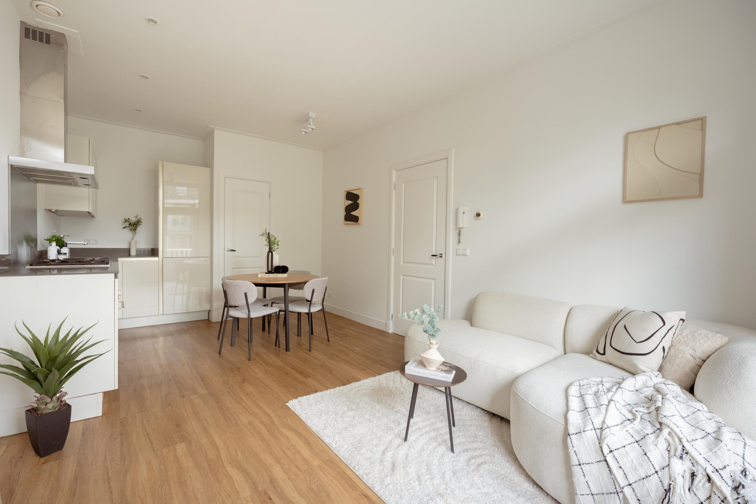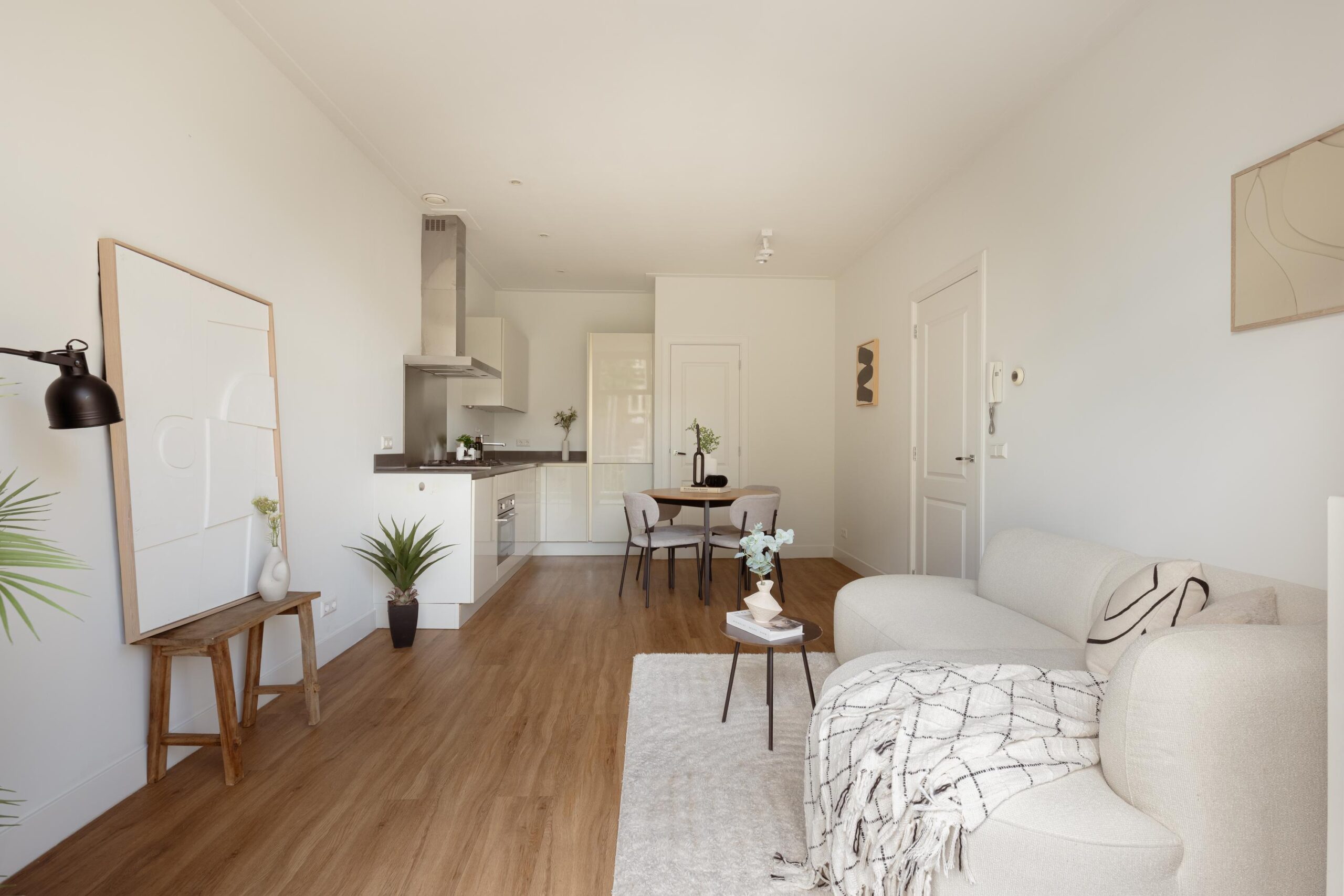 Central hallway, separate toilet, and boiler room (Intergas HRE, built in 2015). Bright living room at the rear with open-plan kitchen and access to a sunny south-facing balcony. The kitchen is equipped with a 4-burner gas hob, dishwasher, oven, and fridge/freezer combination. The washing machine connection is neatly concealed in a separate cabinet accessible from the kitchen. Also located at the rear is one bedroom. The other two bedrooms are situated at the front of the apartment. The bathroom, accessible from the hallway, features a vanity unit with two mixer taps, a walk-in shower, and several recessed ceiling spotlights.