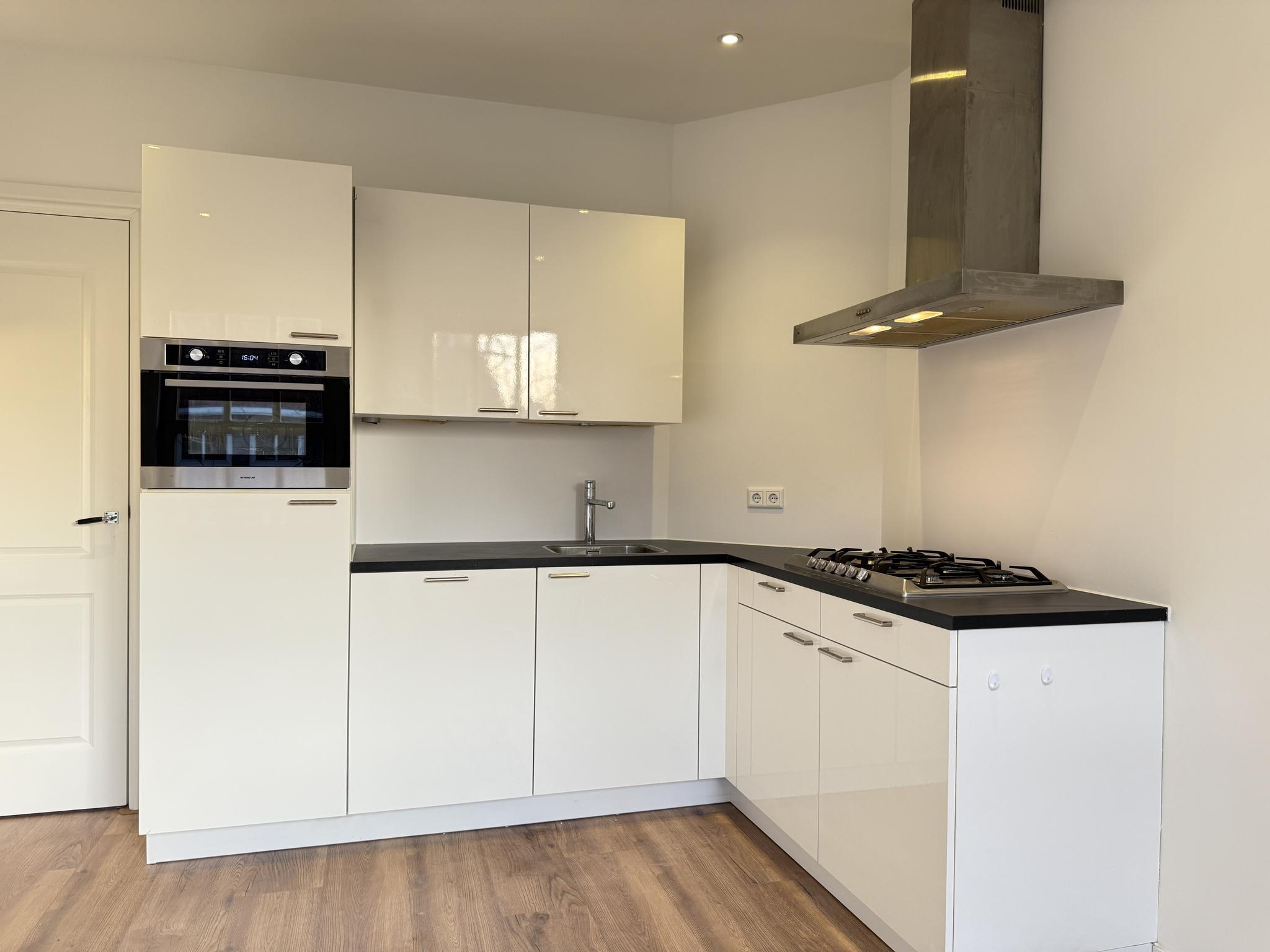 De woonkamer ligt aan de voorzijde van de woning. De open keuken heeft een hoekopstelling en is voorzien van diverse inbouwapparatuur, te weten een vaatwasser, 4-pits gas fornuis, afzuigkap, magnetron en een koelkast met vriesvak.