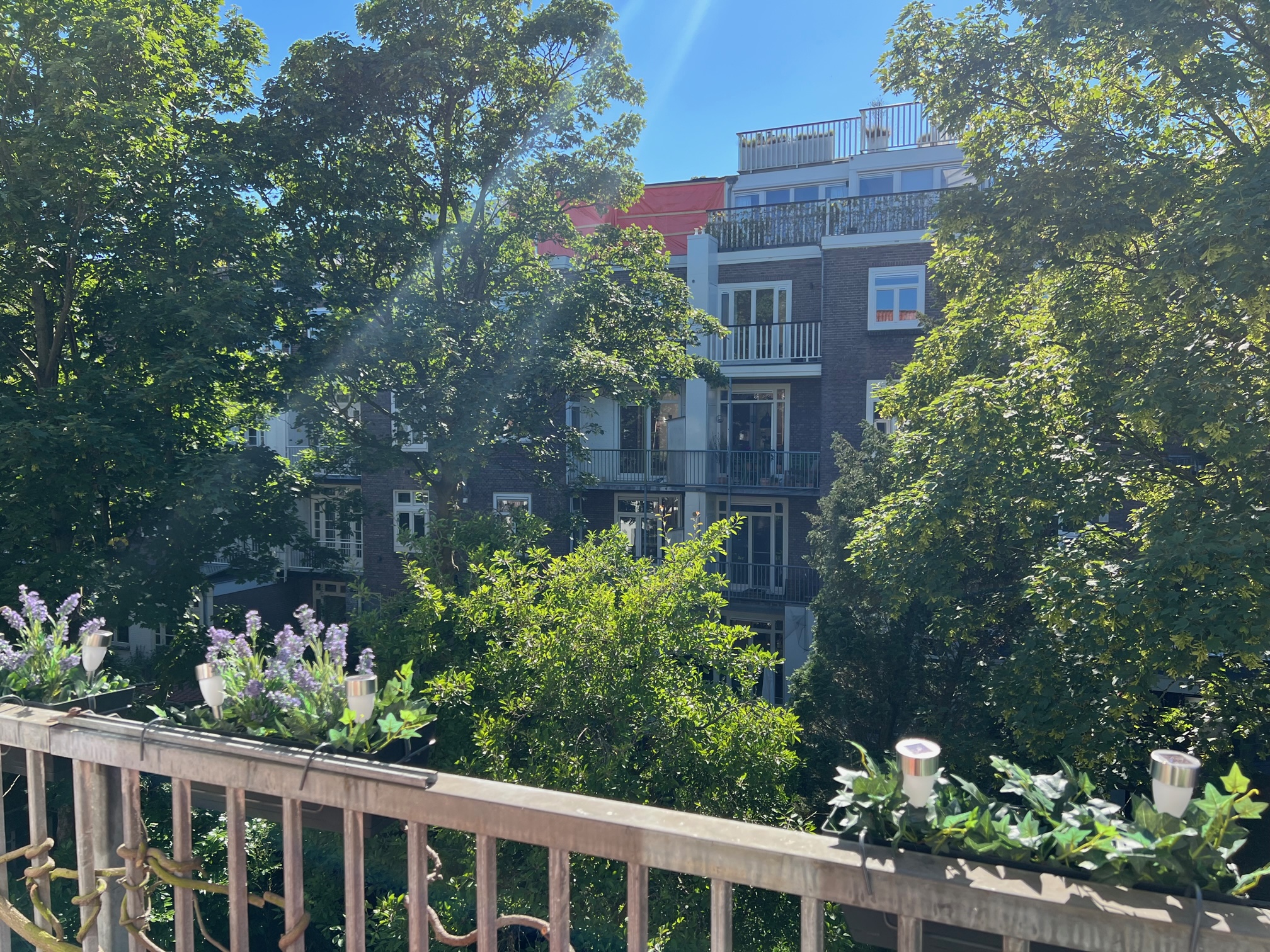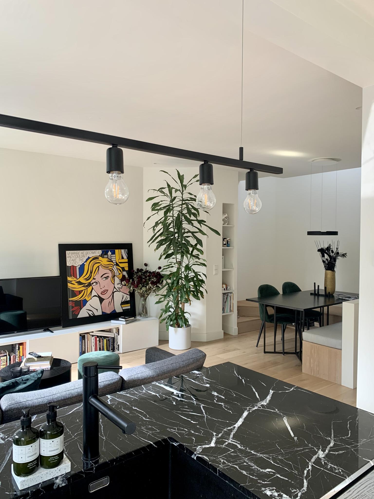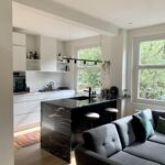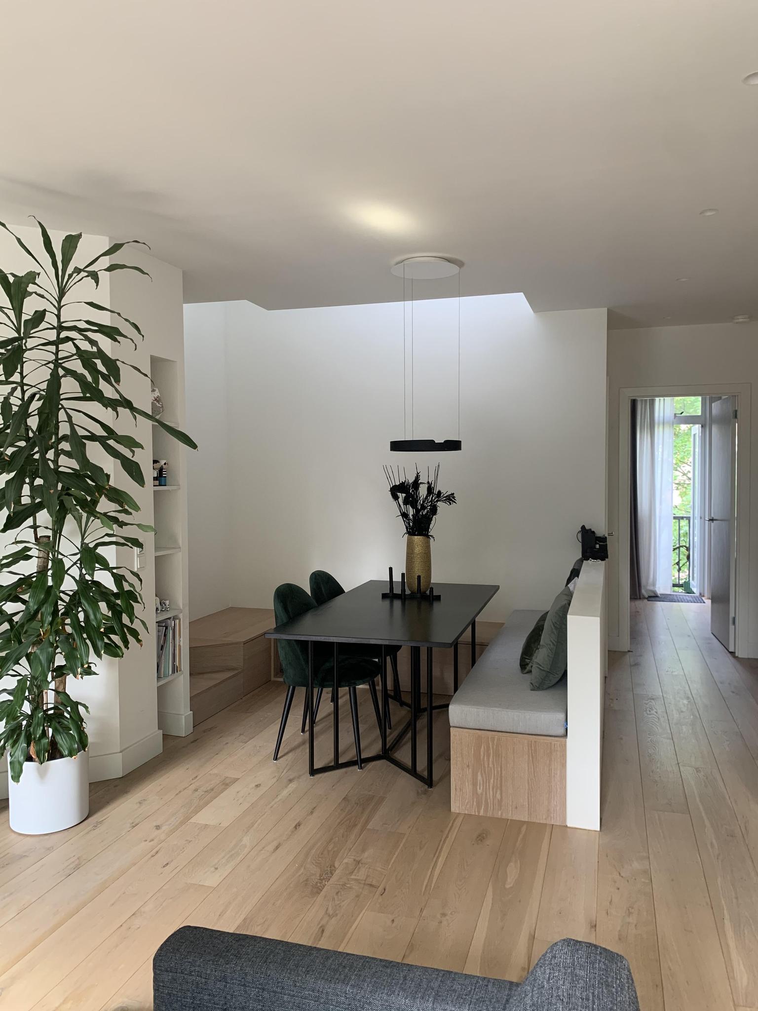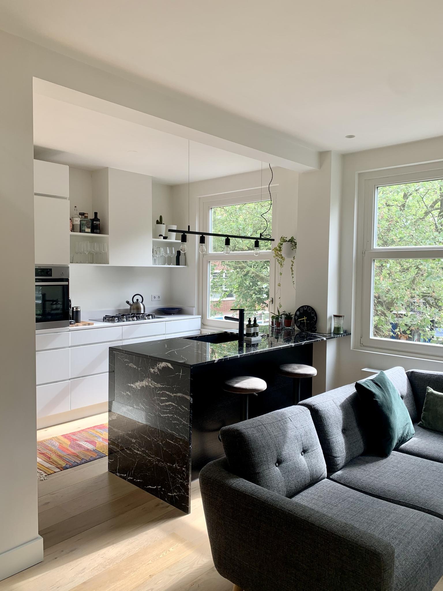 You reach the entrance of the house on the second floor via the communal staircase. The bright living room with open kitchen is located at the front. The modern kitchen is equipped with a dishwasher, a fridge/freezer combination, a 5-burner gas stove, a combi oven/microwave, a stainless steel extractor hood and a luxurious natural stone worktop. The bathroom is centrally located in the house, as is the separate toilet. The bathroom is equipped with a bath, rain shower with hand shower function and a sink with storage drawers.