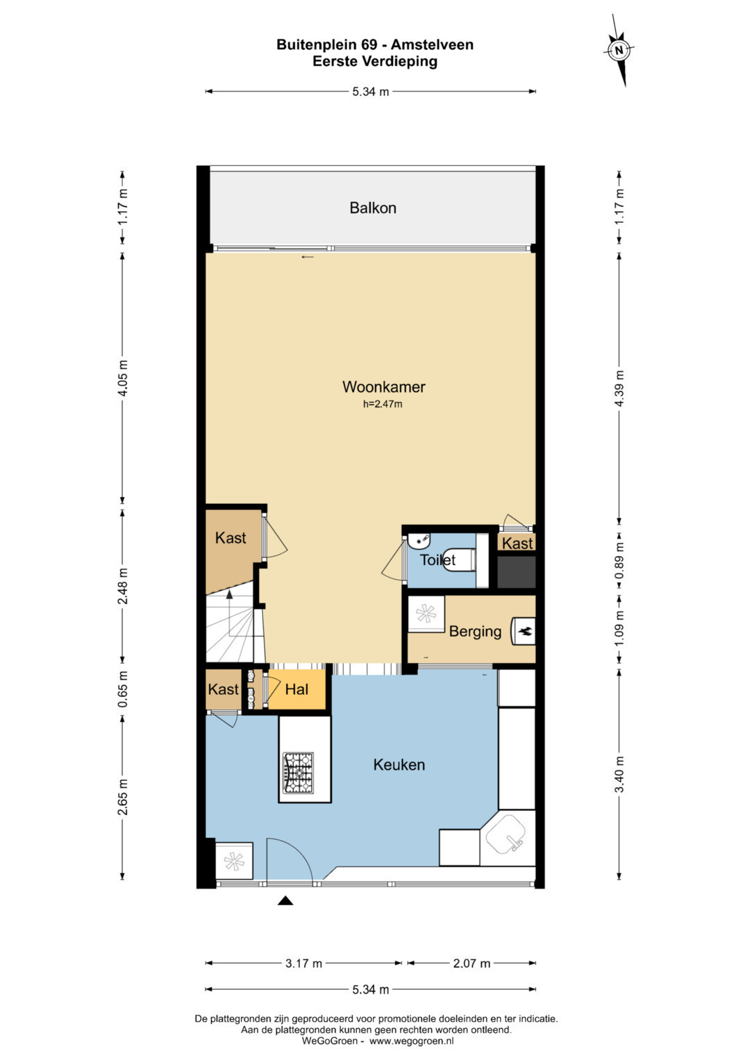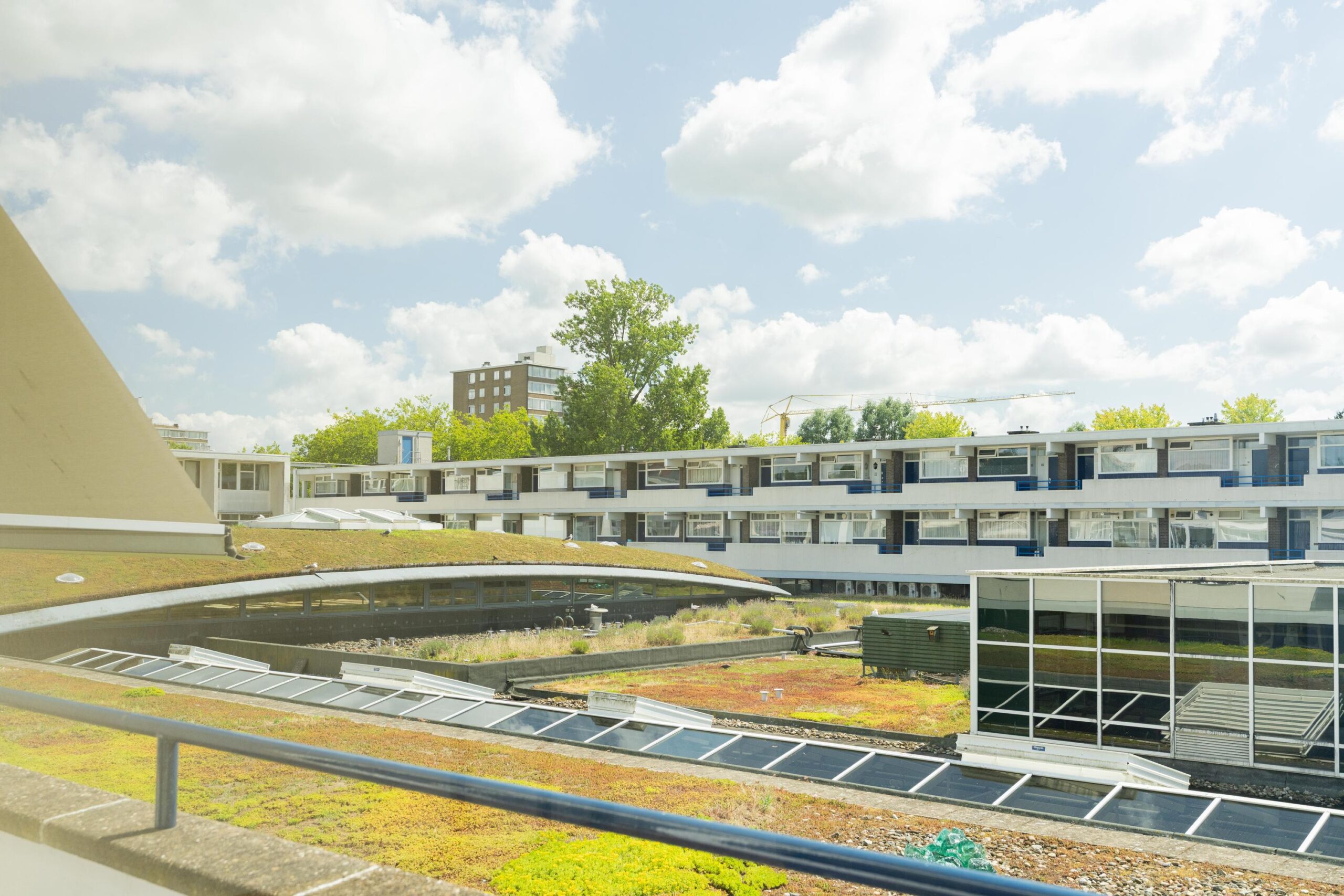 (Woon)keuken met bijkeuken gelegen aan de voorzijde van de woning. In de bijkeuken is de CV-opstelling (Remeha Avanta bj. 2013) aanwezig. Toegang tot lichte woonkamer met aangrenzend zonnig balkon. Het balkon is over de volle breedte, gelegen op het zuiden en met uitzicht op de groene daktuin. Toilet is separaat en bereikbaar vanuit de woonkamer. Vaste trap v.v. trapkast geeft toegang tot de bovengelegen verdieping.